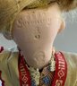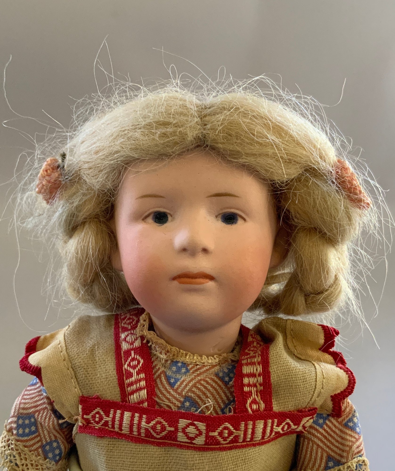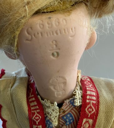 9” Bisque 3/0 6969 Heubach character girl, intaglio eyes, CM, blonde mohair wig, compo body, painted socks & shoes, tan/red apron (stains), flag dress