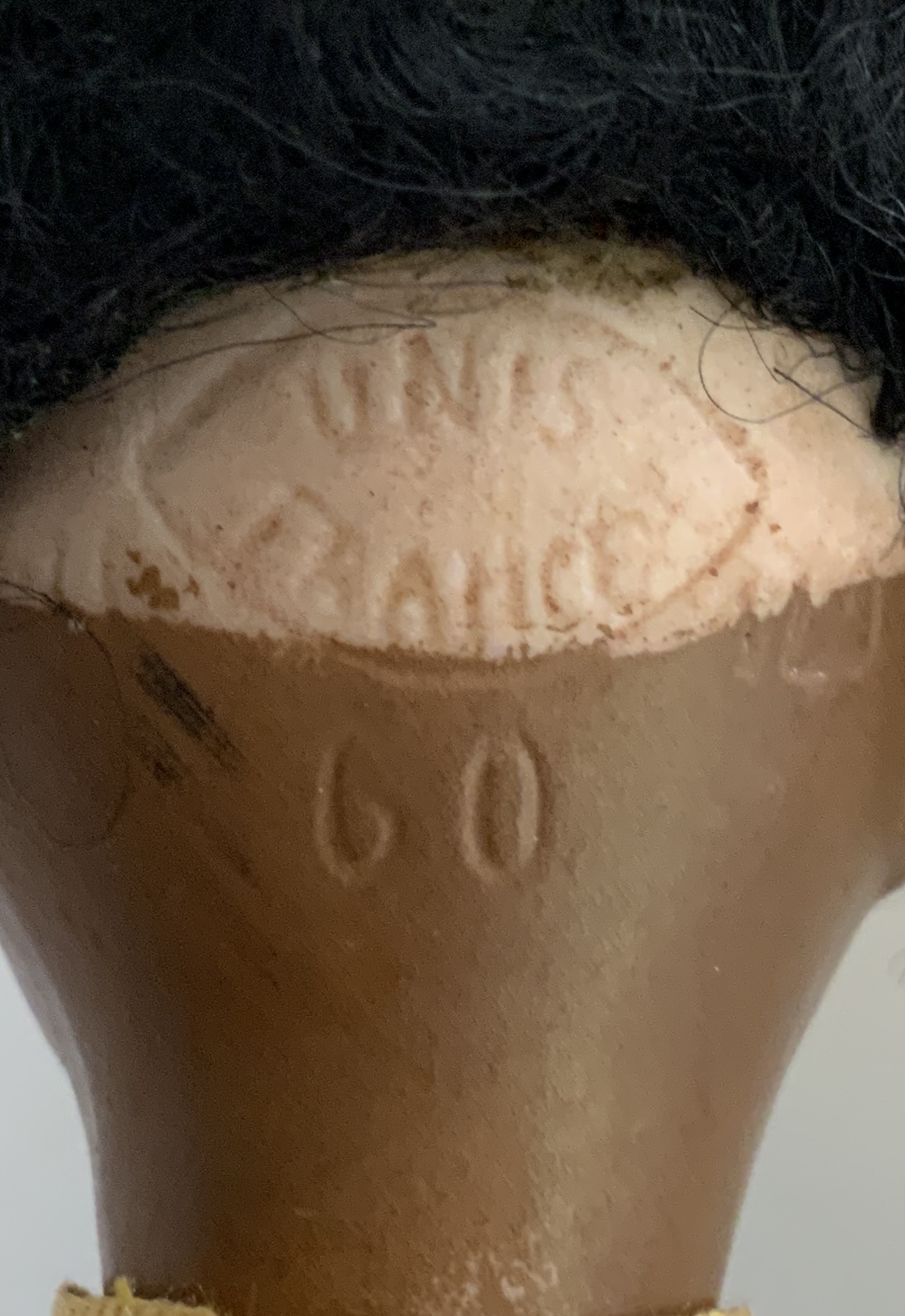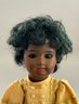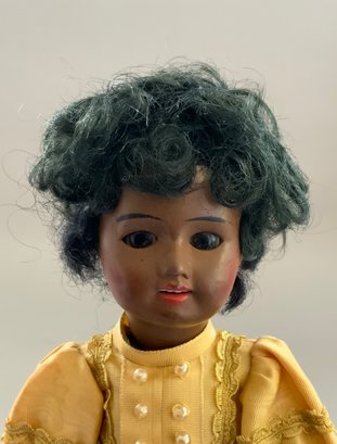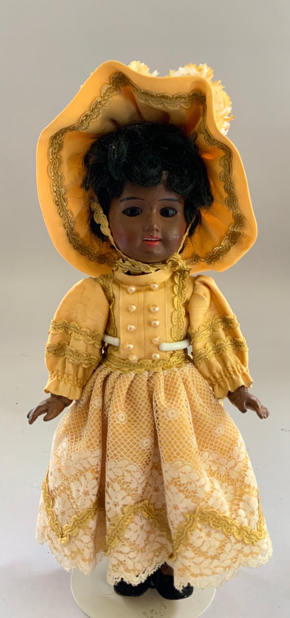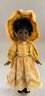 9” Black bisque child Unis France 60, brown glass eyes, OM with teeth, brown mohair wig, compo body, yellow dress