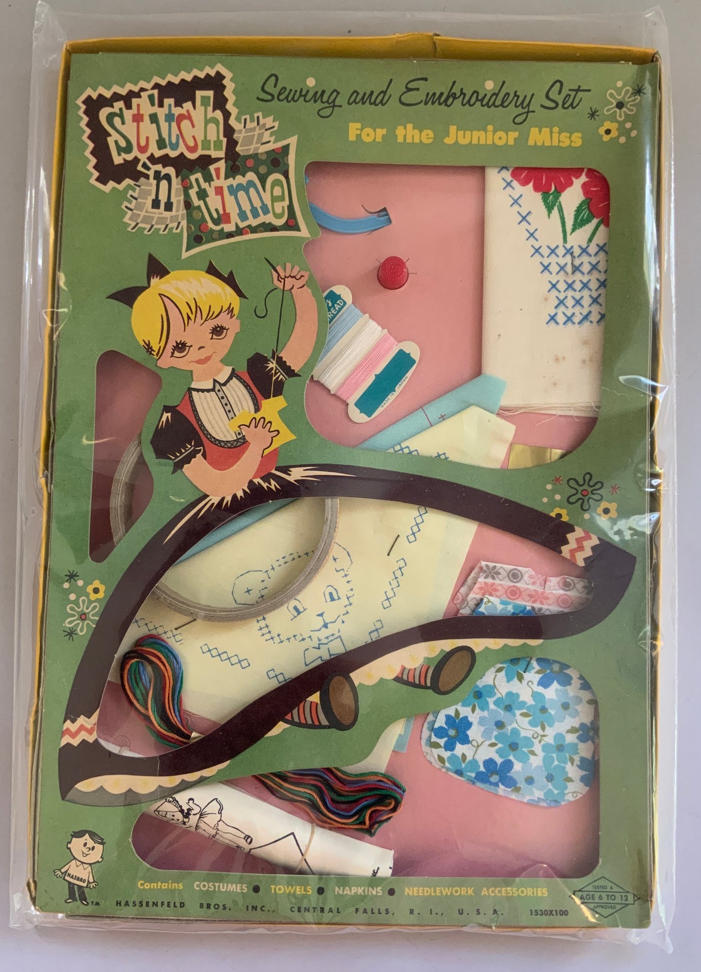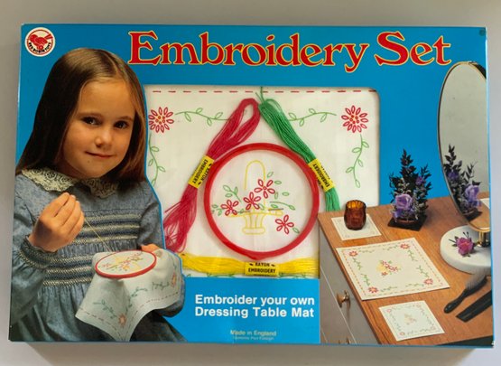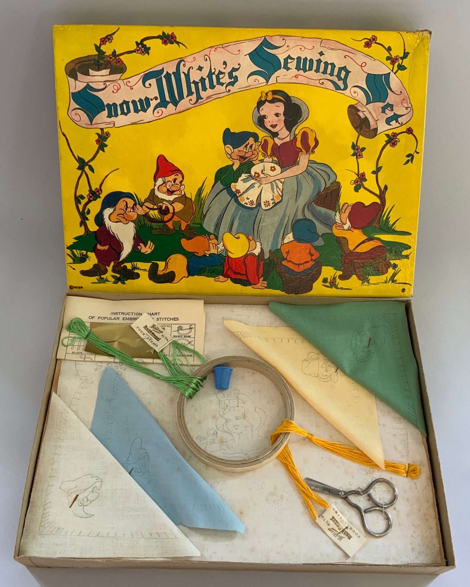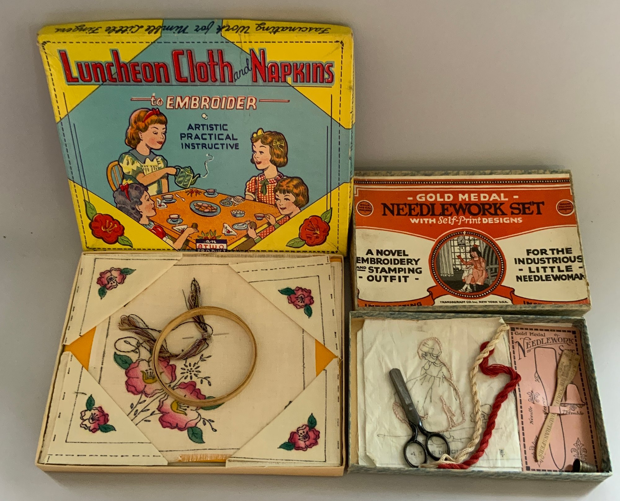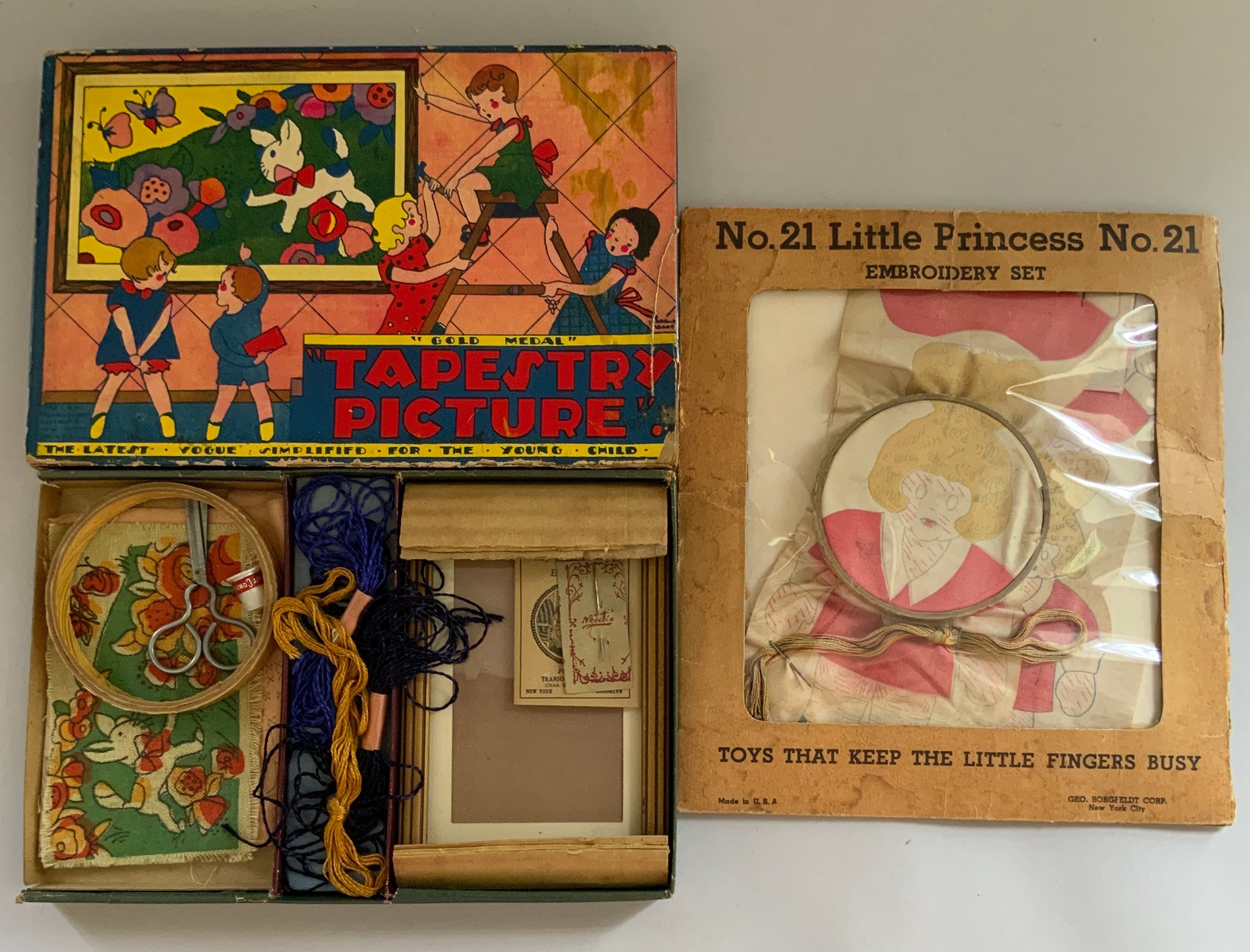 9 – Embroidery Sets, Stitch in Time Embroidery Set, Gold Medal Needlework Set, No. 21 Little Princess Embroidery Set, Gol original boxes some wear d Medal Tapestry Picture, Luncheon Cloth and Napkins to Embroider, Embroidery Set, Davis Personalized Bag and Hankie Embroidery Set, Embroidery Set Parker Brothers, & Snow White Sewing Set,