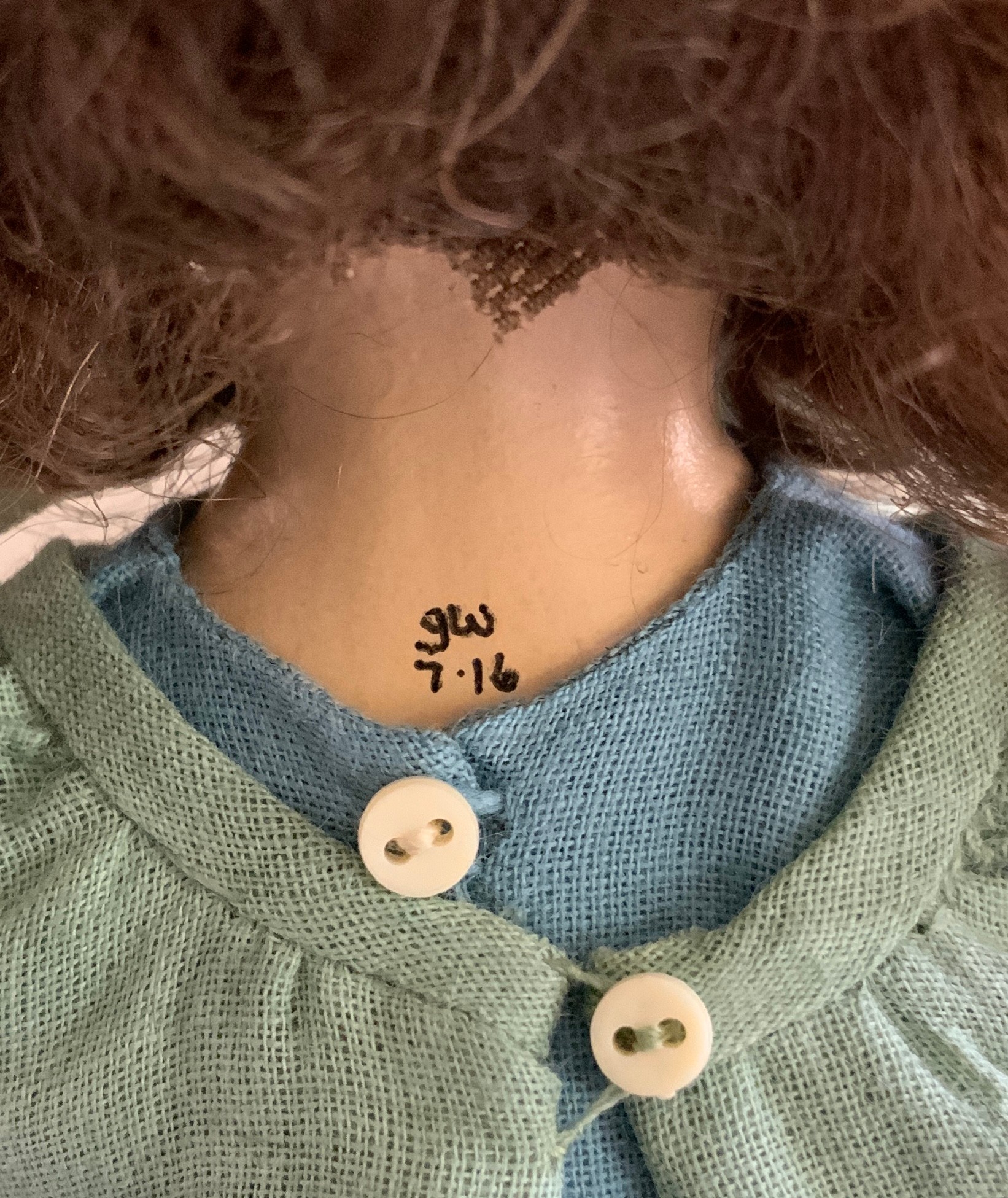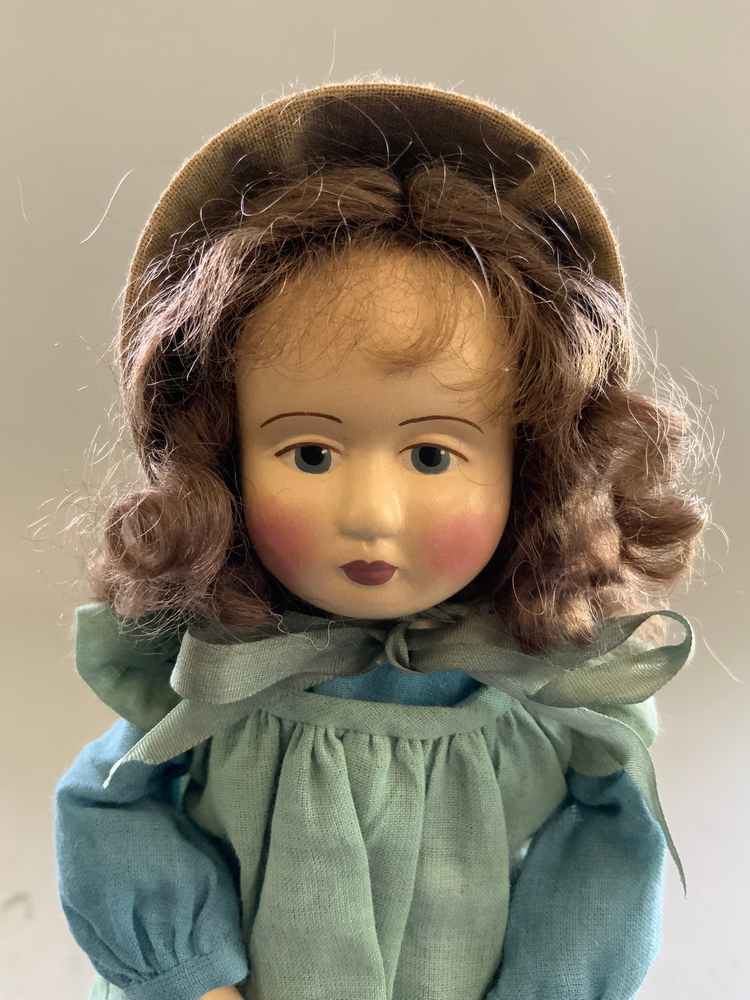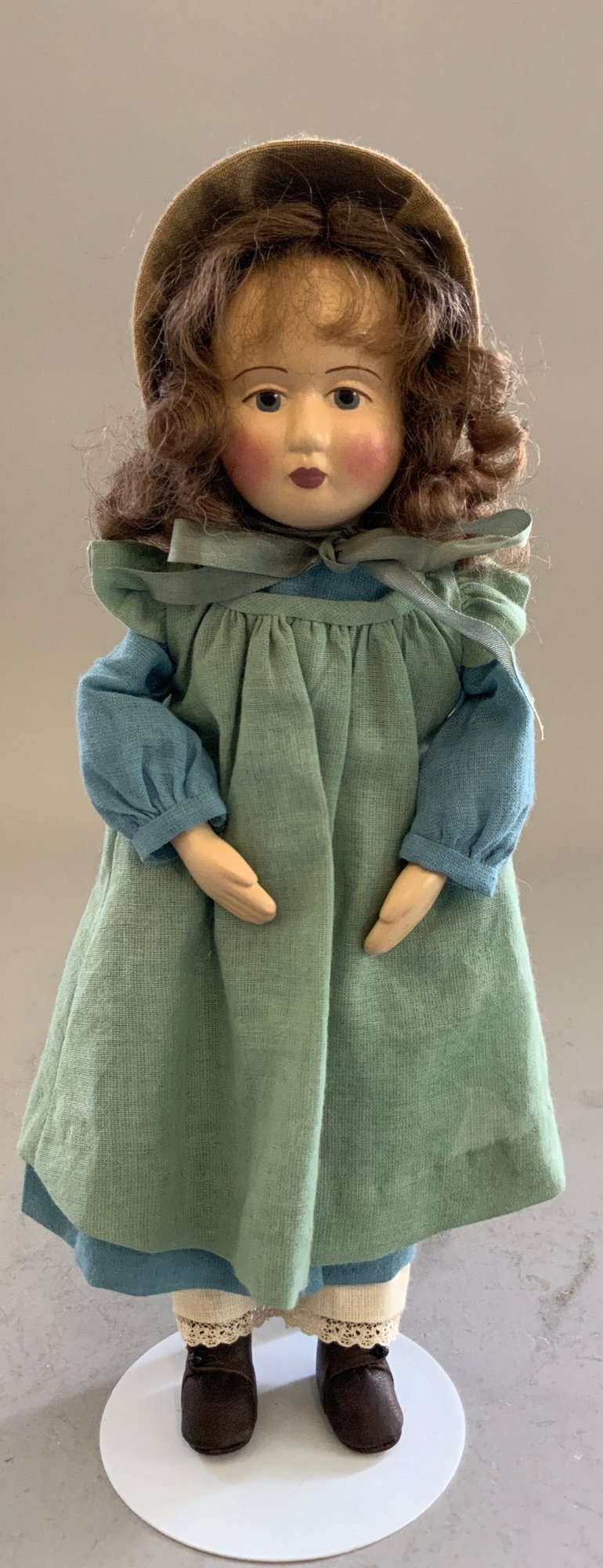 9 ½” Gail Wilson artist doll from 2016 UFDC Convention, paper mache & cloth, painted features, brown hair, blue/green outfit, signed