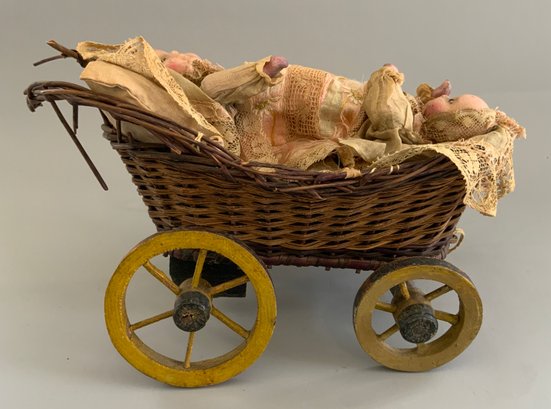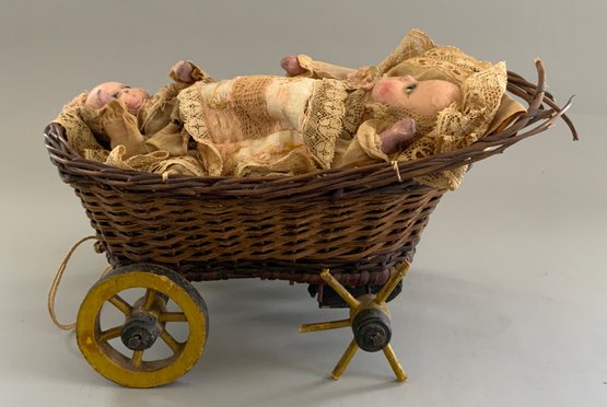 9” Long wicker doll carriage pull toy automaton, wood wheels with 2 – wax over compo baby dolls with blue glass eyes, as is condition, when carriage was pulled larger baby cried & moves arms (still works but rear wheel is broken)