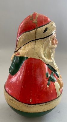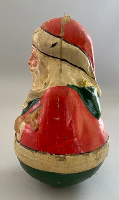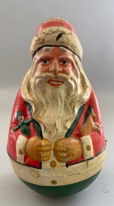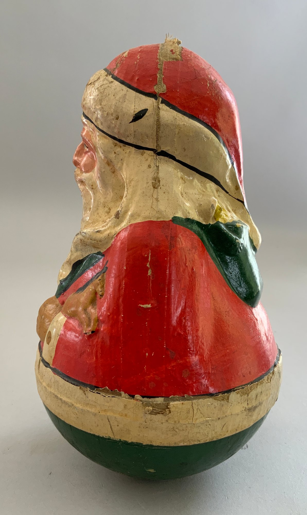 9” Schoenhut paper mache Rolly Dolly Santa toy, painted, weighted, (crazing, cracks, paint loss)
