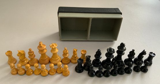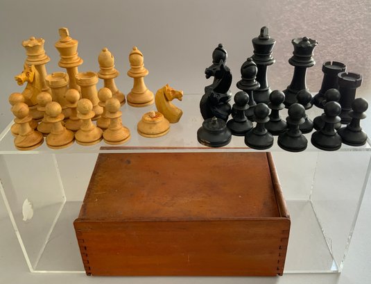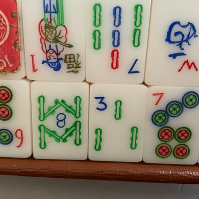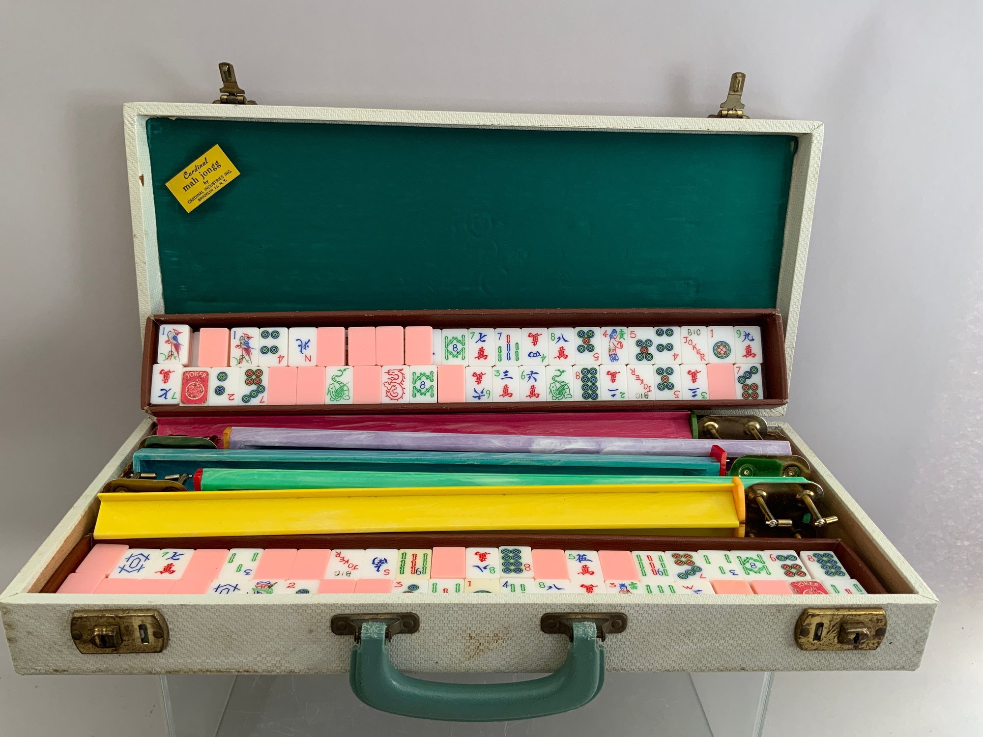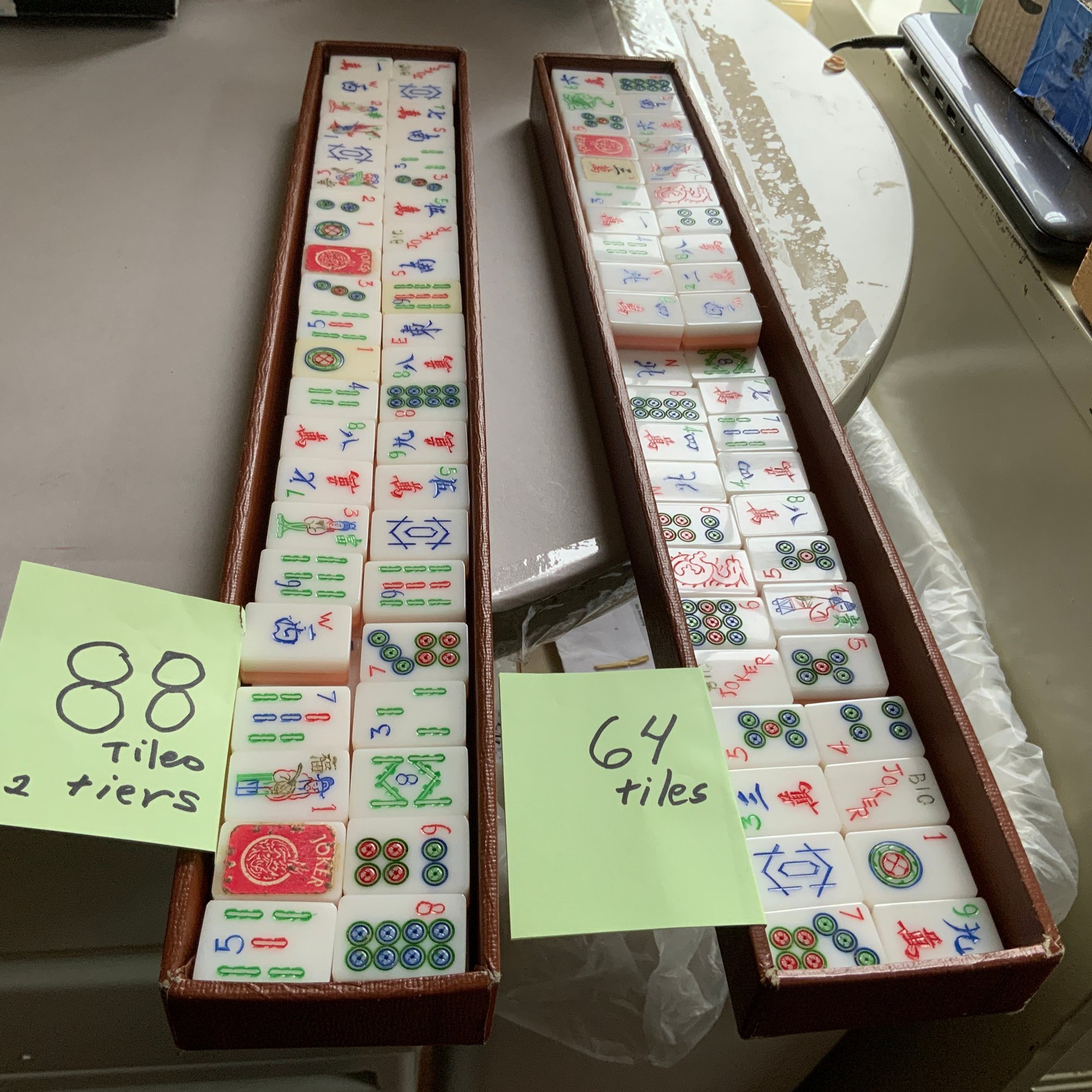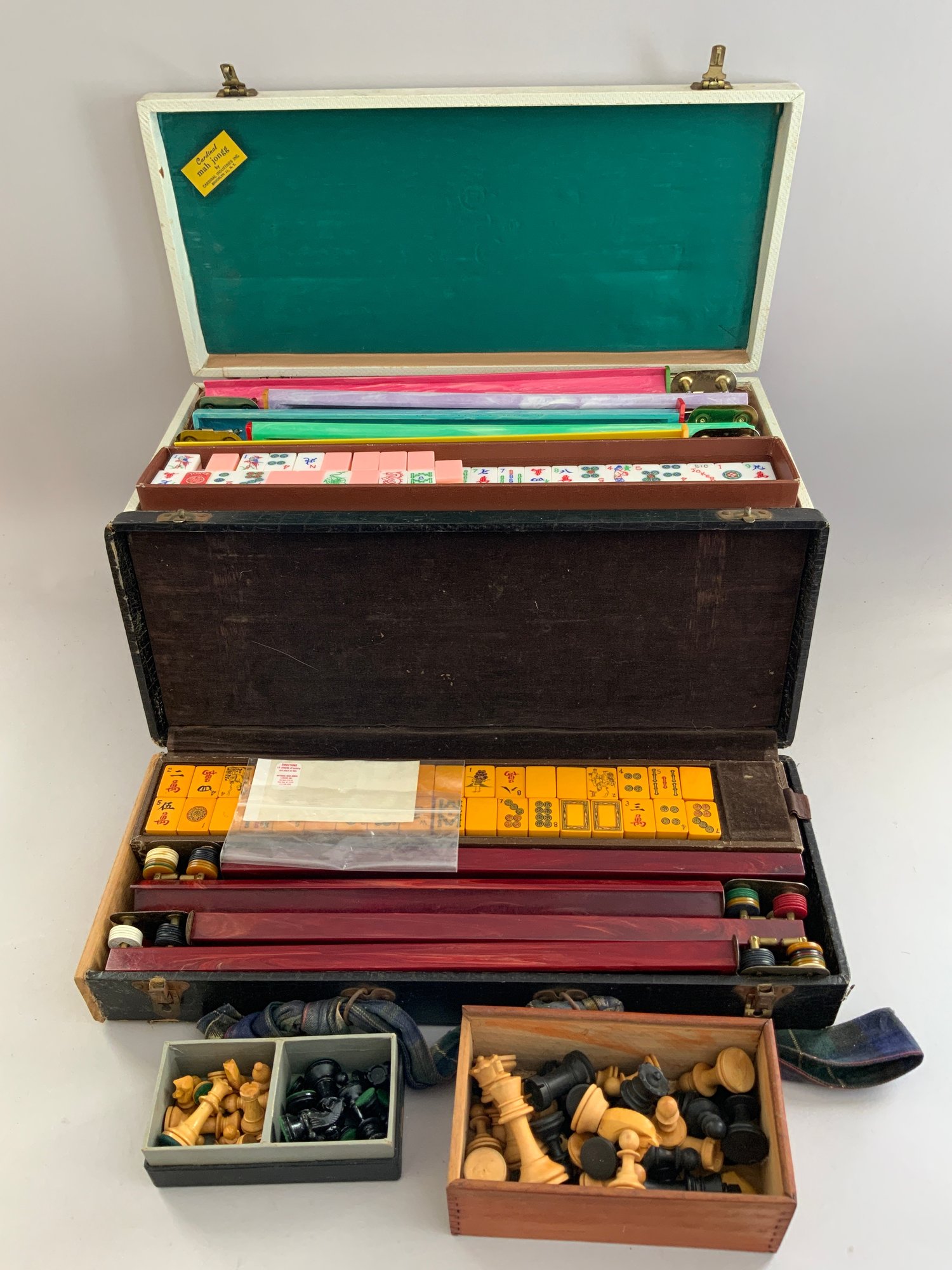 Gaming lot, 2-packs of wood chess figures, 2 – Large Early Mah-jongg Sets, 1 marked Cardinal Industries, Brooklyn NY, other one probably the same maker with Bakelite/ Catalin tiles (carrying case repaired)