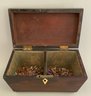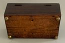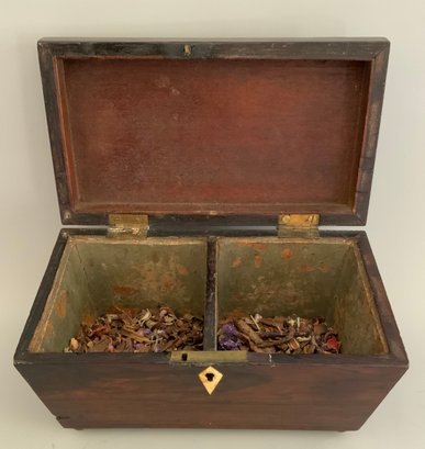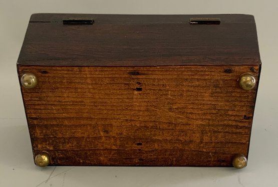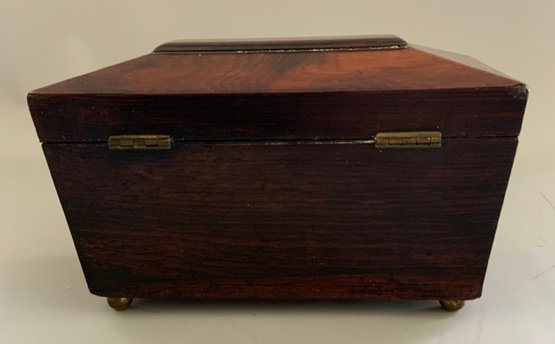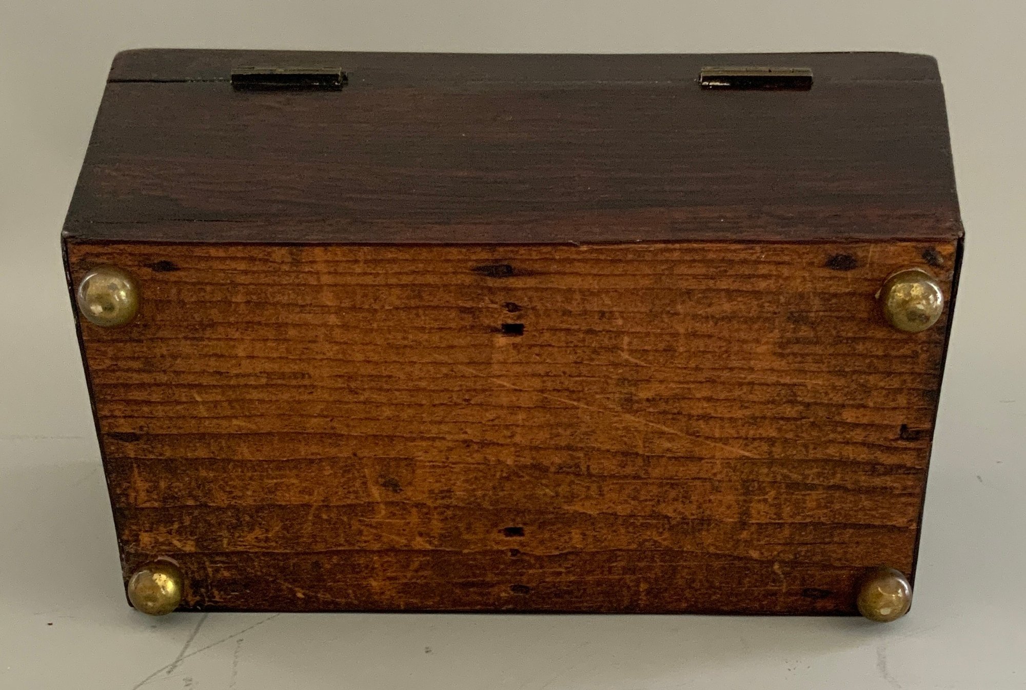 Antique English tea caddy 8”L x 4 ½”W x 4 ¾”T, sloped lift top with angle sides, two interior tea compartments, brass lock & hinges with ivory escutcheon, brass bun feet, appears to be mahogany & rosewood, age nicks & scratches
