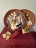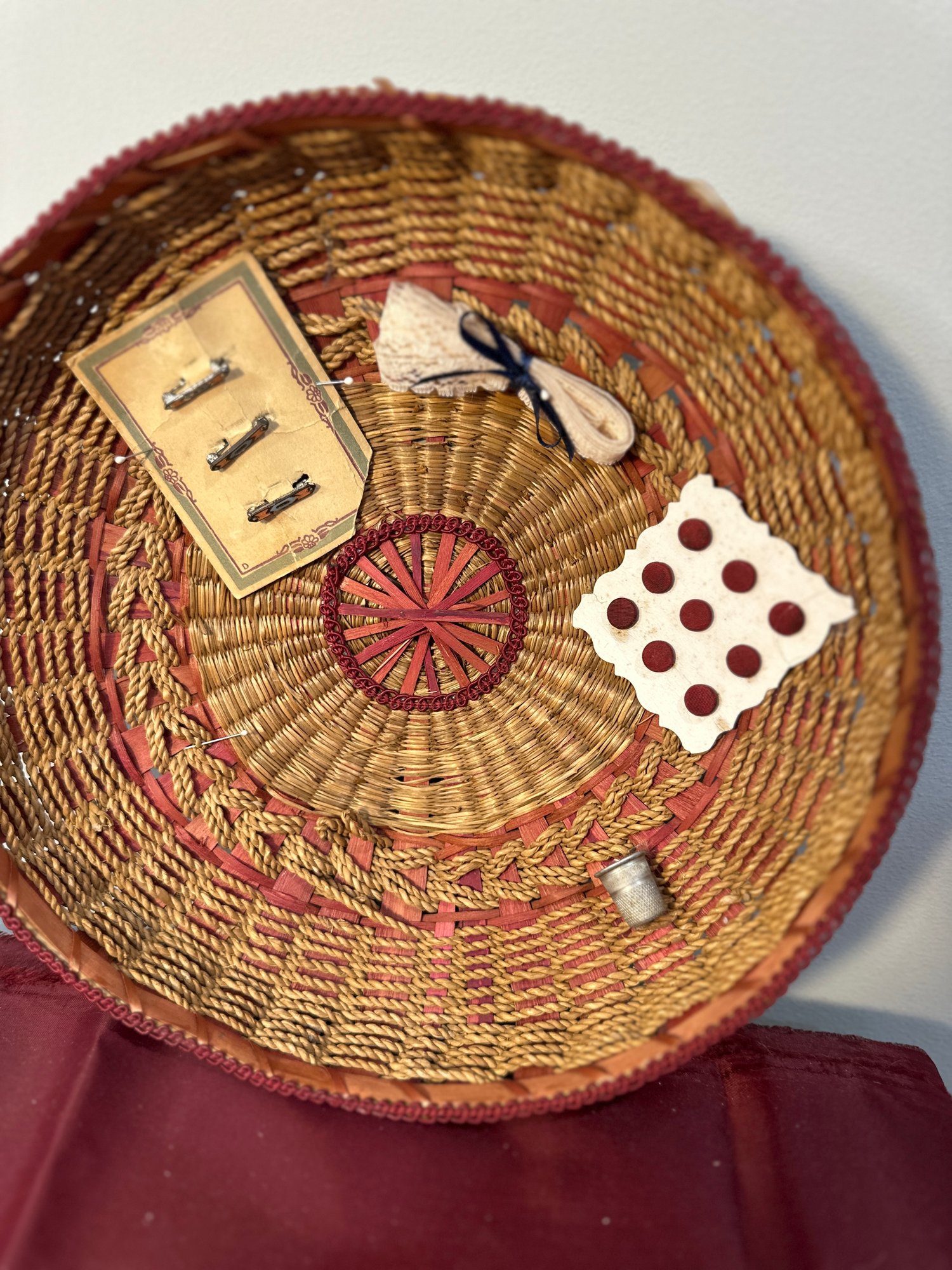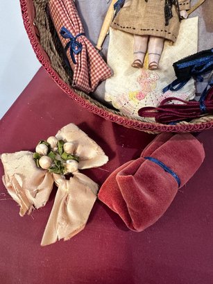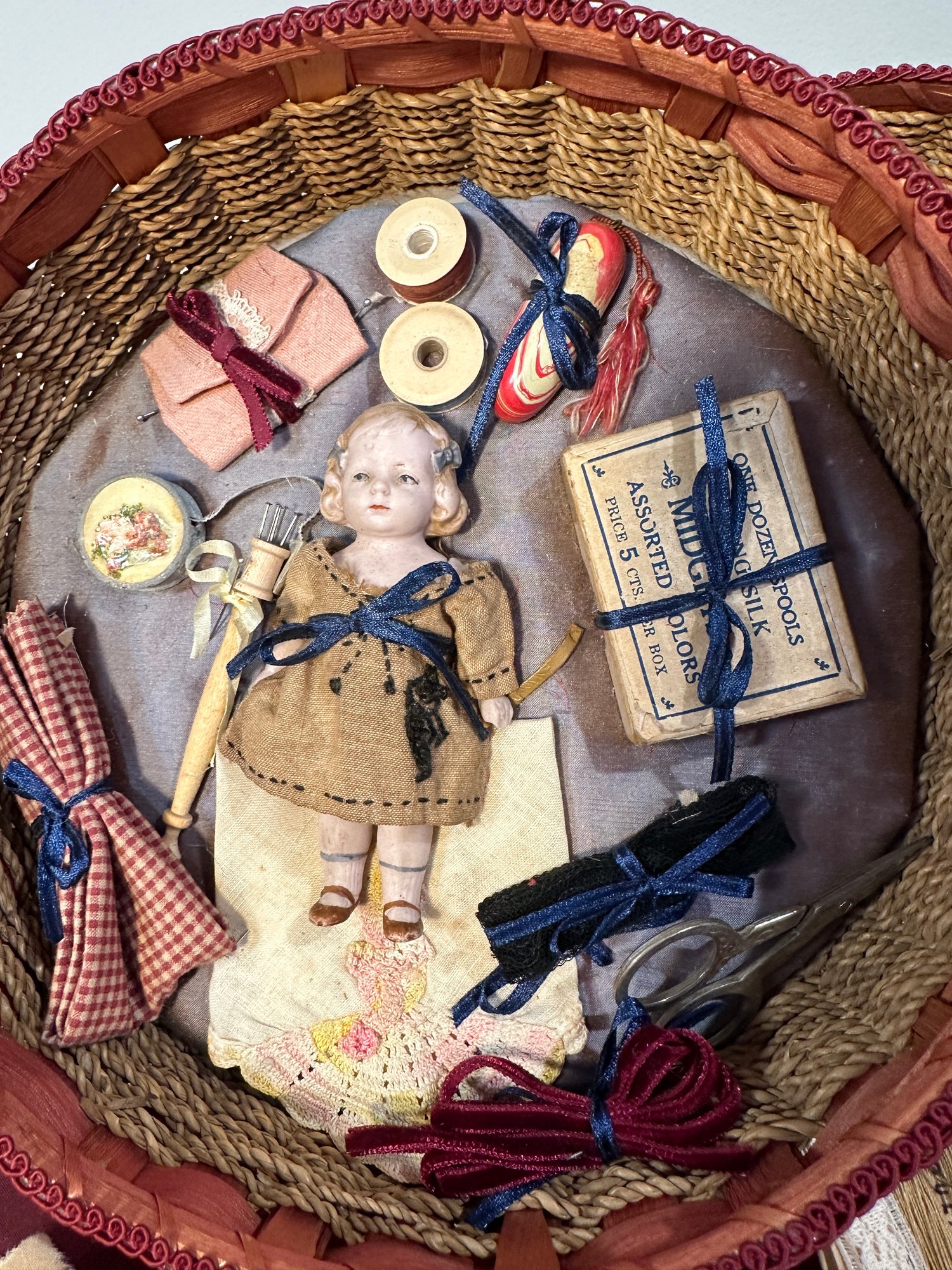 Antique sewing basket with doll and items tied in. Doll is approximately 5”. Very nice display piece.
