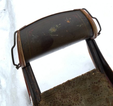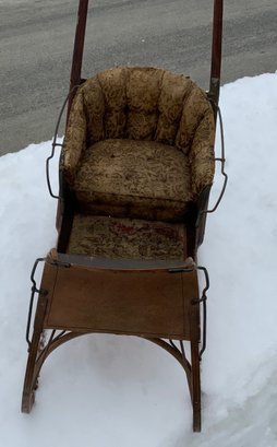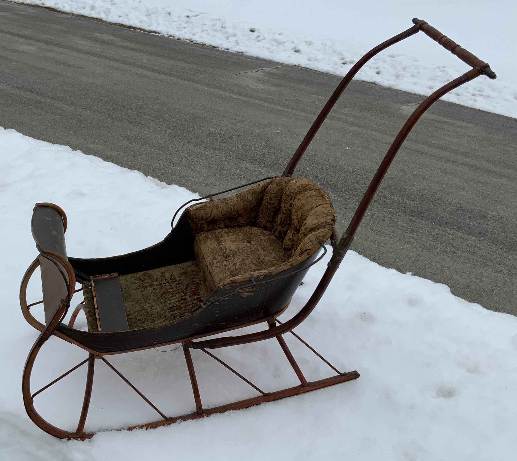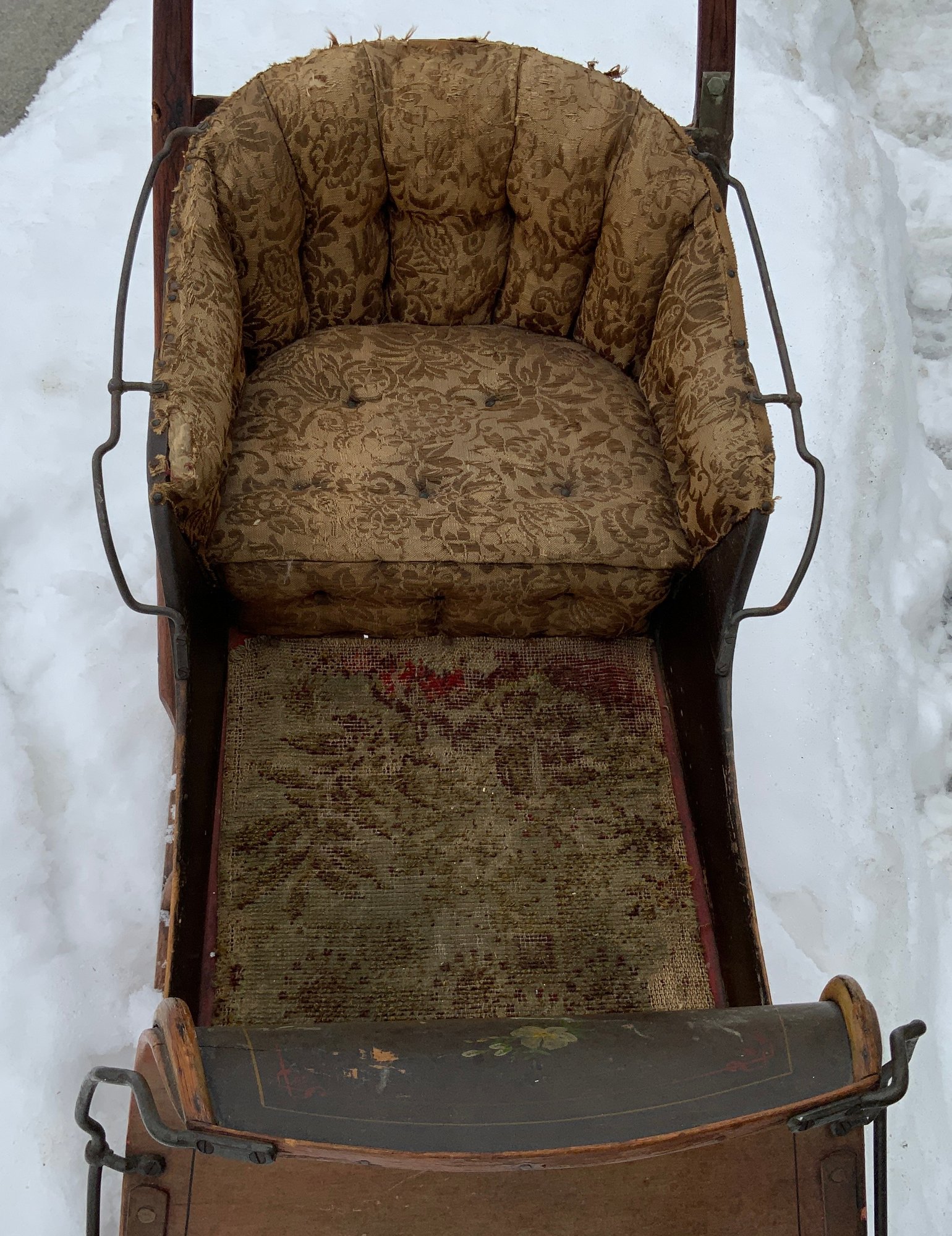 Antique Victorian child’s push sleigh, 33”H x 35”L x 18”W, red painted runners, original button & tufted brocade upholstery, (trim piece needs gluing) NO SHIPPING