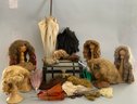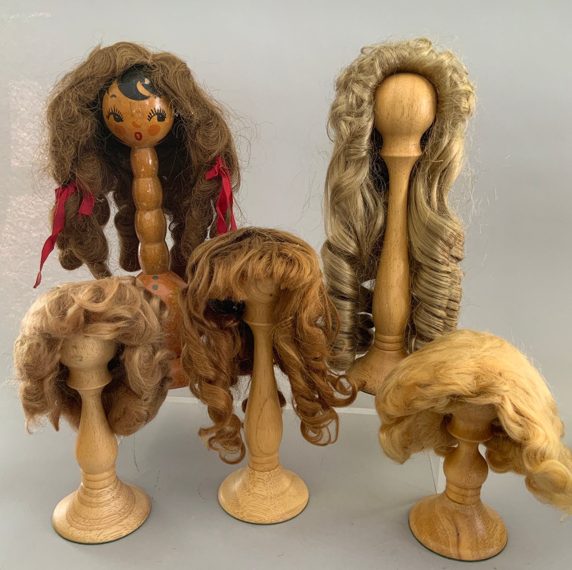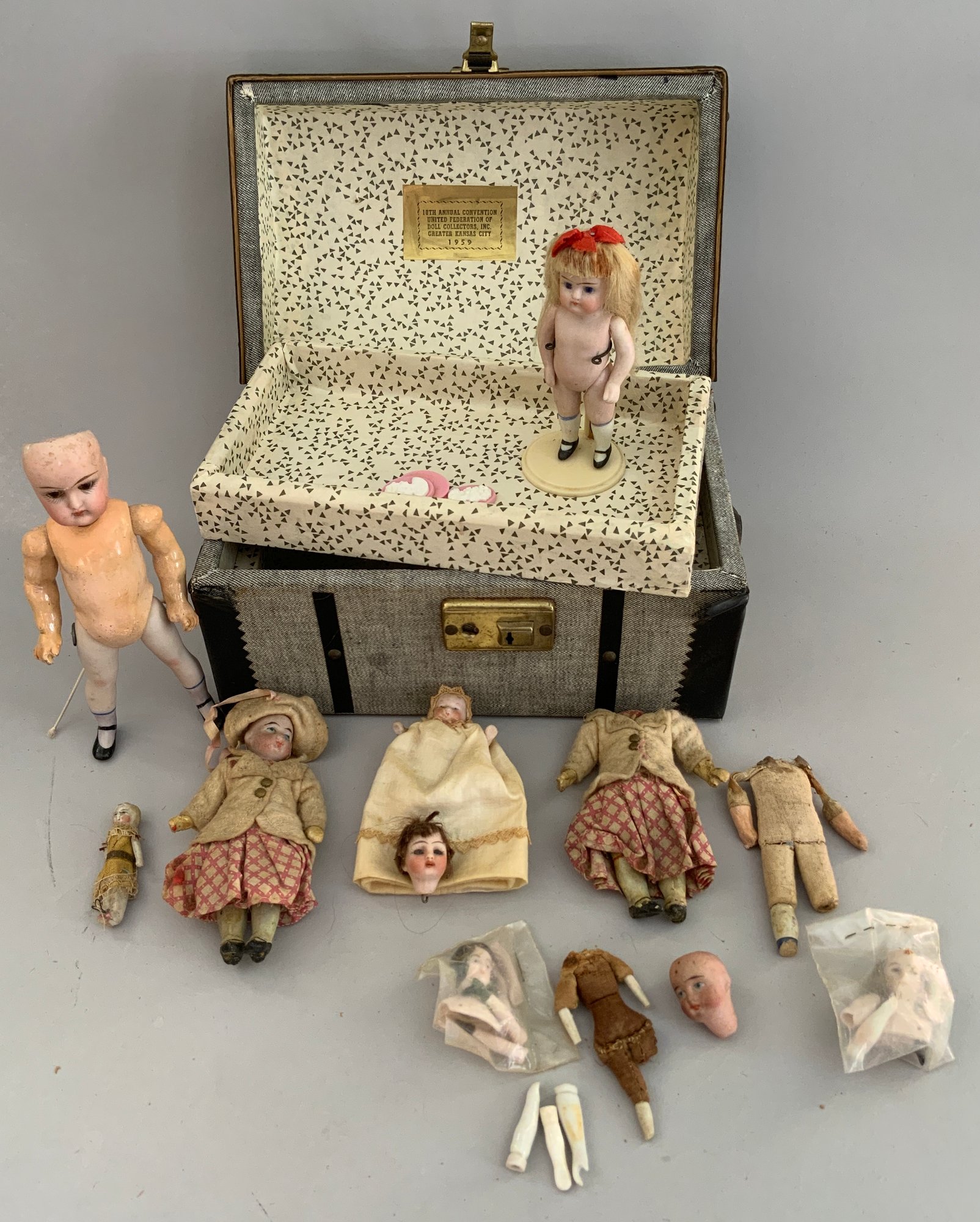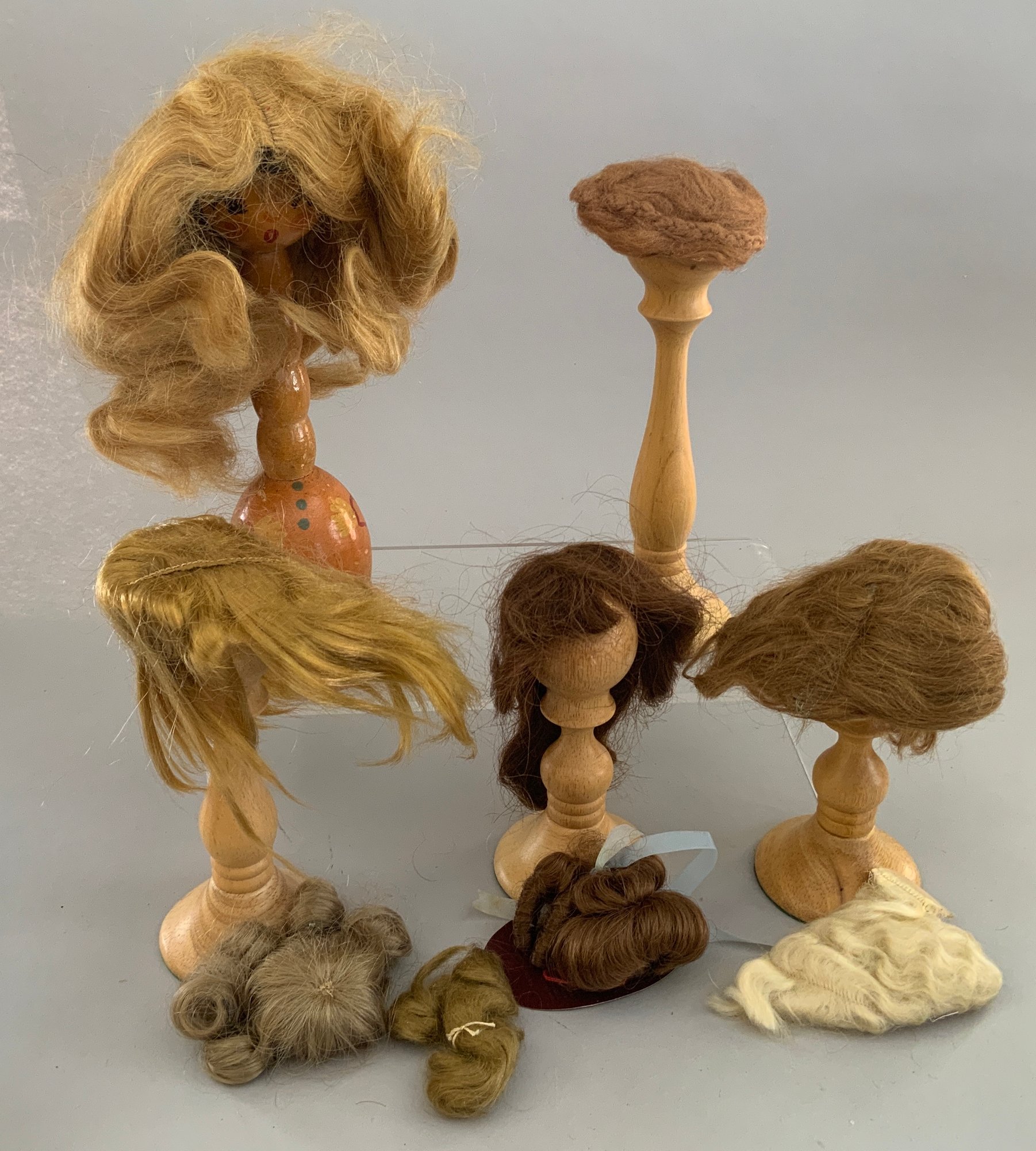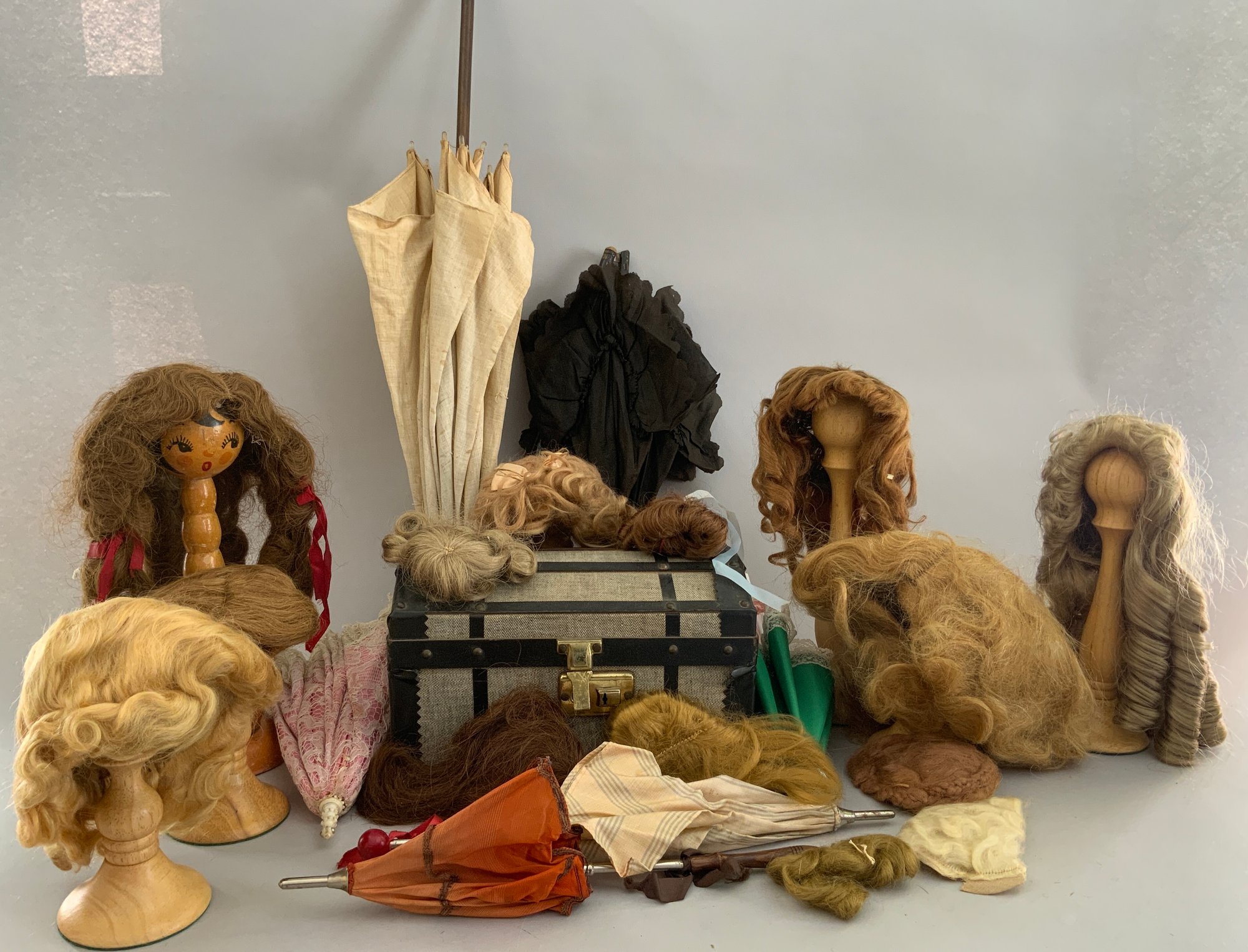 Assorted lot of doll wigs, parasols, & doll trunk with small dolls