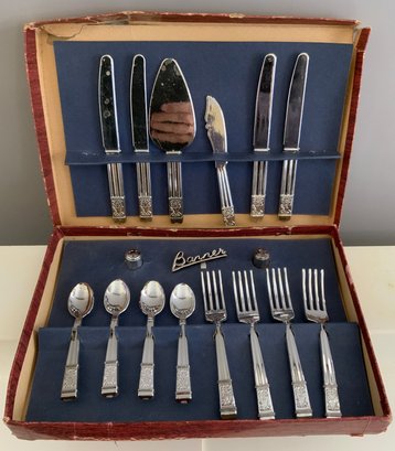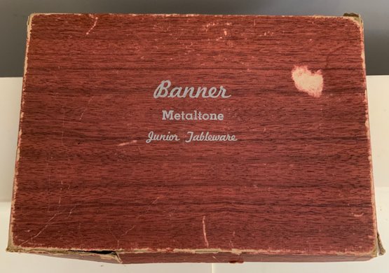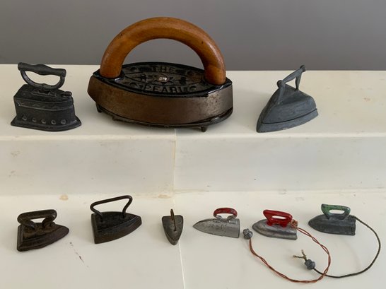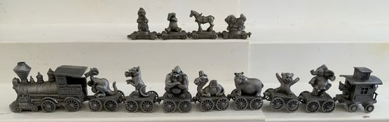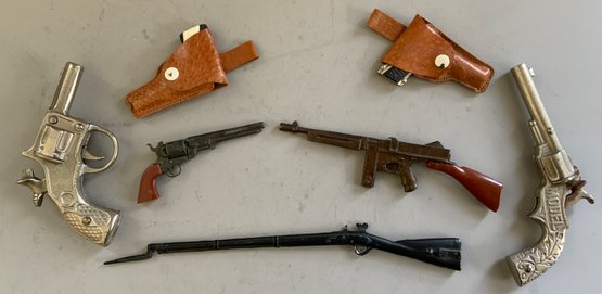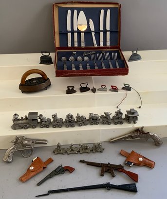 Assorted lot, Schmid miniature pewter zoo train set, assorted miniature guns, miniature sad irons, & Banner Metaltone Junior Tableware set in original box (wear)
