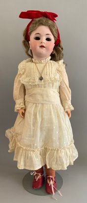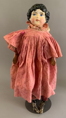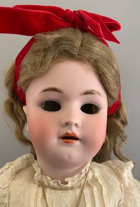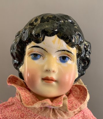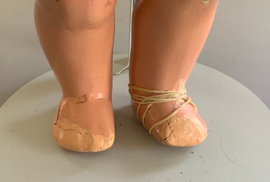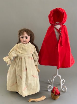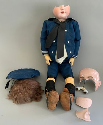 Battered Beauties box lot: 1 – 20” black hair china ( repaired), (broken & cracked shoulder plate, head crack, (glazed over is pealing), 1 – 13” bisque head inc. K.H. 500/3, w/ red riding hood cape, 5-pc. compo body (rough), (right arm is loose), 1 – 22” S&H Handwerck 3, (eyes loose in head), 1 – compo Petite, cracked head & broken foot, & 1 – 26” German bisque head inc. “K ½ Made in Germany 14 ½ 164”, (head is badly broken, pieces are included), BJCB marked “Excelsior, DRP No.70685, Germany 5 ½”, wearing a blue sailor suit, mohair wig, brown glass sleep eyes