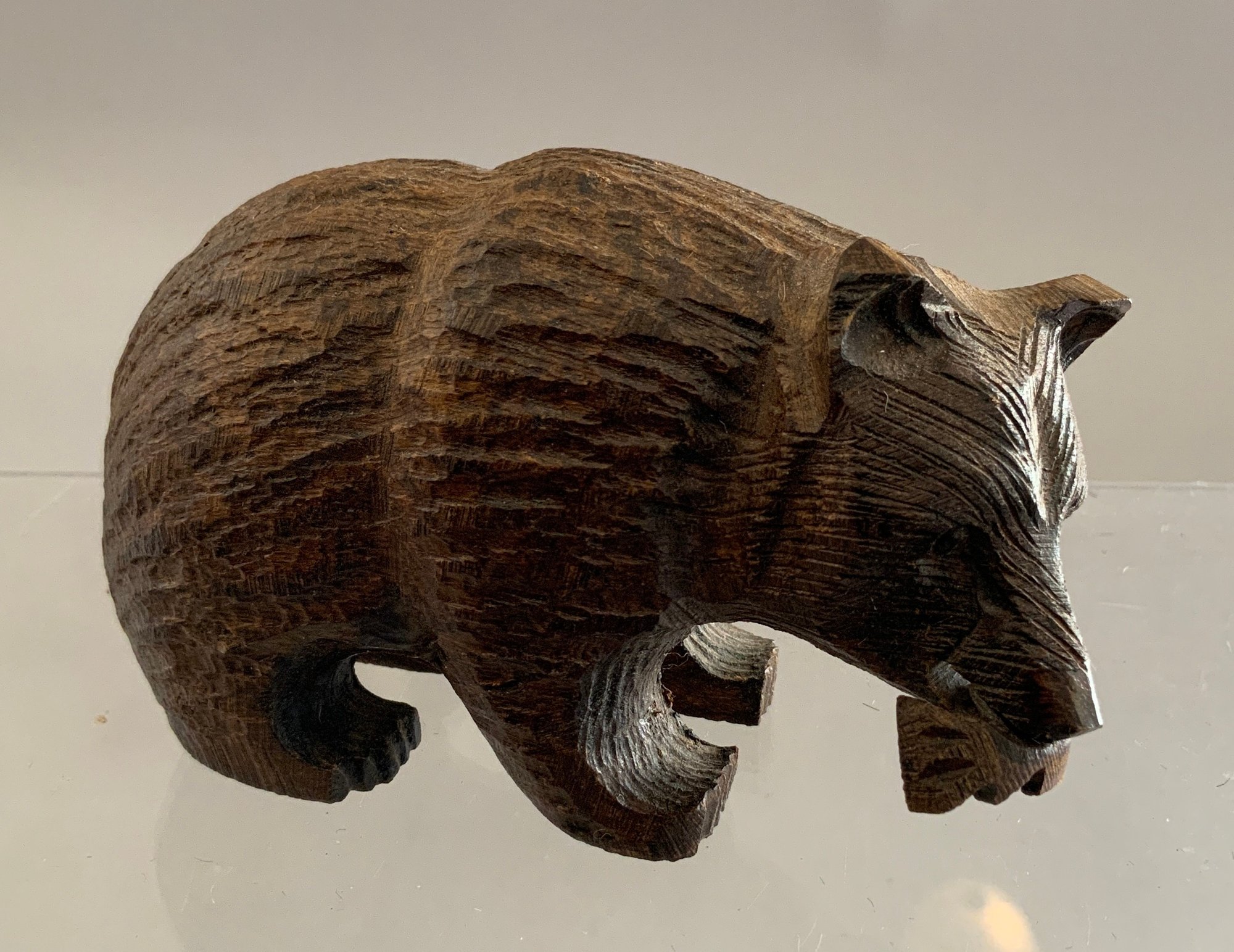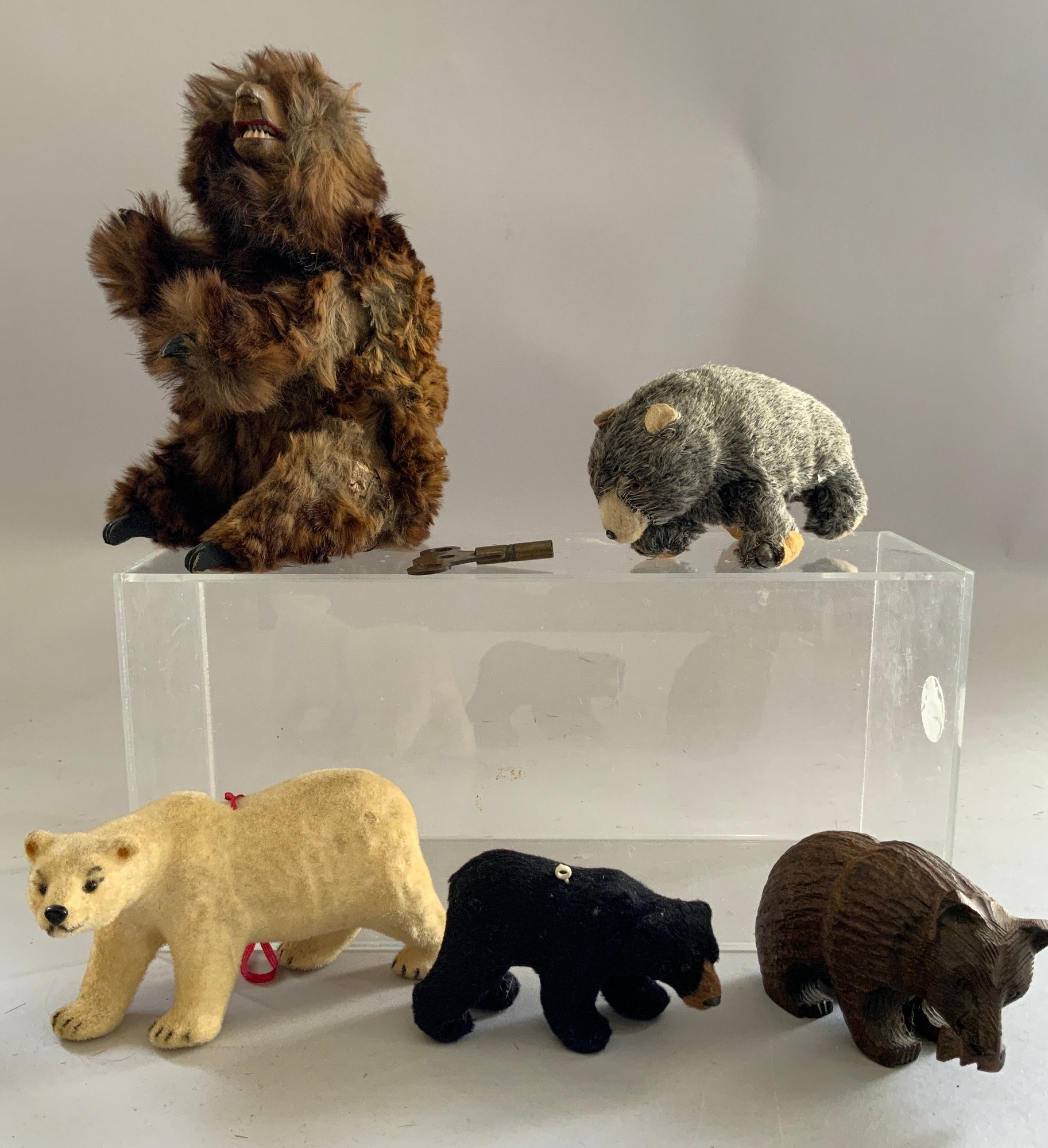 Box Lot of 5 asst. wild Bears: Ives Blakeslee & Co. Mechanical, Brown fur-covered, Key-wind (not working,), Key-wind, 5” grey, bear-on-wheels (no Key, as-is)),