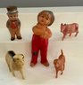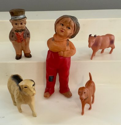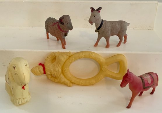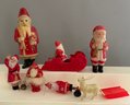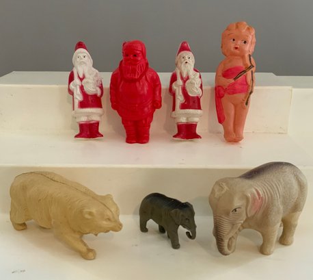 Celluloid Santa’s, & animals, etc., 4” – 8 ½” tall, some damage