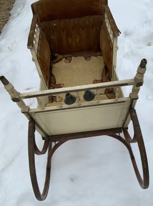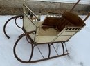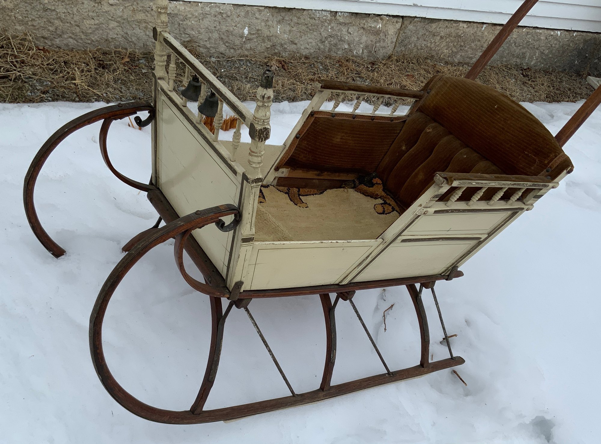 Child’s sleigh, Victorian, white, w/ bells, 53” x 38” x 16½” W, orig. velvet upholstery, Oak handle) NO SHIPPING
