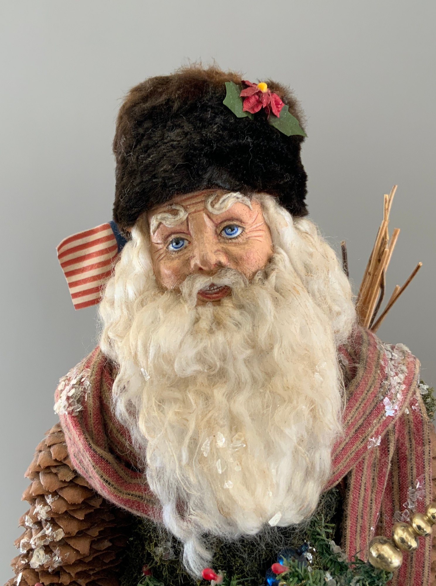 Christmas lot - 17” Hand sculpted Artist- made Santa, wearing a full beard and a fur hat, w/ label on bottom: “2011 Roy Brindamour Marblehead Mass”, wearing a suit of pine cones, holding a feather Christmas tree & a bird cage, and carries a pack full of gifts, standing on a birch bark base & 18 inch, feather Christmas tree with 8 + glitter ornaments (a repro)