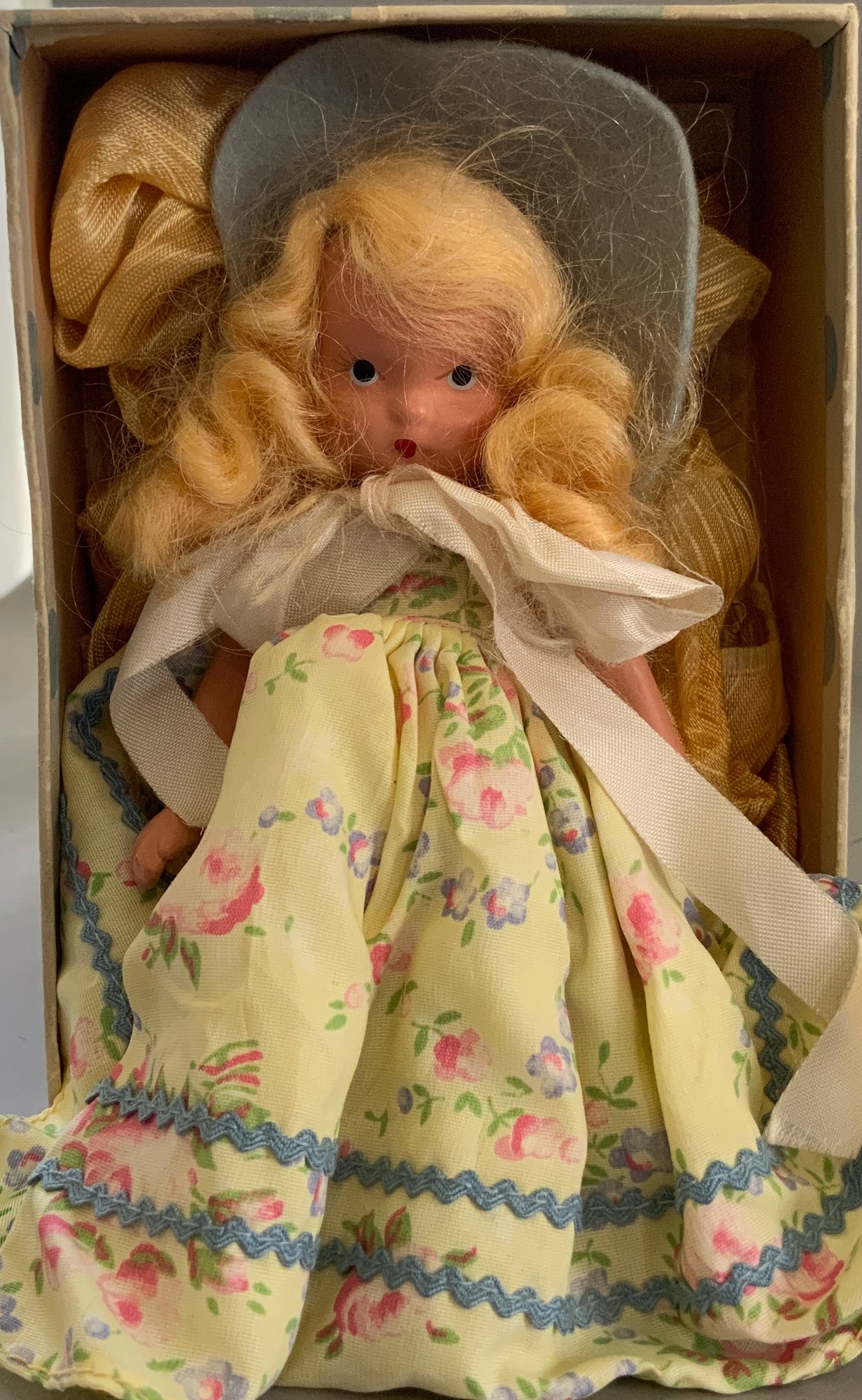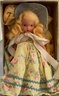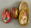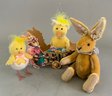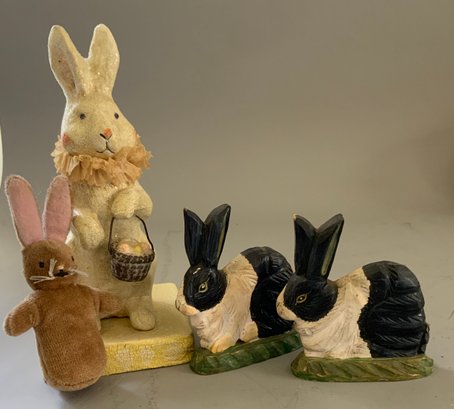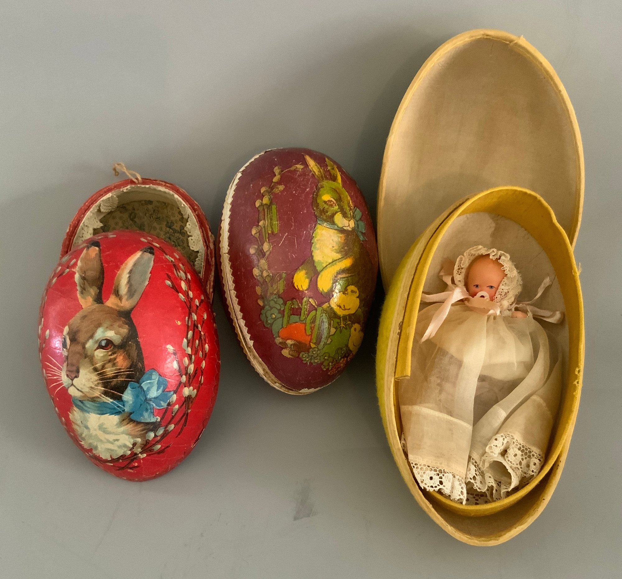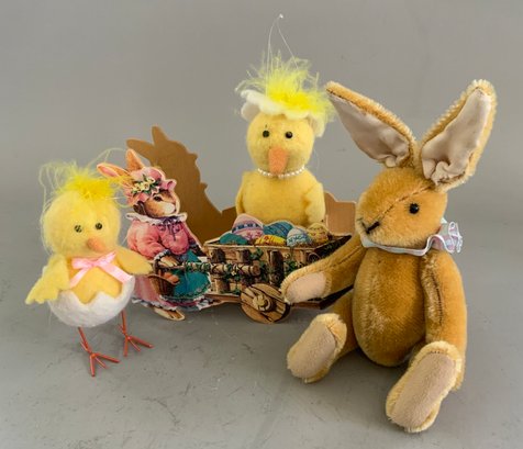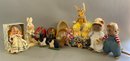 Easter lot, 7” fabric egg with small compo? baby inside (wear to egg), Story book doll in Easter dress, 2 – paper mache eggs, and various rabbits, chickens, etc.