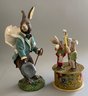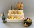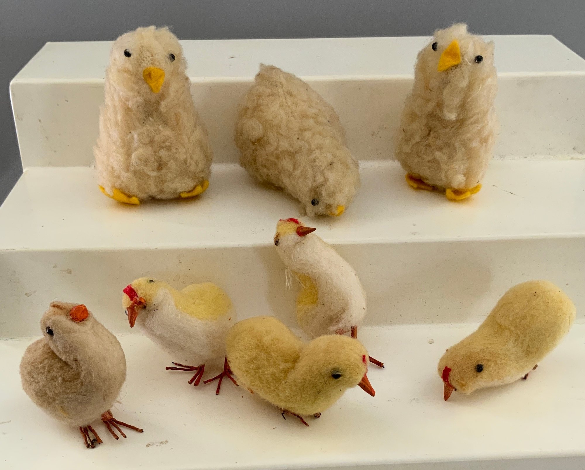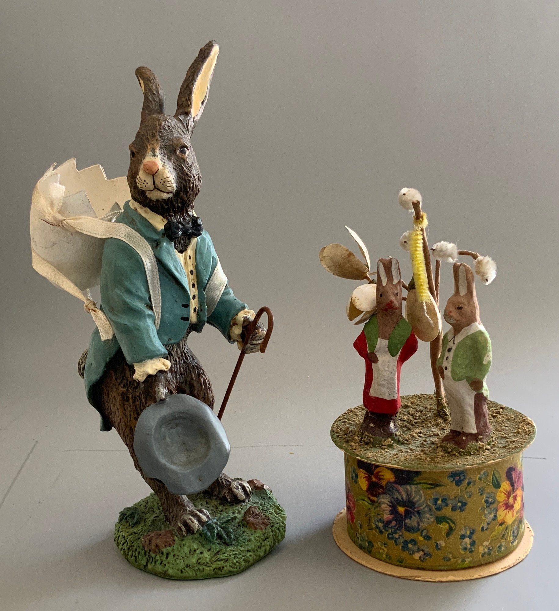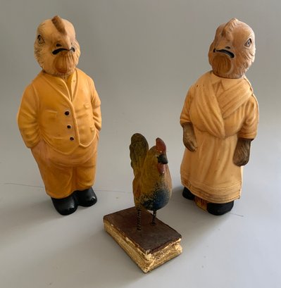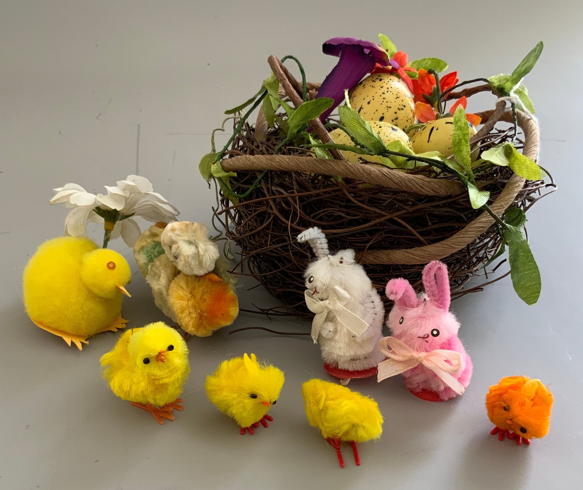 Easter lot 1 – rooster squeak toy 4” tall, (bellows work doesn’t squeak), 2 rabbits on candy container, man & woman celluloid chickens, assorted chicks, & rabbit carrying egg back pack (composition material)