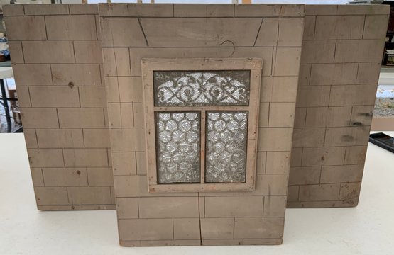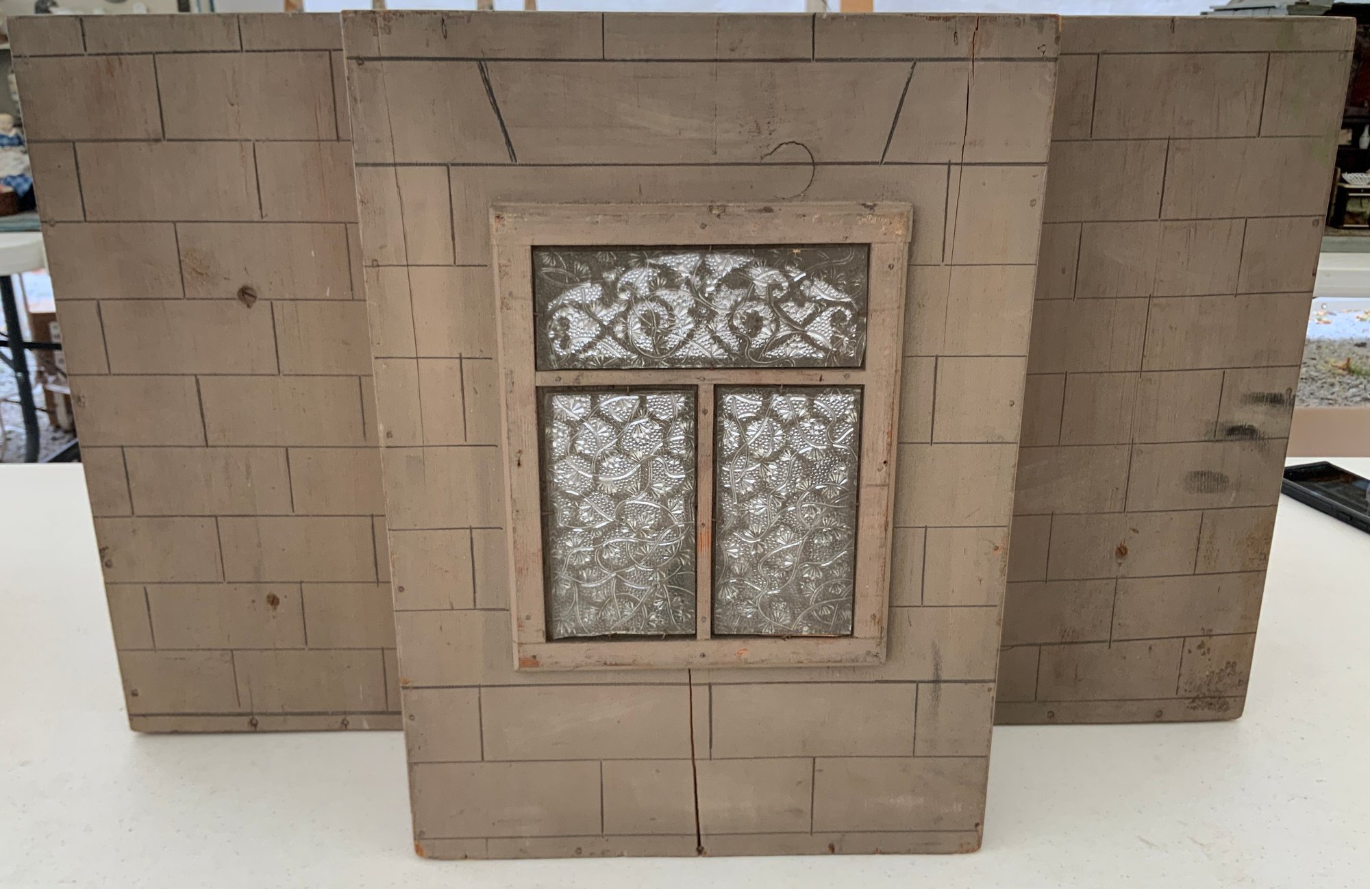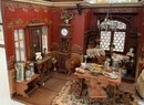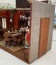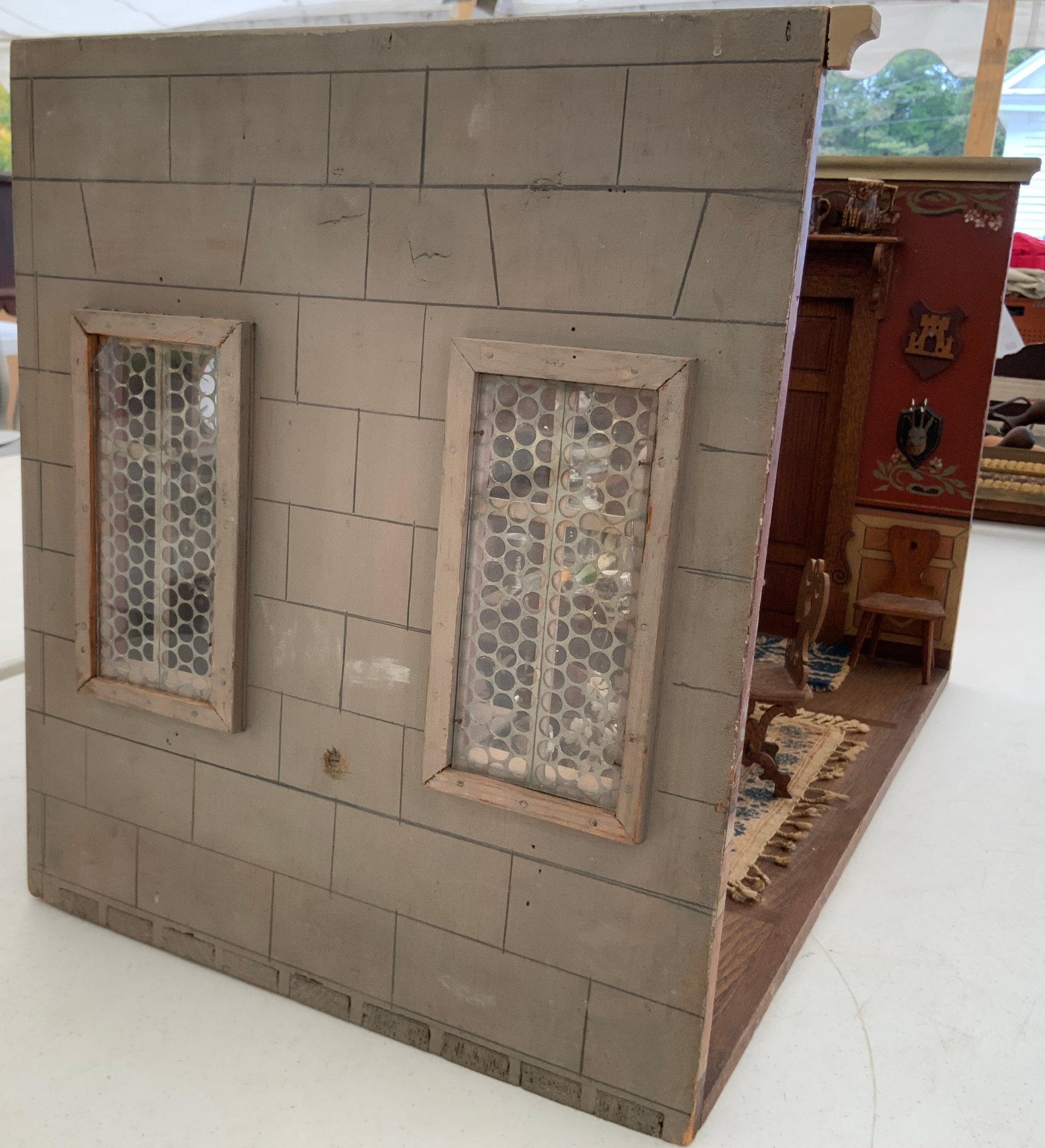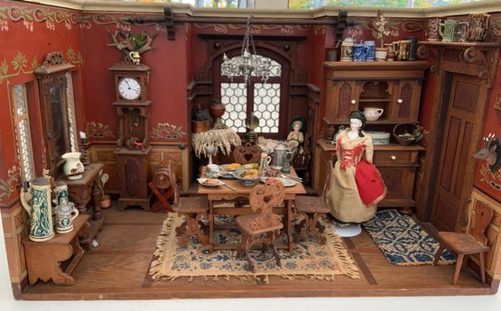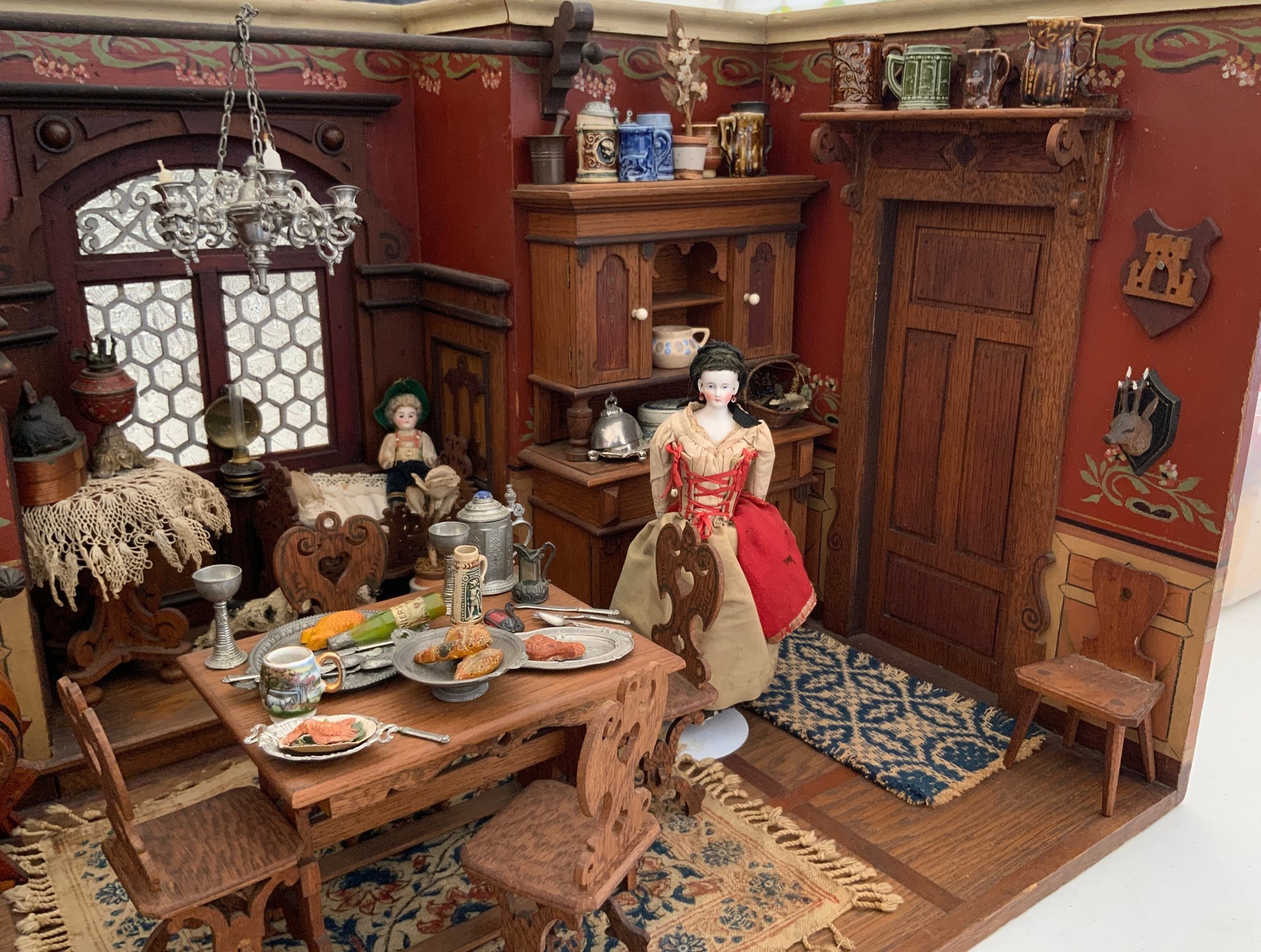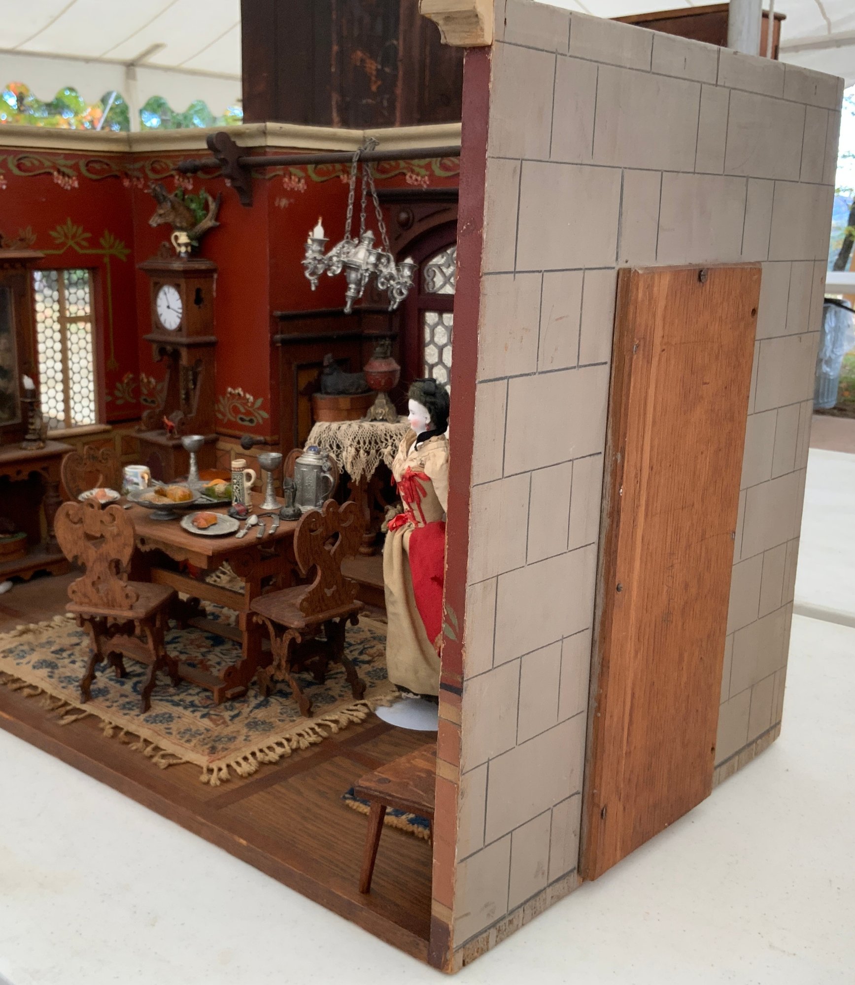 German Bavarian style room box, 27 ½”L x 14” W x 16 ½”T, elaborate diming area, 2 bisque head doll house dolls, period accessories, inlaid floor, wall stenciling