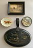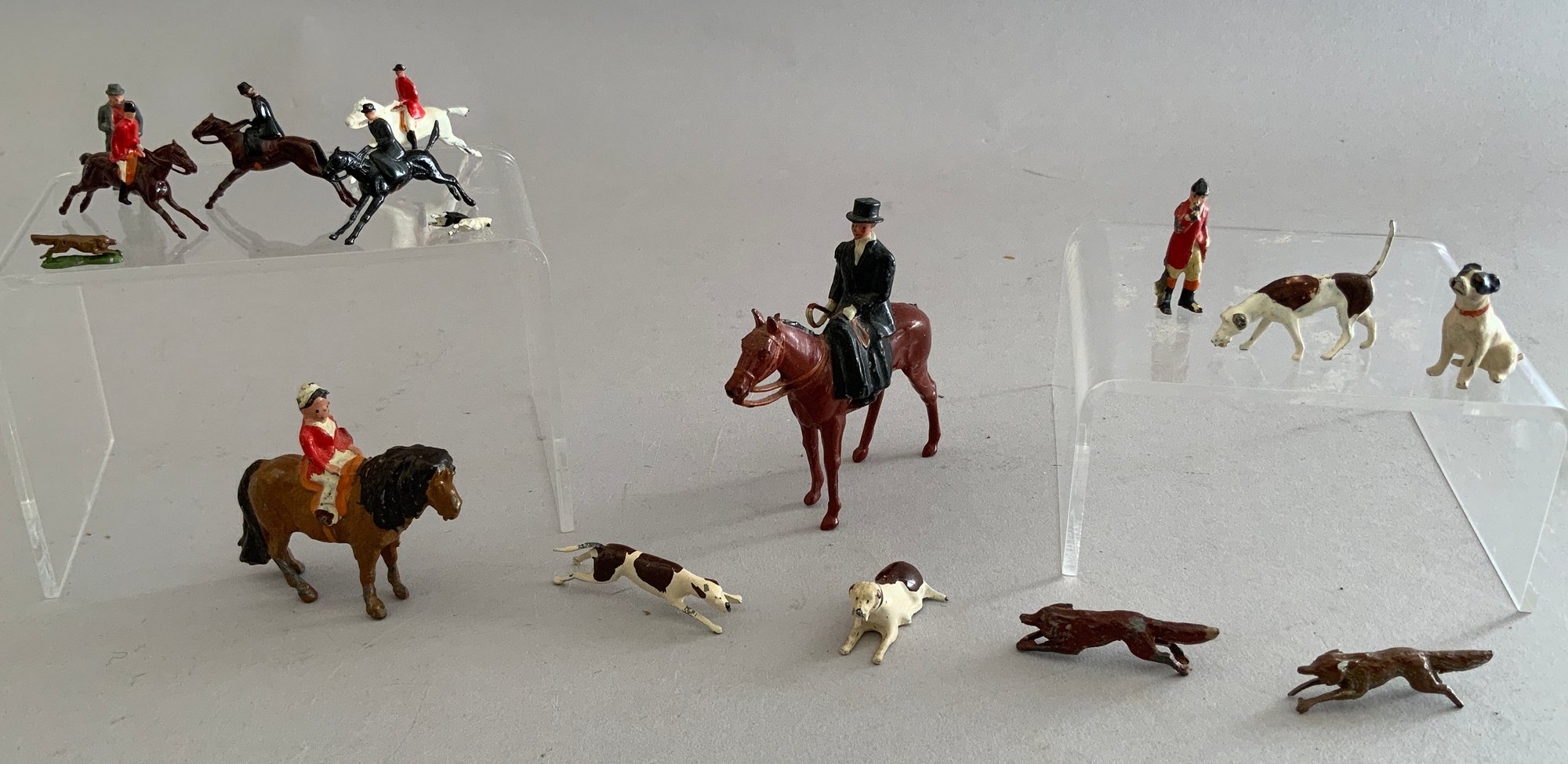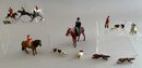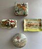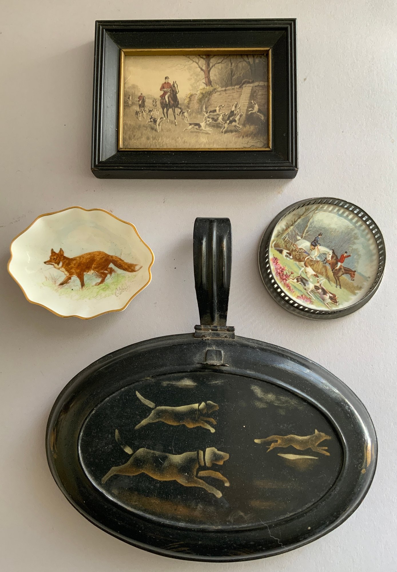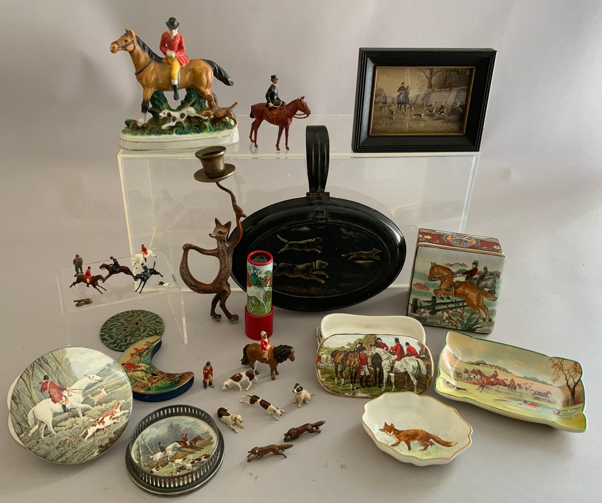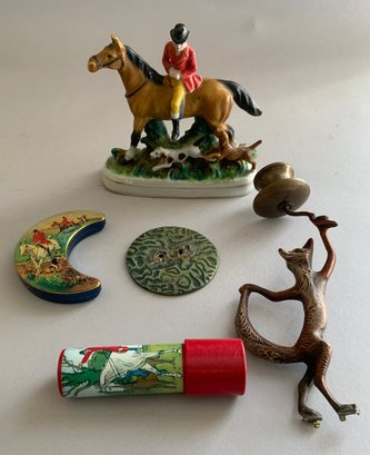 Fox Hunting theme Box Lot: 4+ English bone China boxes / trays w/ Foxes, Horses & Hounds; Figurine of woman Horse-rider w/ hounds (occupied Japan); Dancing Fox painted metal candlestick, 15 + pcs. of Fox hunting painted metal miniatures, size 1” – 4” Vienna Bronze-type