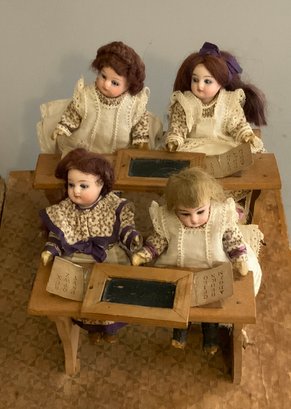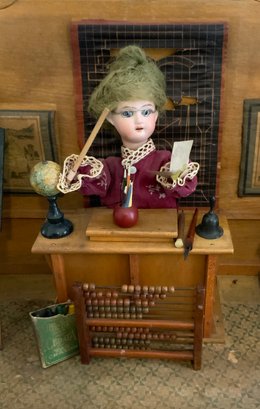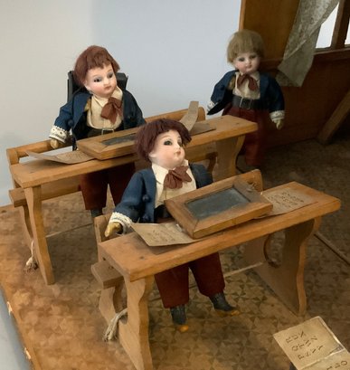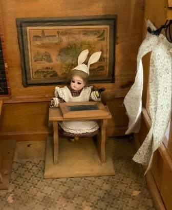 French “Ecole” school room box 18 ¾”L x 15”W x 11T, with bisque head teacher & 8 bisque head, glass eyed students in a classroom with accessories