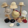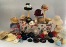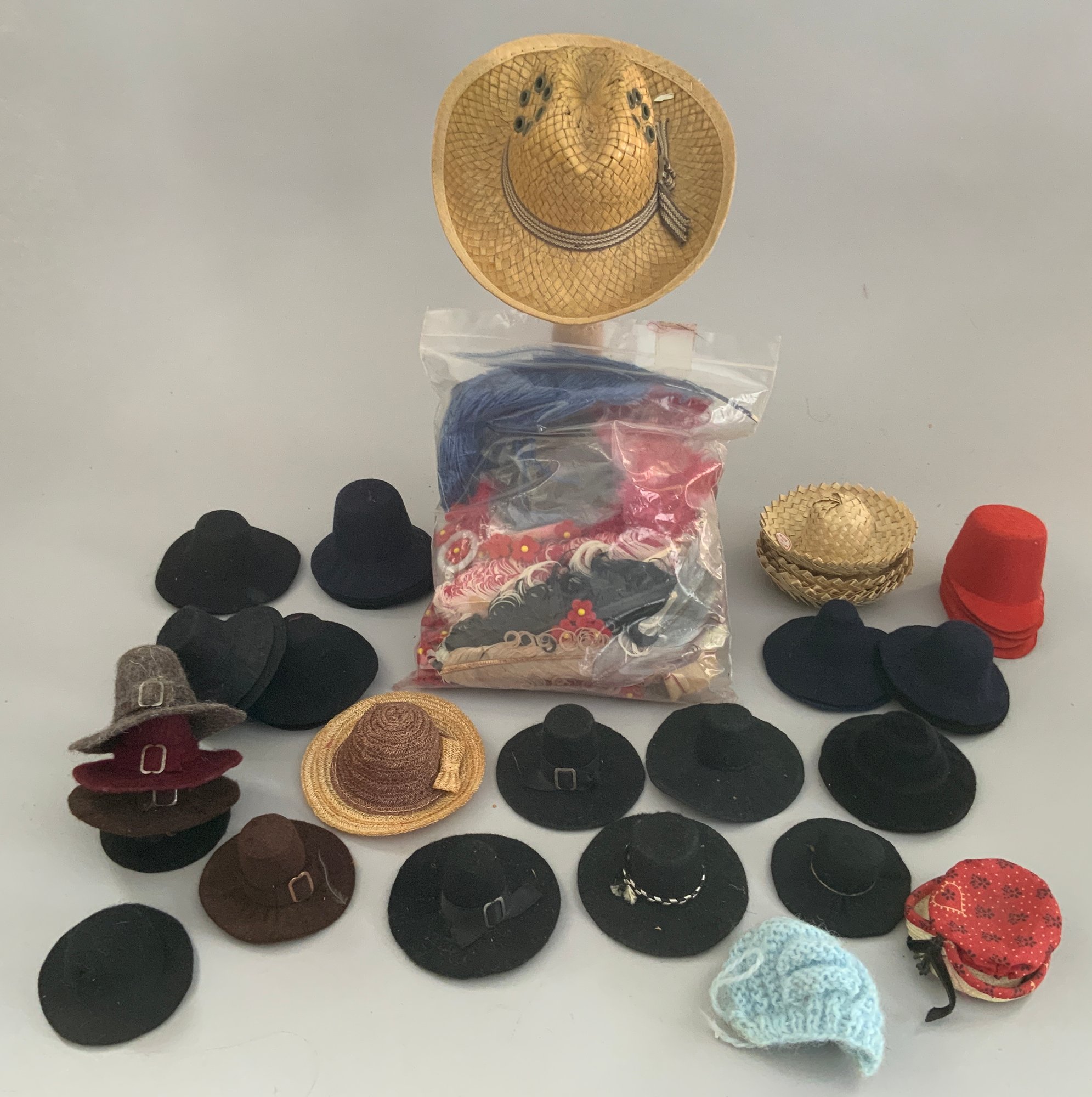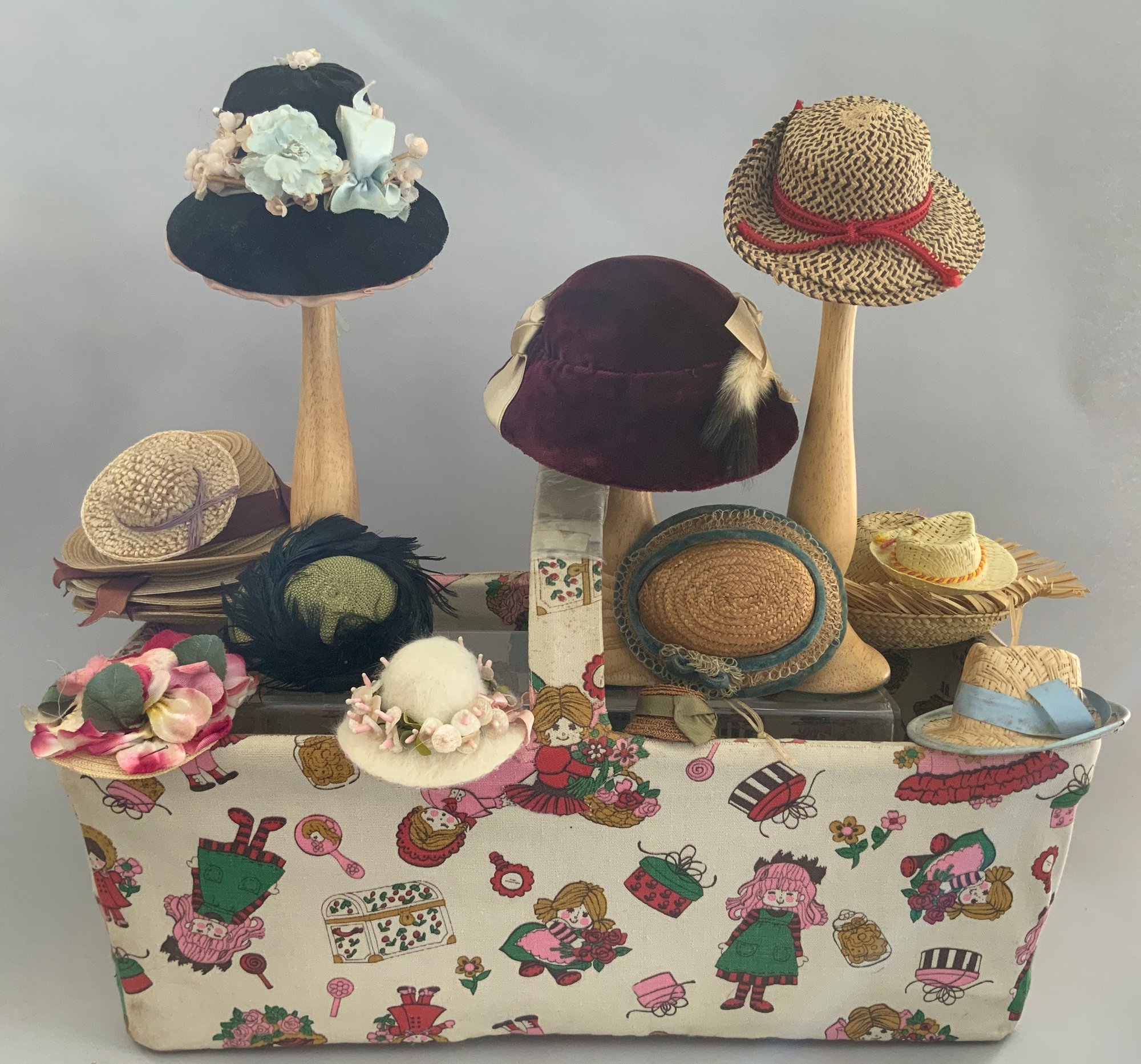 Handled basket full of 40 +/- doll hats, straw, velvet, felt, hat feathers, old and newer