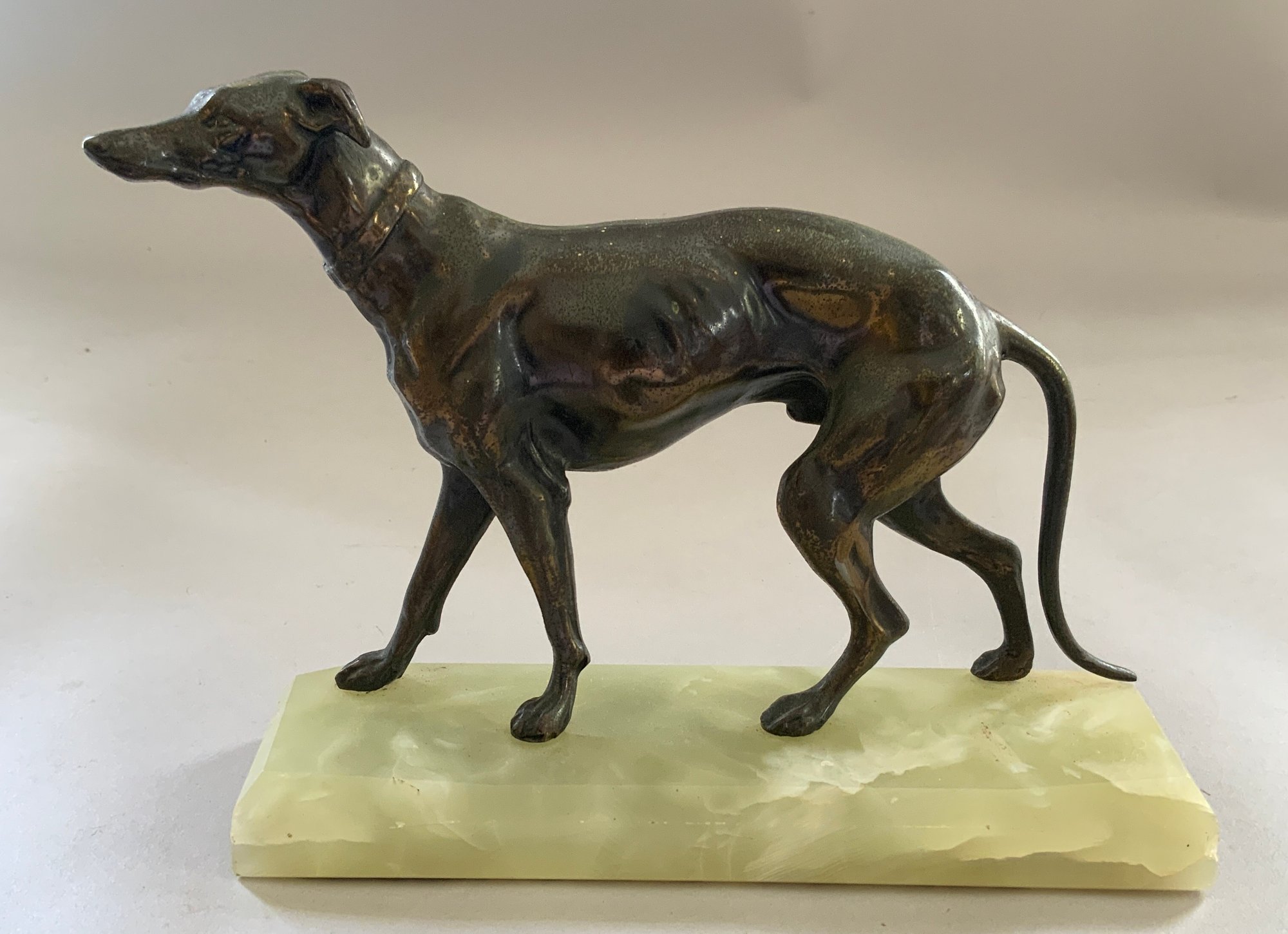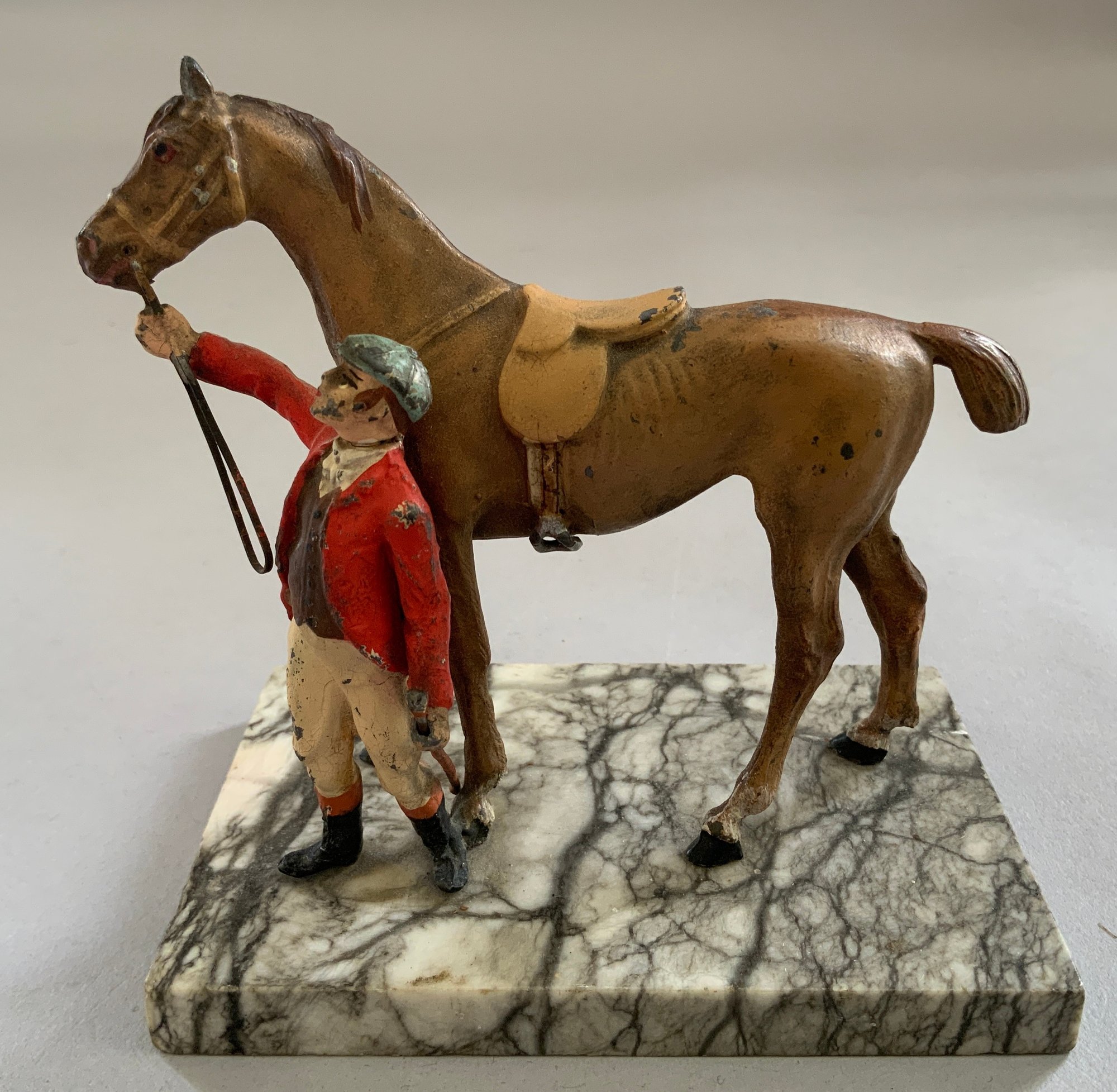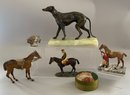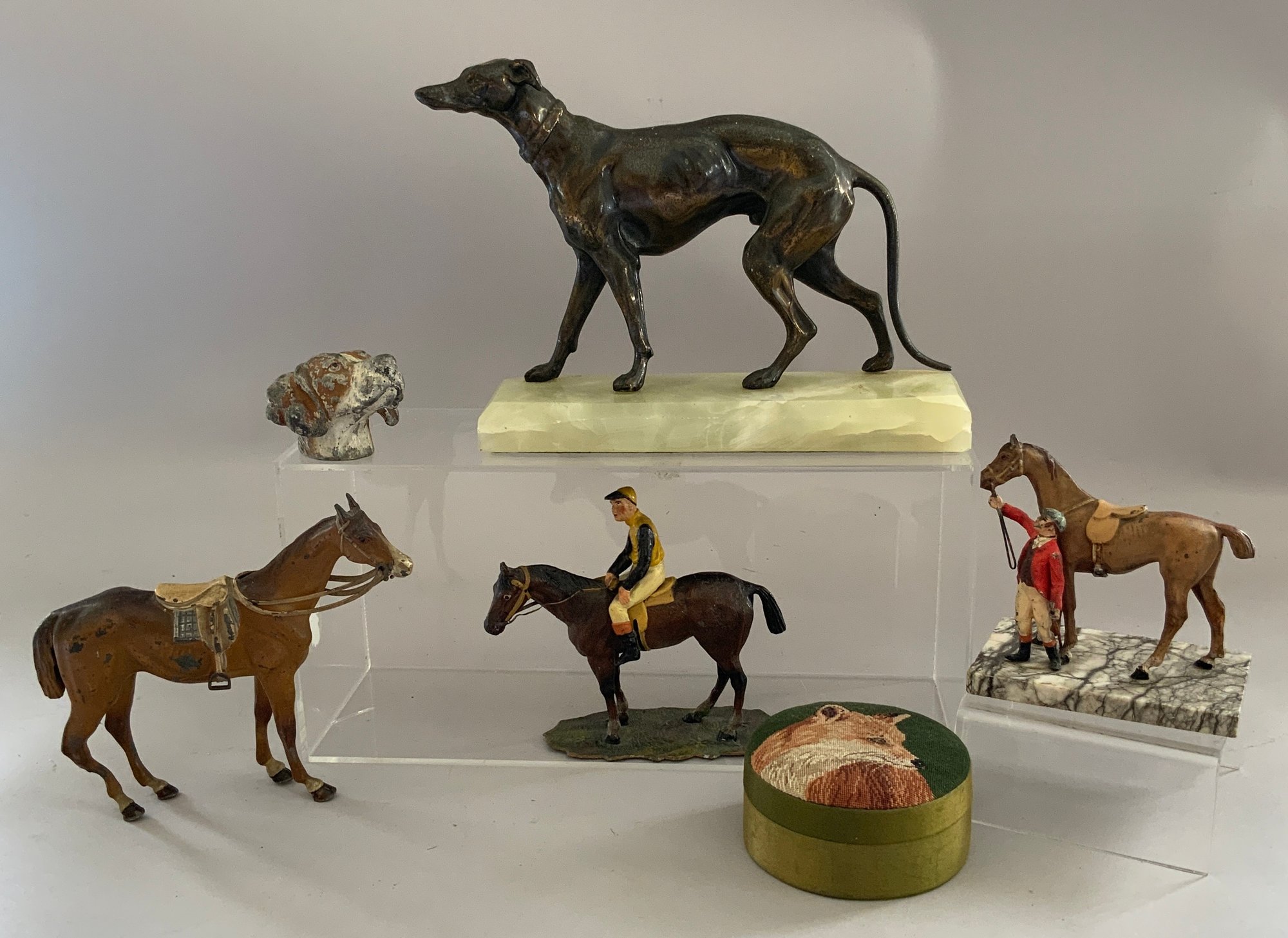 Horses & Hounds Box Lot: Bronze ?, greyhound dog paper weight on a green onyx base, 8 ½”; Vienna Bronze-type (unmarked) Jockey on horse poly-chrome 5 ½”; Horse w/ groom poly-chrome on marble base 4 ½” (Vienna Bronze-type); Cold painted horse casting (as-is) 5 ½”; Hound’s head 2 ½”; & a covered cloth box w/ Petti-point fox head 4”