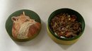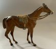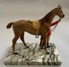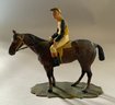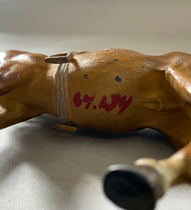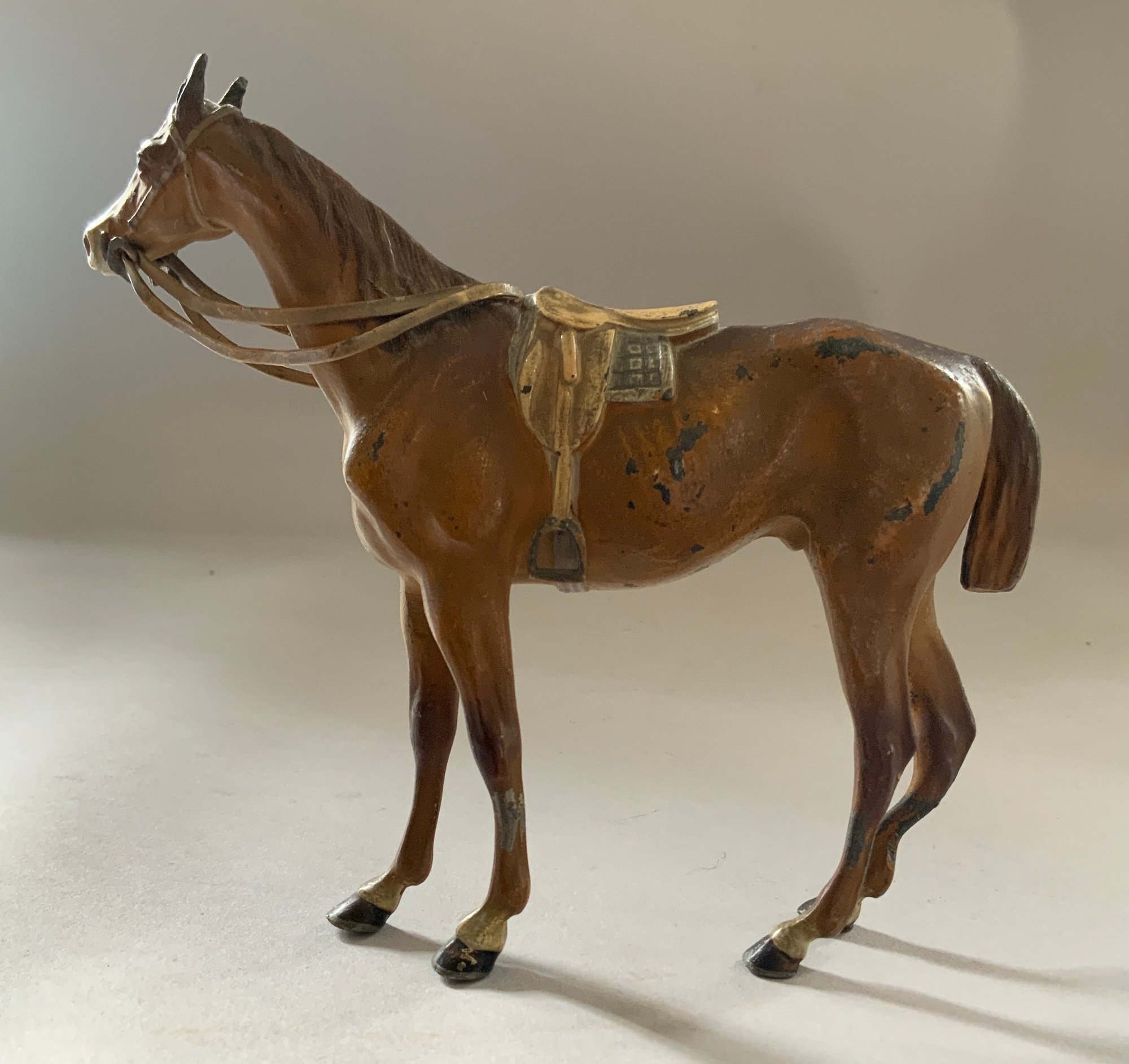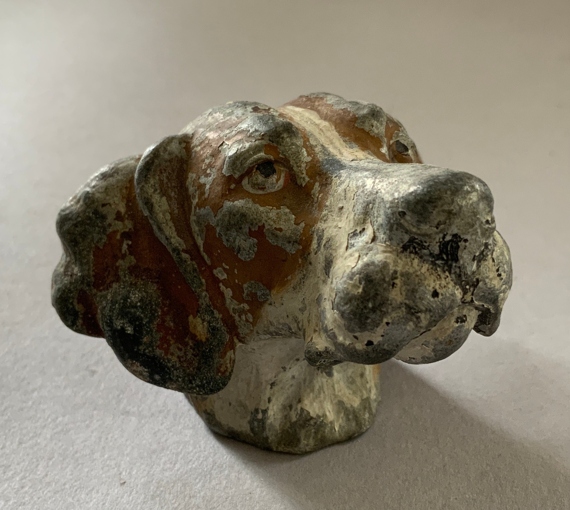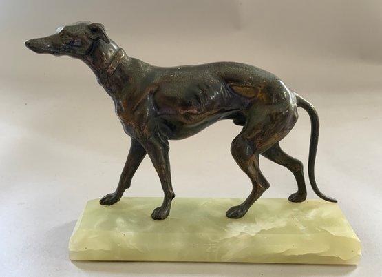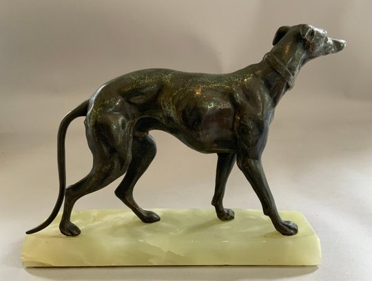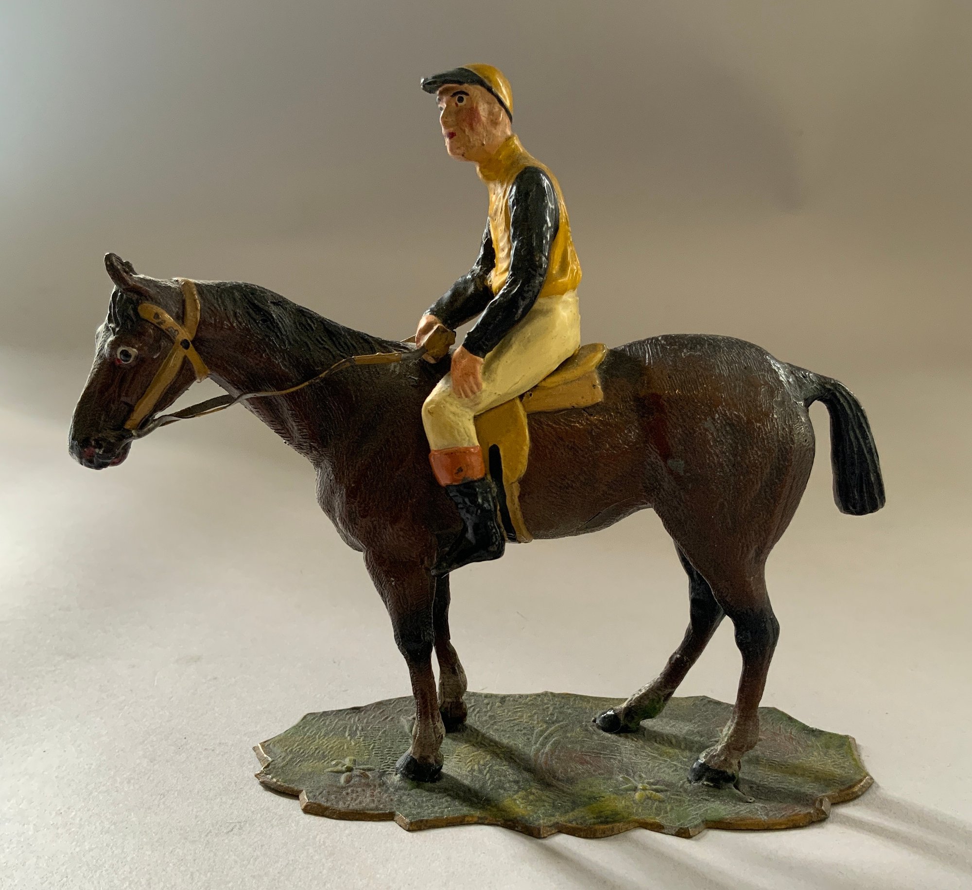 Horses & Hounds Box Lot: Bronze ?, greyhound dog paper weight on a green onyx base, 8 ½”; Vienna Bronze-type (unmarked) Jockey on horse poly-chrome 5 ½”; Horse w/ groom poly-chrome on marble base 4 ½” (Vienna Bronze-type); Cold painted horse casting (as-is) 5 ½”; Hound’s head 2 ½”; & a covered cloth box w/ Petti-point fox head 4”