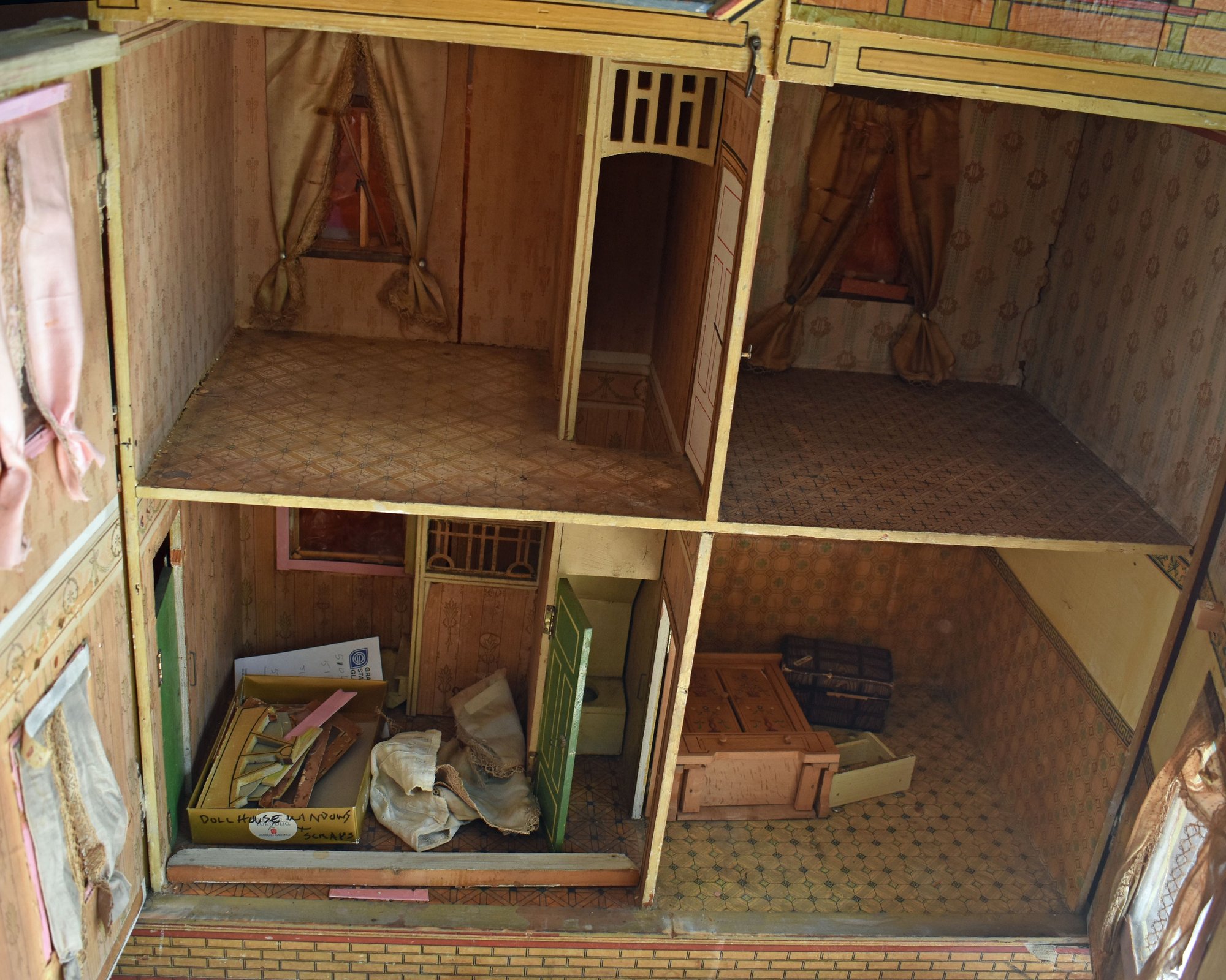 Large Bliss-type 2 ½ story doll house (no mark), 35 ¾”W x 15 ½” D x 36¾” T, wood with litho paper, 2 dormers, side porch on left, front balcony, gable roof, ( paper loss & wear, house as is), few furnishings. Buyer must pick up or arrange for shipping