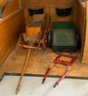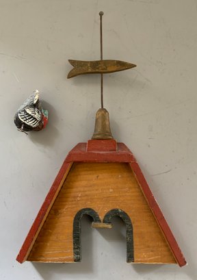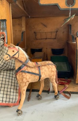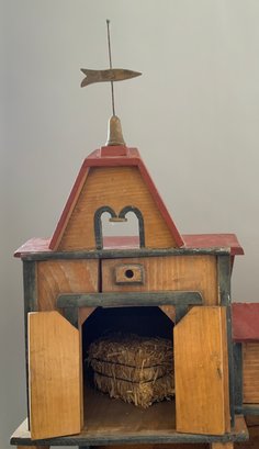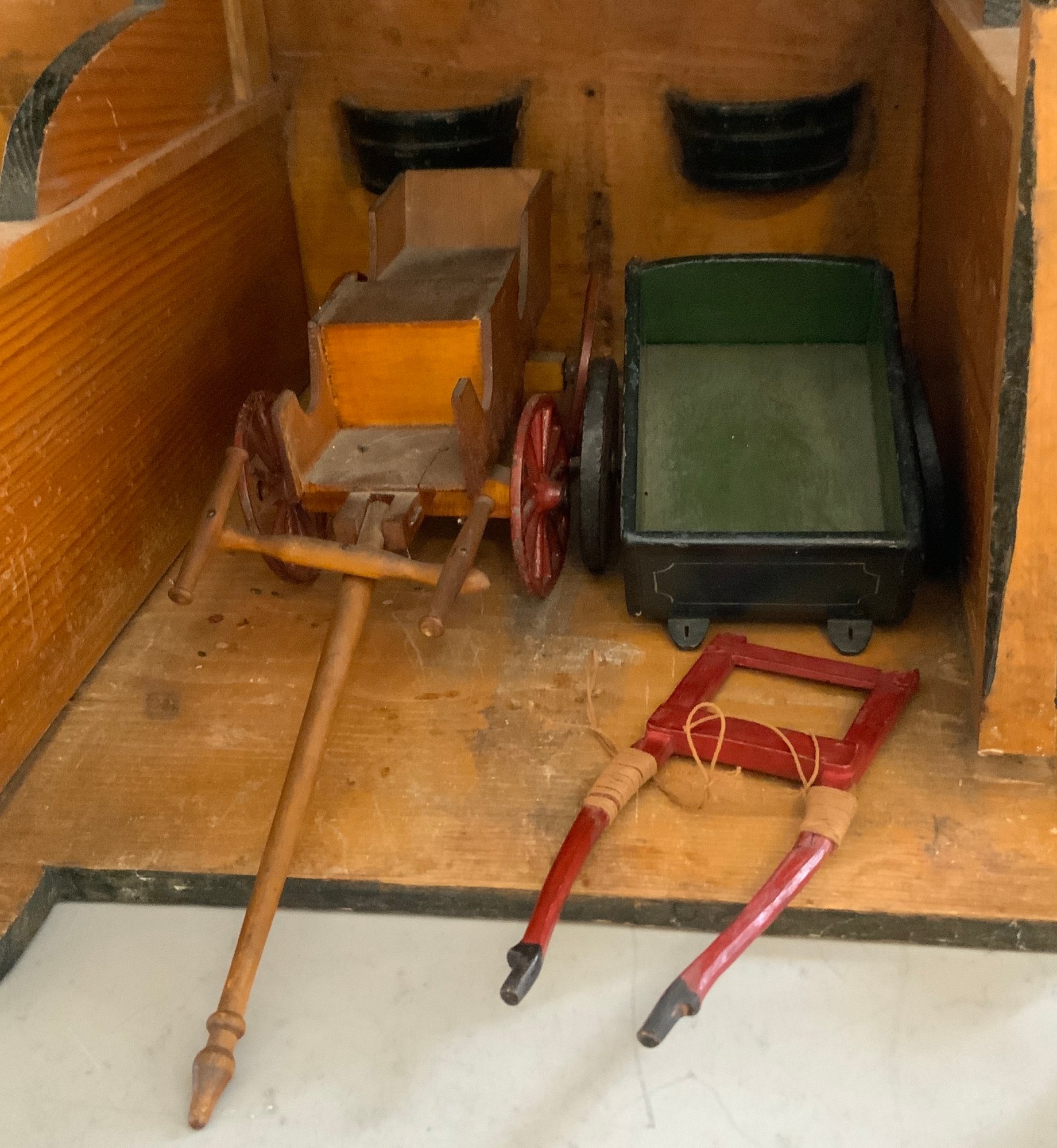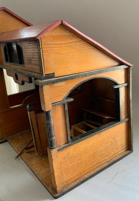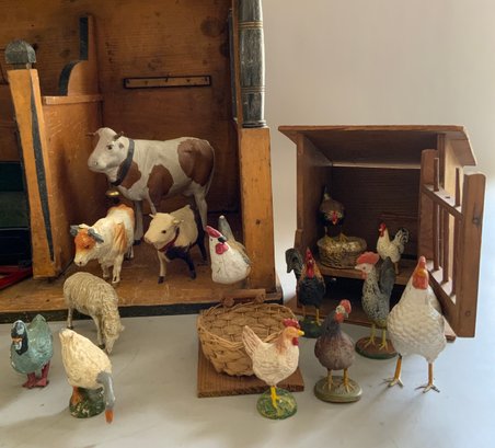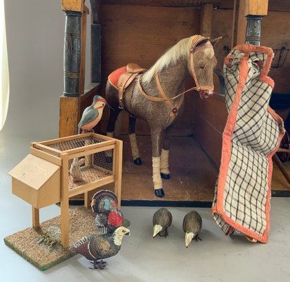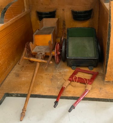 Large Christian Hacker? Stable 28 ½” L x 16” W x 33”T (top of weathervane), with chicken coop, rabbit hatch, weather vane, 3 bays with hay loft, red roof with natural color side, horse drawn 2 wheel cart, 4 wheel cart, barnyard animals including cows, and assorted fowl, condition appropriate with age, ITEM should be picked up or buyer arranges shipper