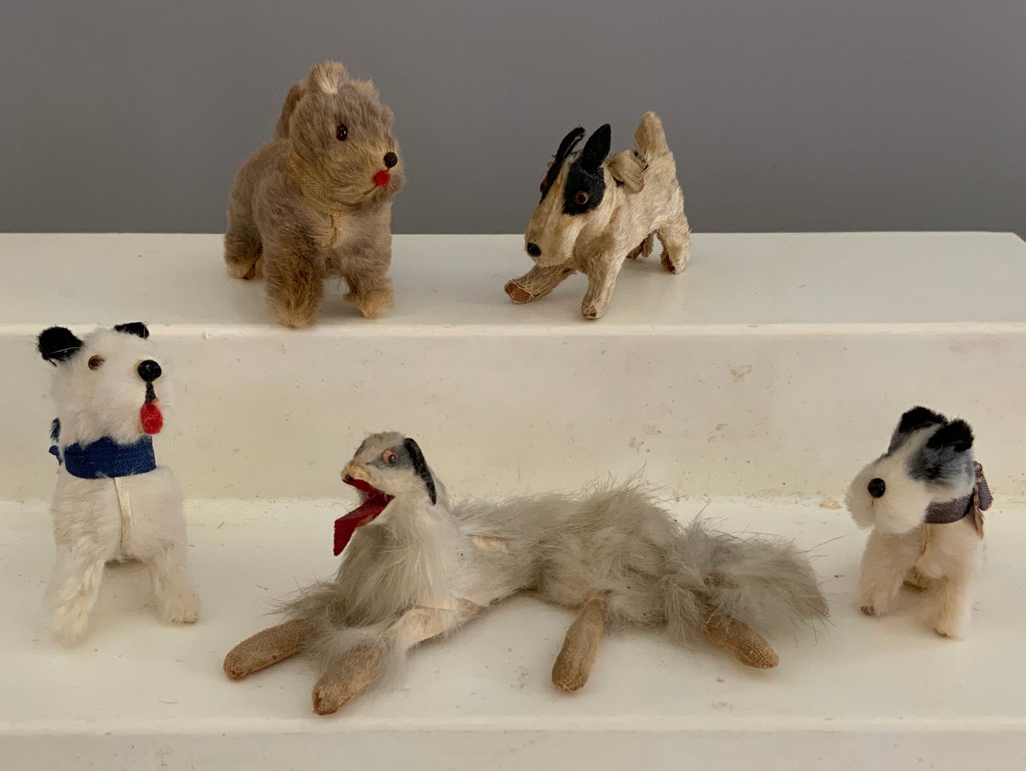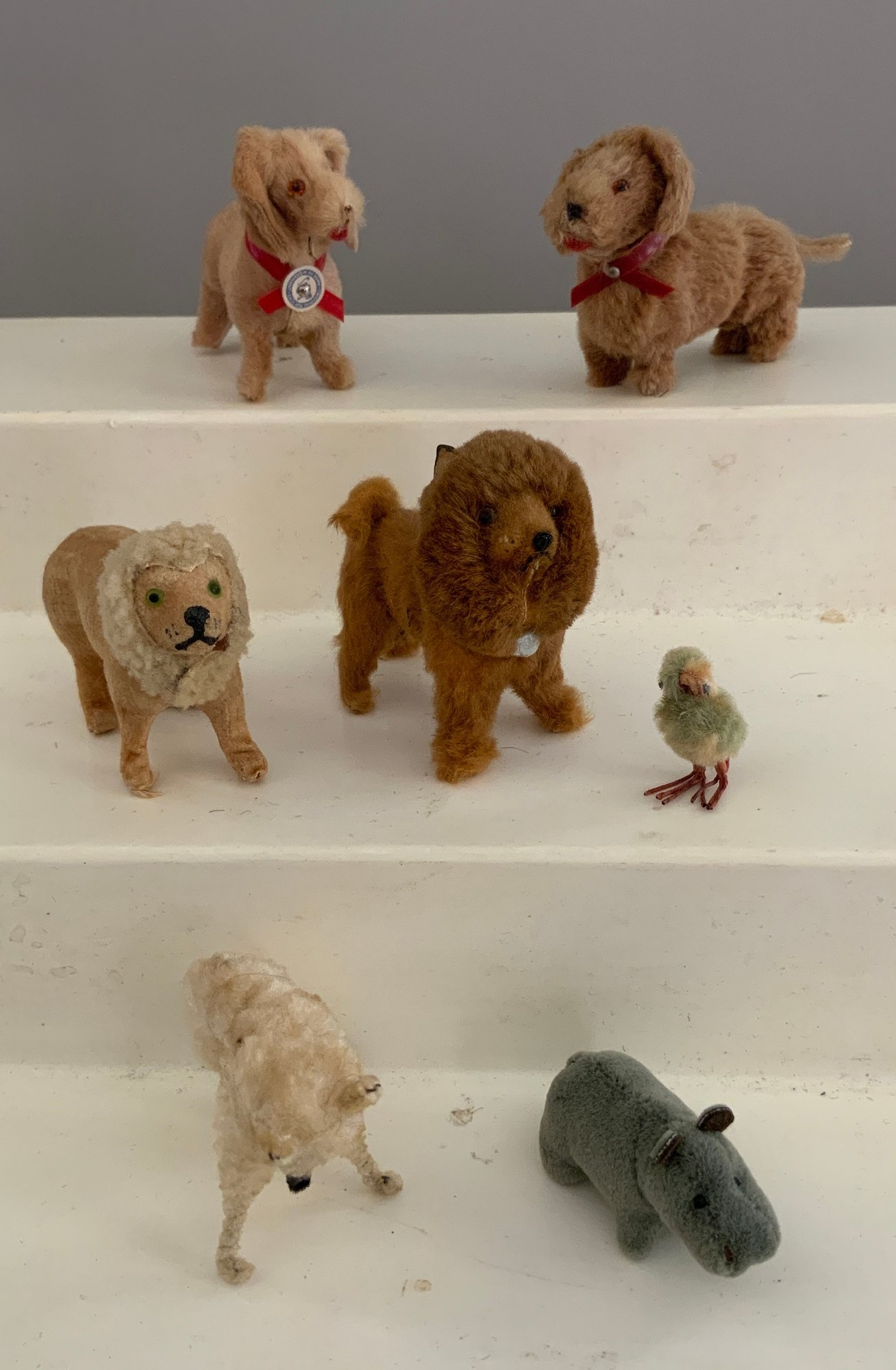 Large lot of miniature animals, dogs, bears, horses, etc., most are fur covered, largest is 4” long, many marked Germany, (some have condition problems)