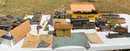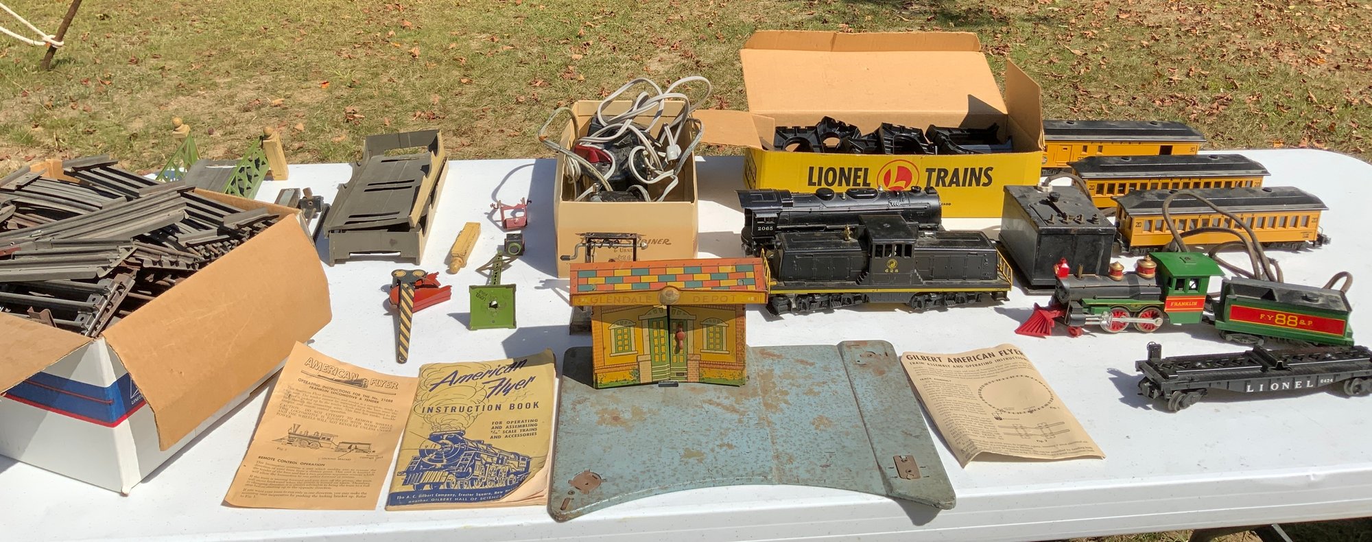 Large lot of various American Flyer train items and Lionel train items. Four train transformers, large bin of tracks and accessories. Trains and cargo cabs, pieces of bridges and various traffic signals, one train station.