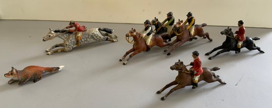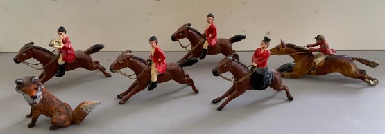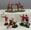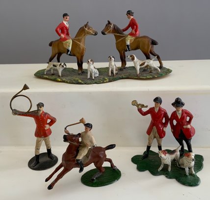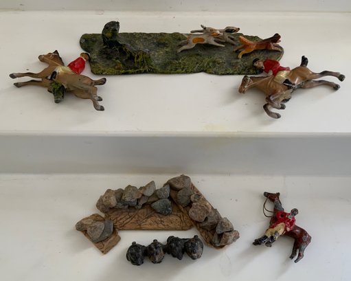 Large lot of various small scale Vienna bronze cold painted miniatures & other figures of fox hunt related animals & hunters in various poises of fox hunt figures