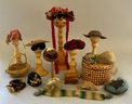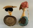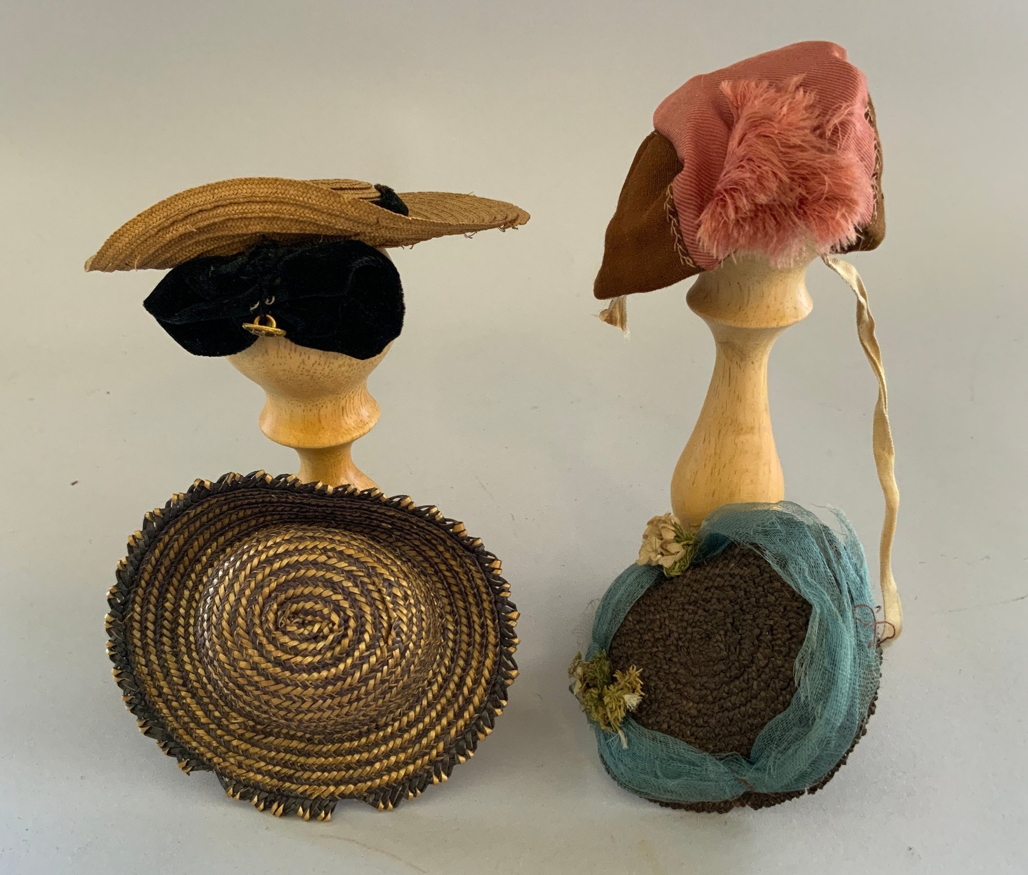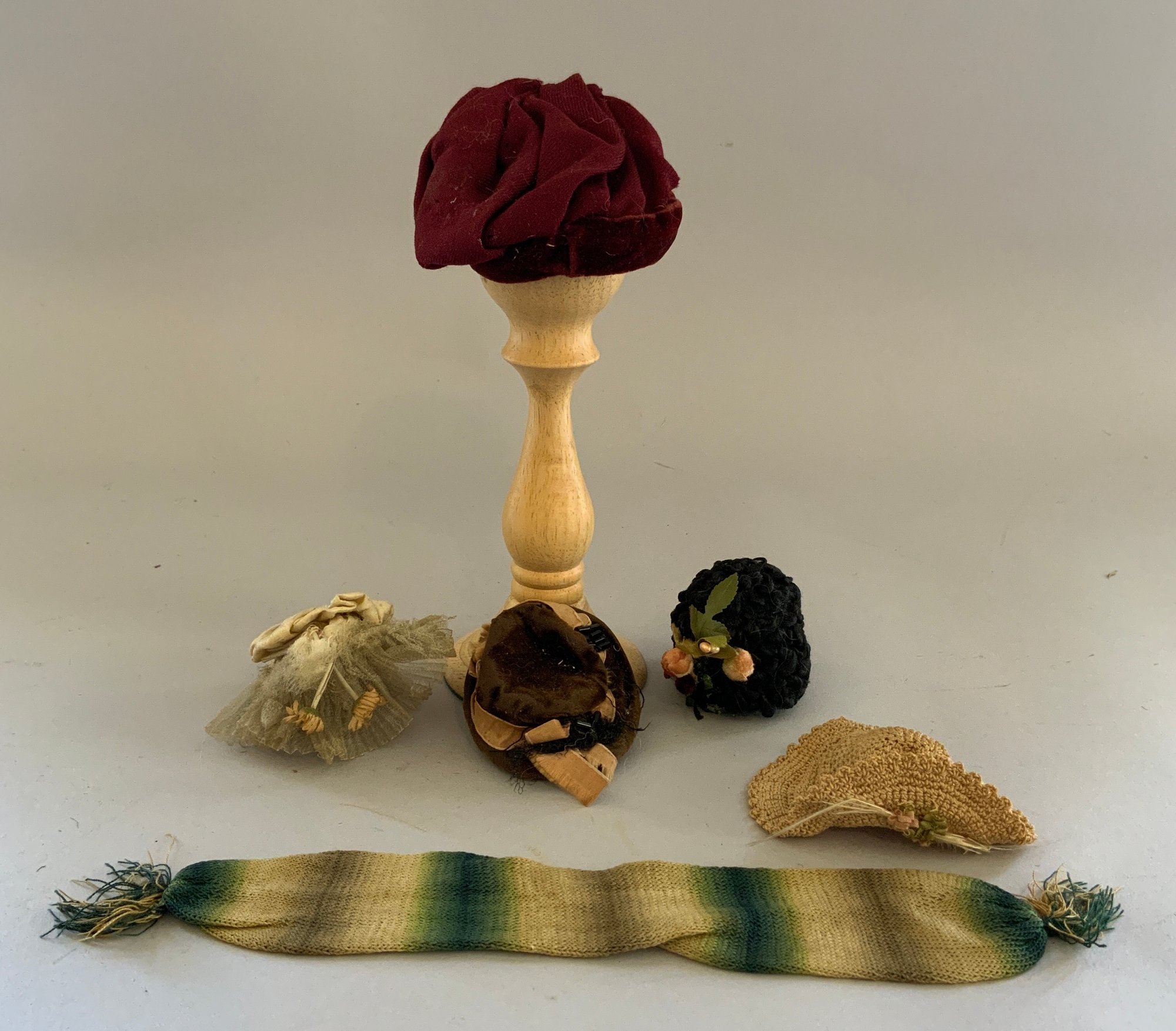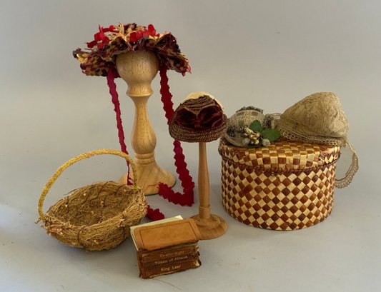 Lot of 13 assorted doll hats, hat box, 4 miniature leather bound books, Twelfth-Night, King Lear, Timon of Athens, & King Henry by Shakespeare (as found)