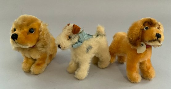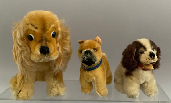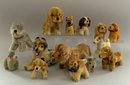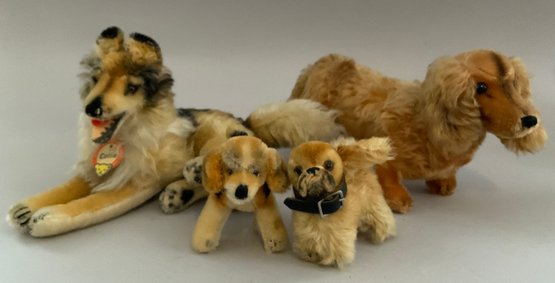 Lot of 14 assorted Steiff dogs, 4” – 11” long, 3 with buttons, played with condition