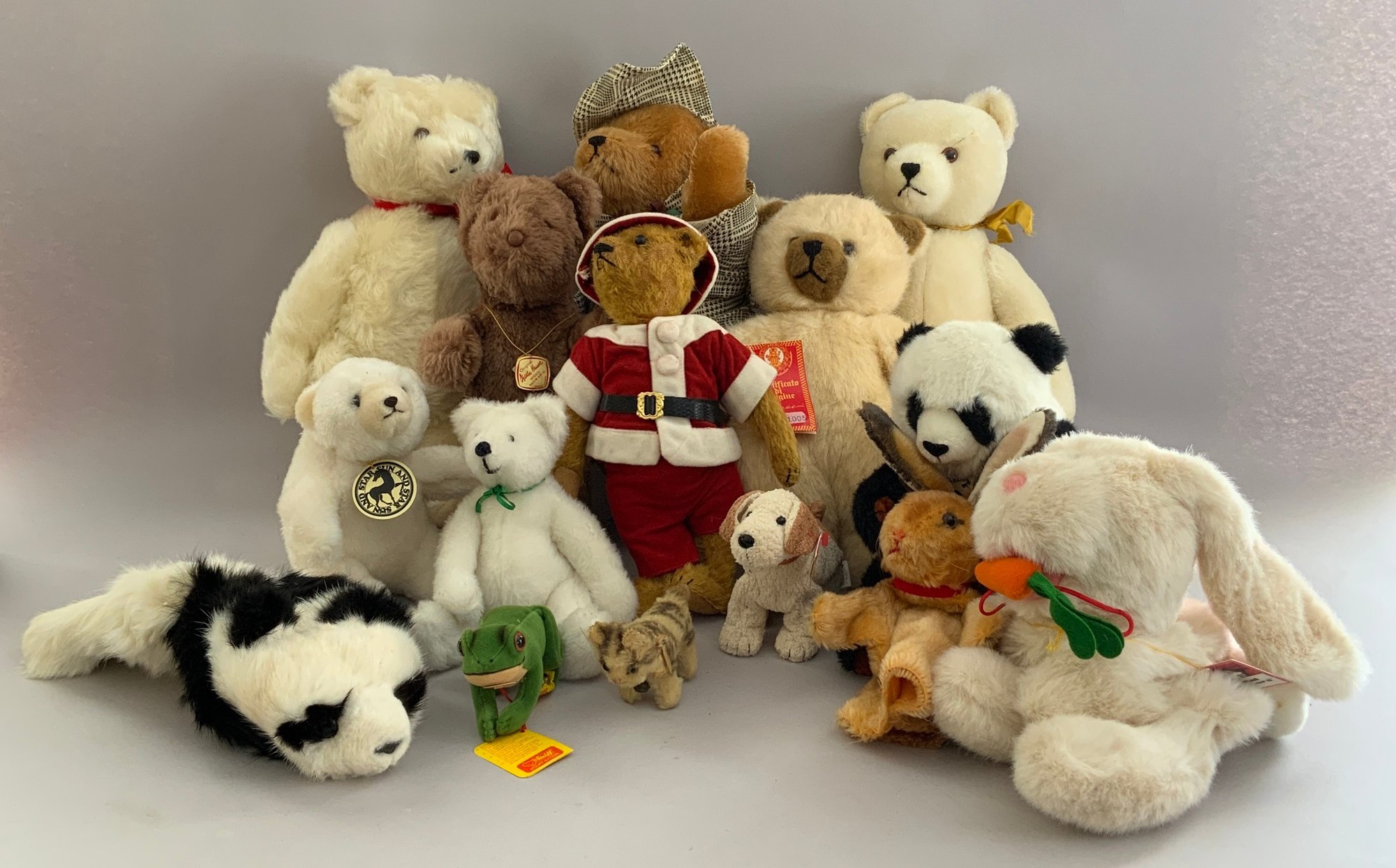 Lot of 15 assorted stuffed animals, 4 – Steiff, 1 – Lenci, 1 – Kathe Kruse, 3 – Herman, etc., played with condition