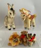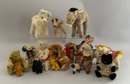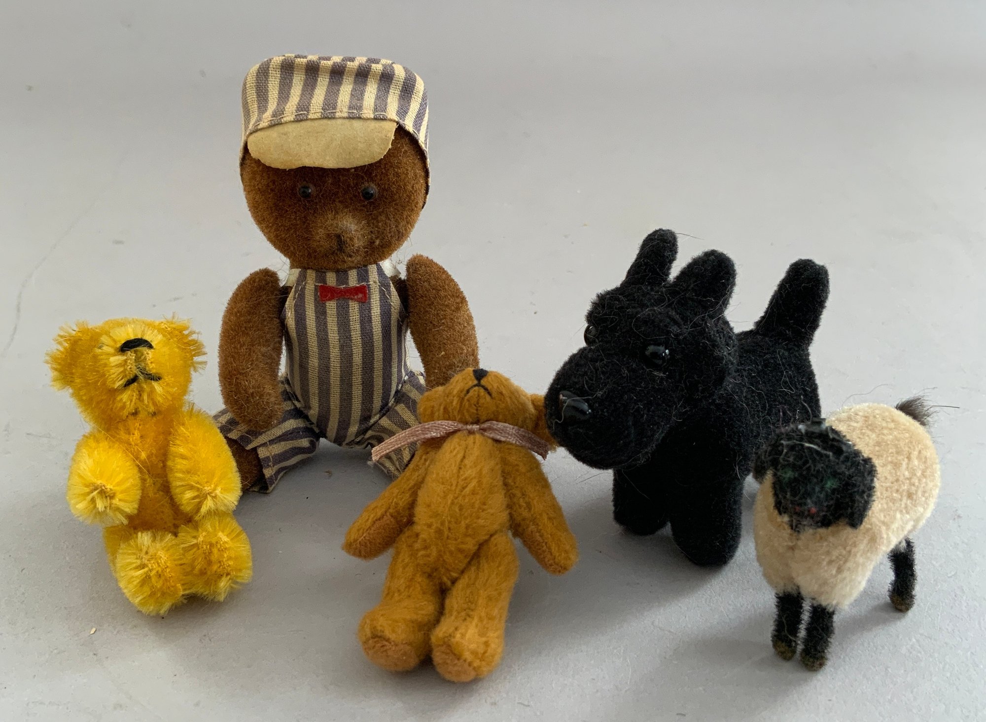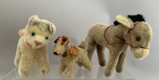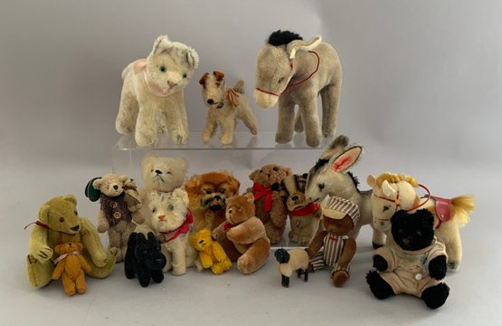 Lot of 16 assorted mostly mohair Steiff animals 2 ½” -10”, no buttons, cats, dogs, bear, donkey, etc.