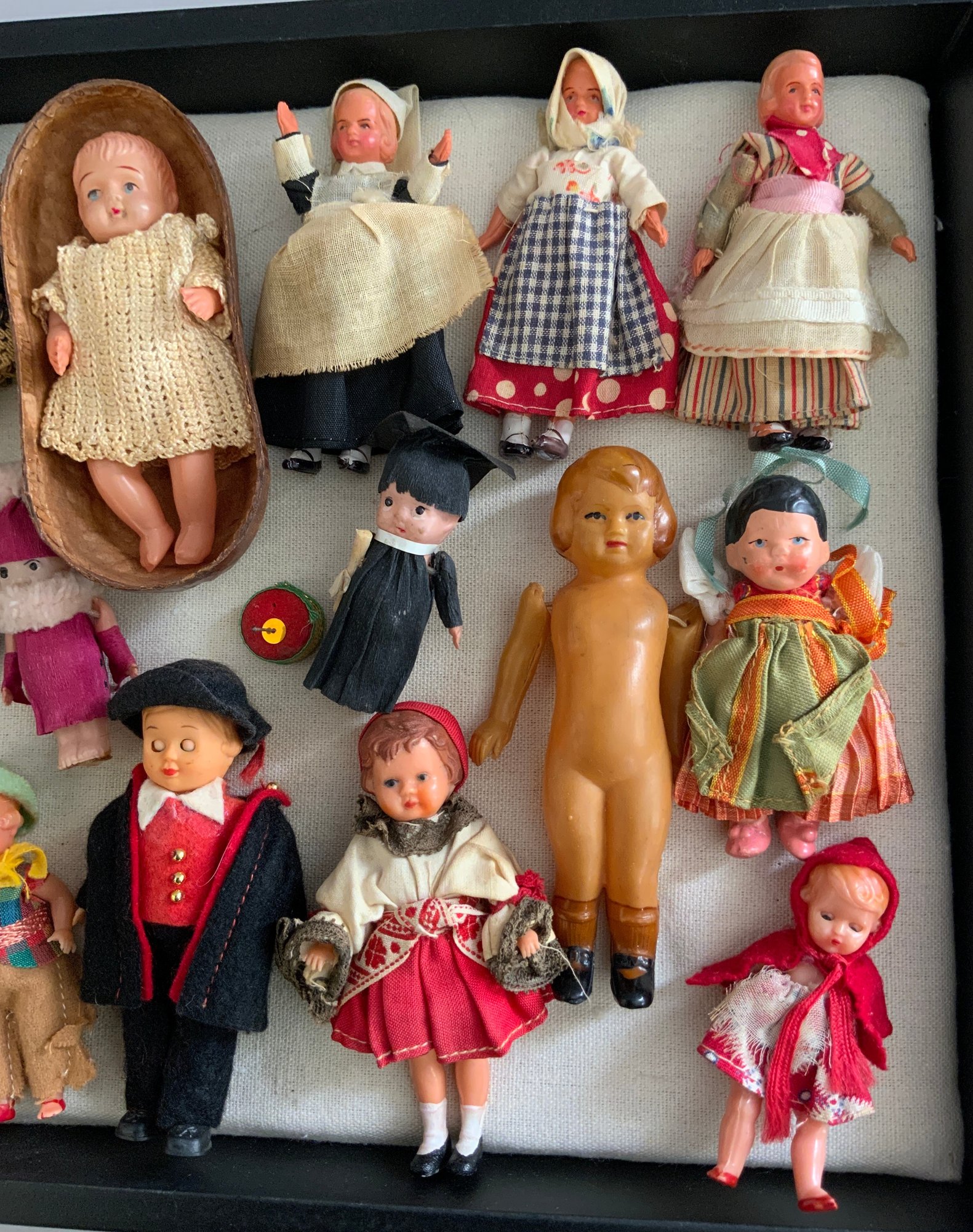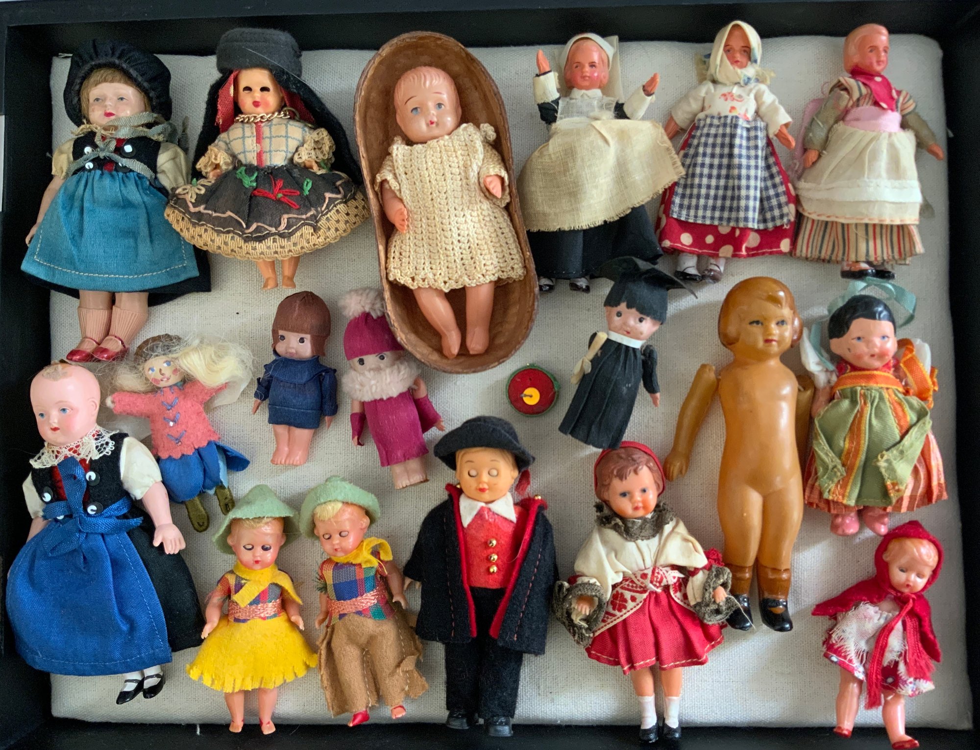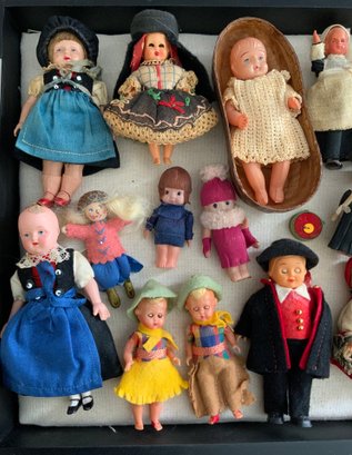 Lot of 18 small celluloid & plastic dolls, 2 ¼” – 4 ½” long, various outfits