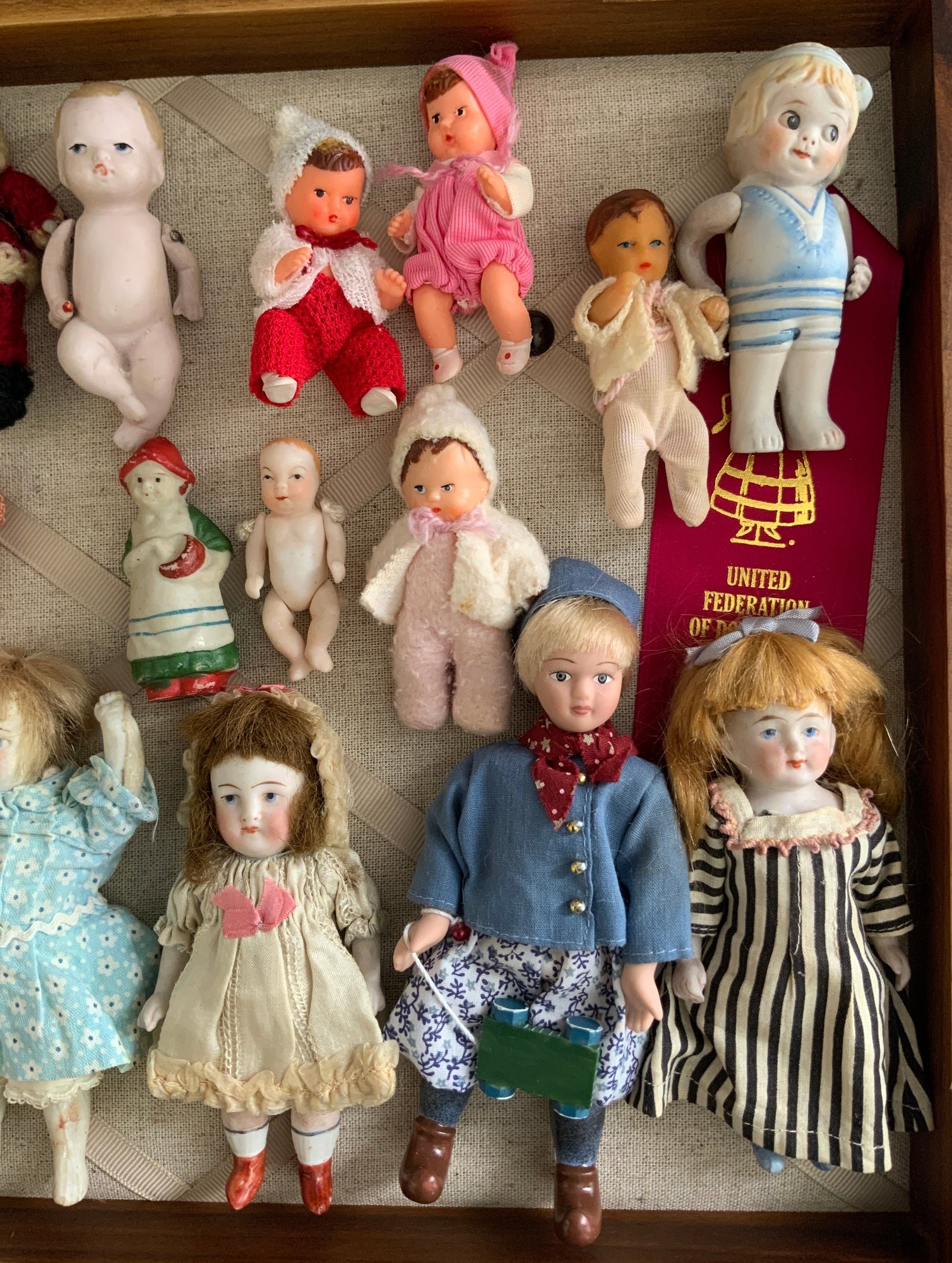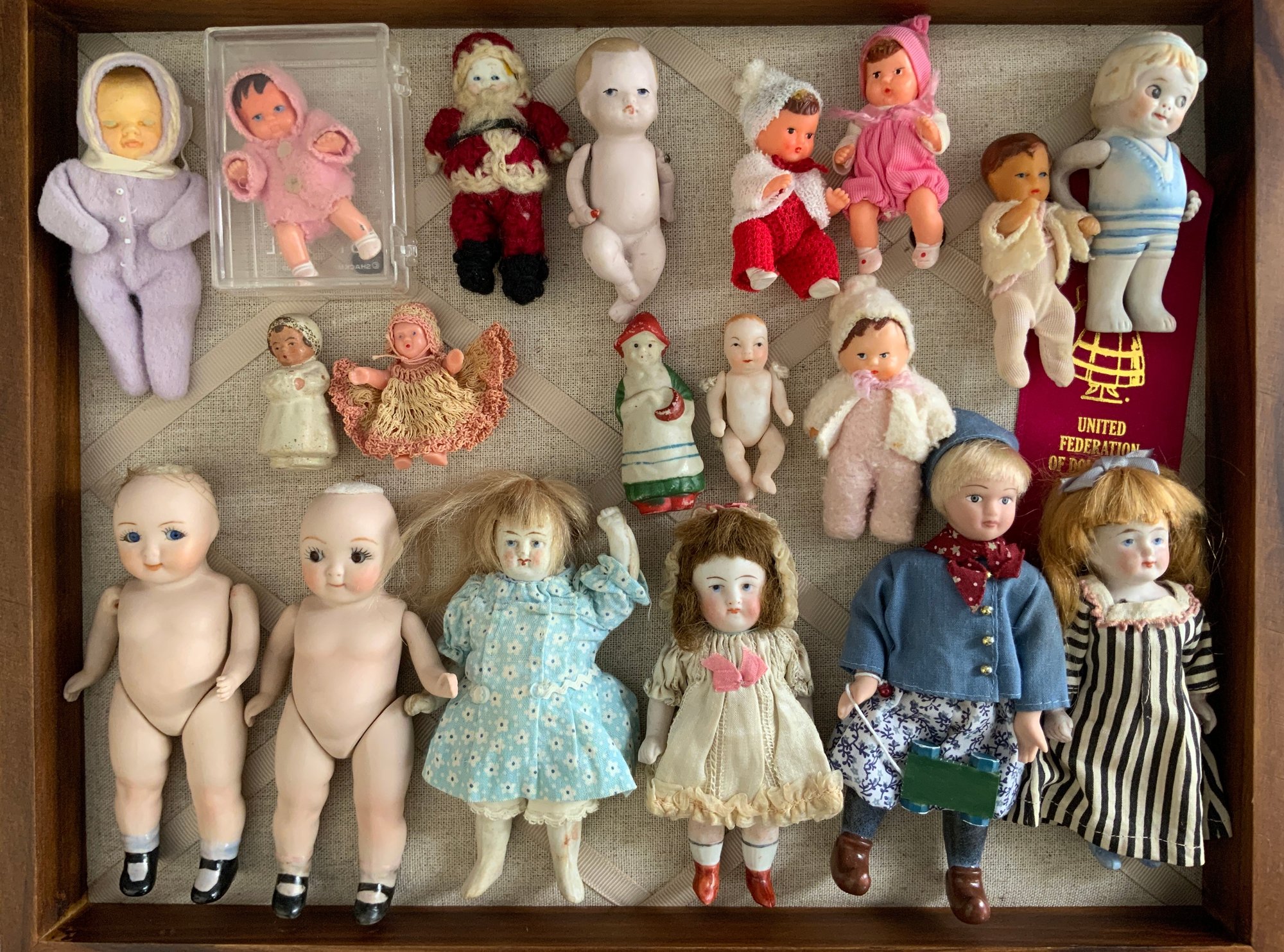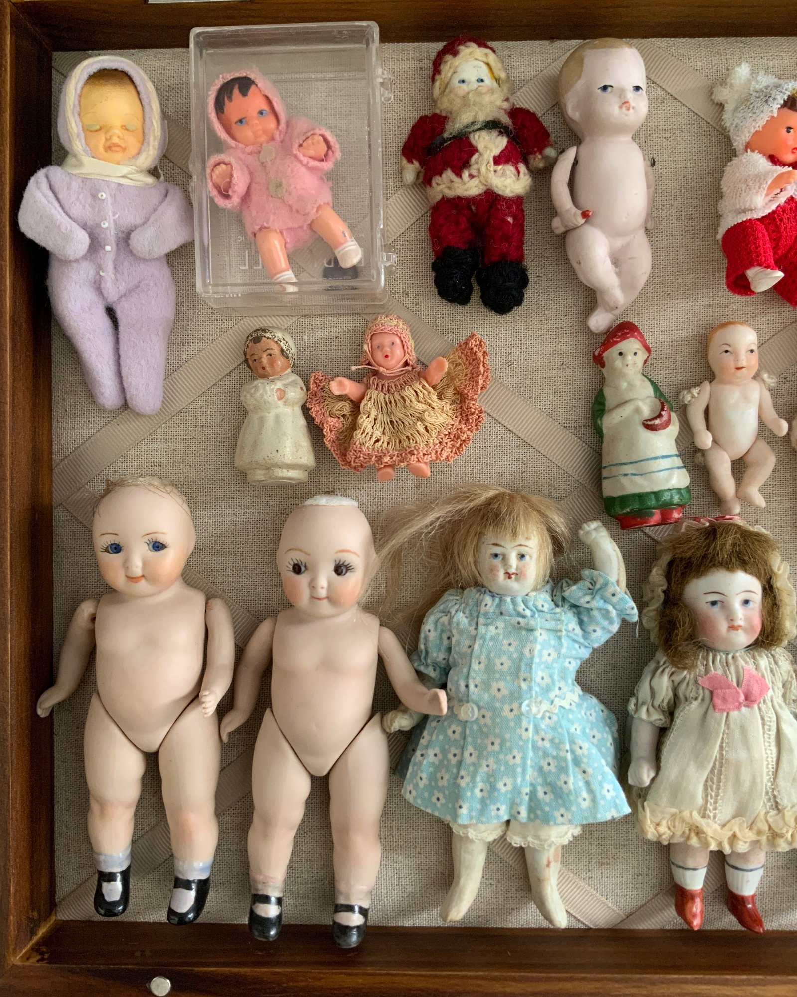 Lot of 19 small all bisque, plastic, repro dolls.