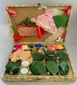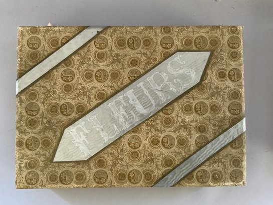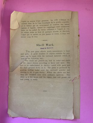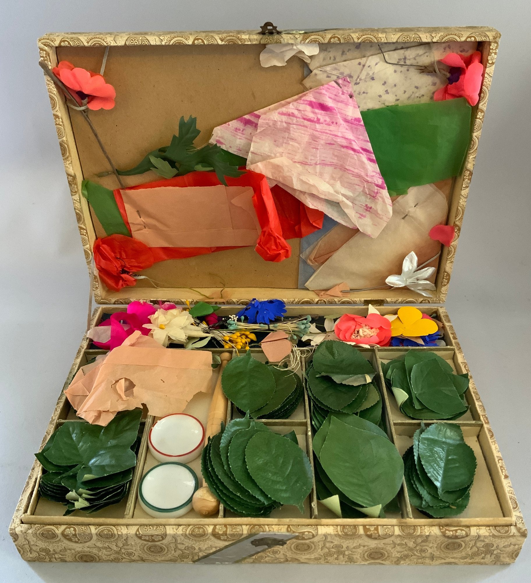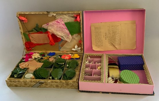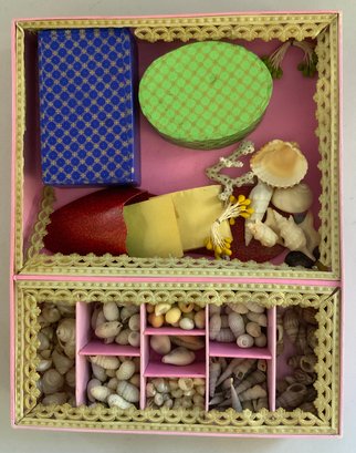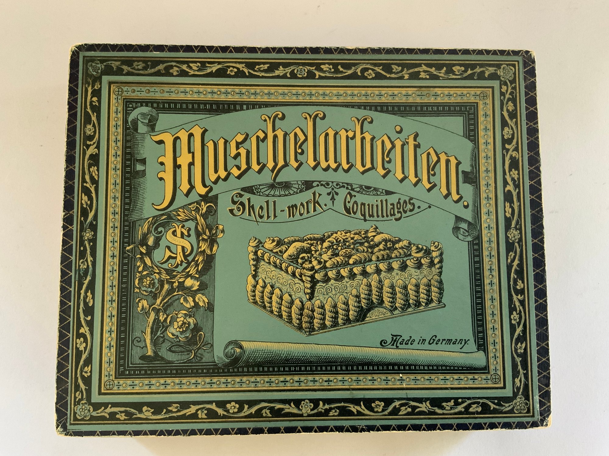 Lot of 2 – 1 – French flower making kit in original box labeled “Fleurs”, 11” long with interior divided trays with paper leafs & flowers, & 1 – Muschelarbeiten Shell Work Coquillages game, made in Germany, 10 ½” long, shells are put into little boxes for presents, original box