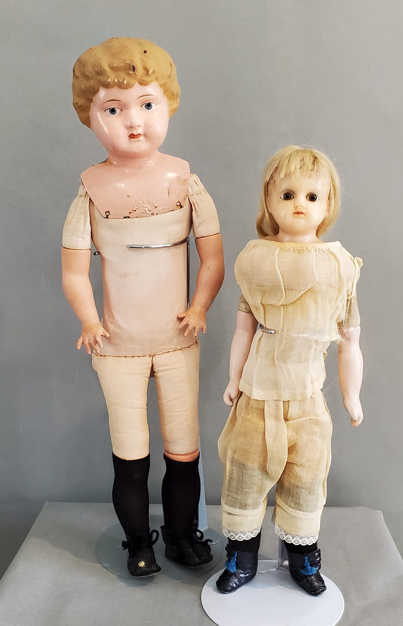 LOT OF 2 ANTIQUE DOLLS - 1-17" METAL HEAD, CLOTH BODY W/ COMPOSITION ARMS & LEGS, BLONDE MOLDED HAIR, BLUE PAINTED EYES, 1- 14" REINFORCED WAX, CLOTH BODY WITH WAX-OVER ARMS & LEGS, ORIGINAL BLONDE WIG, BROWN GLASS EYES, NO REPAIRS OR REWAX