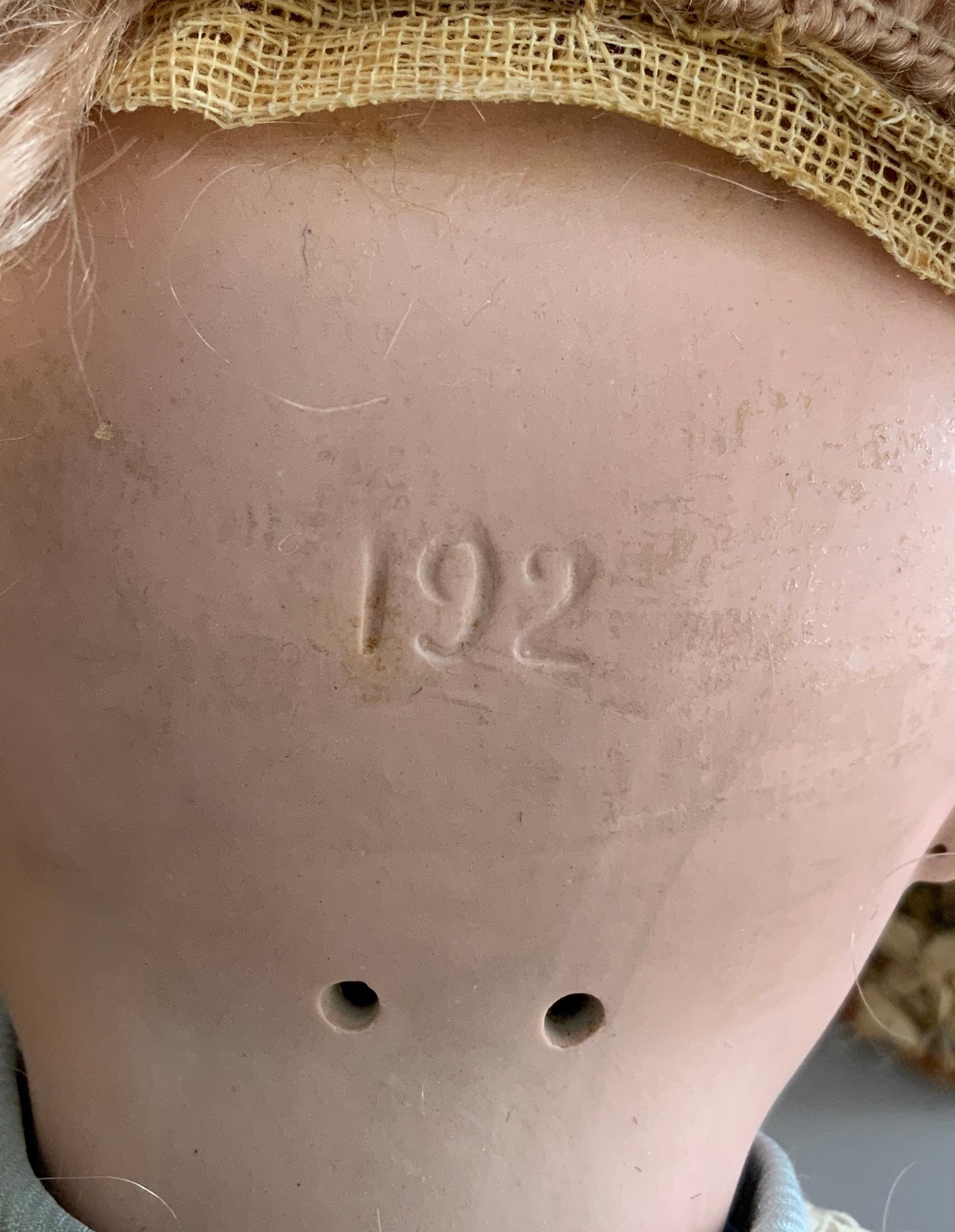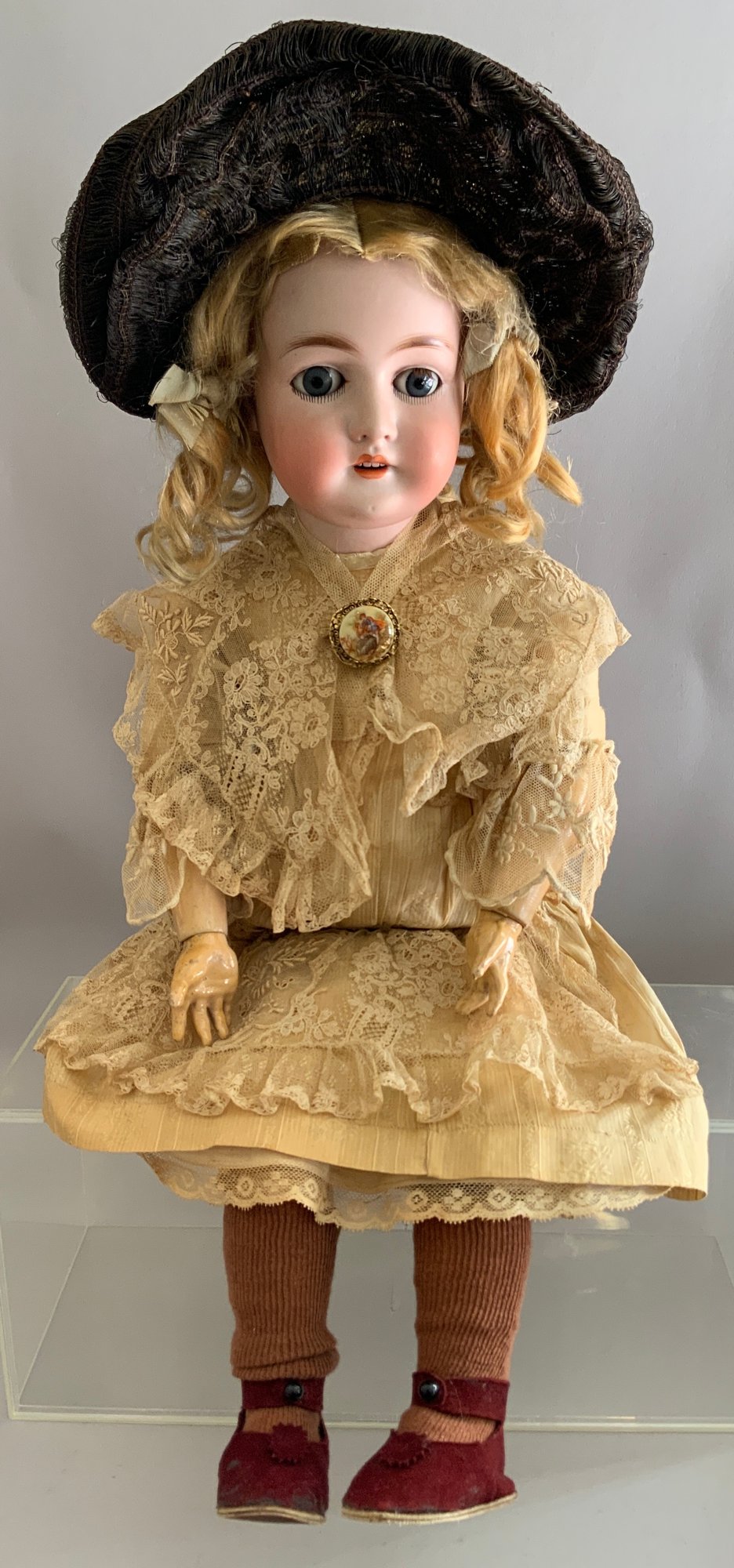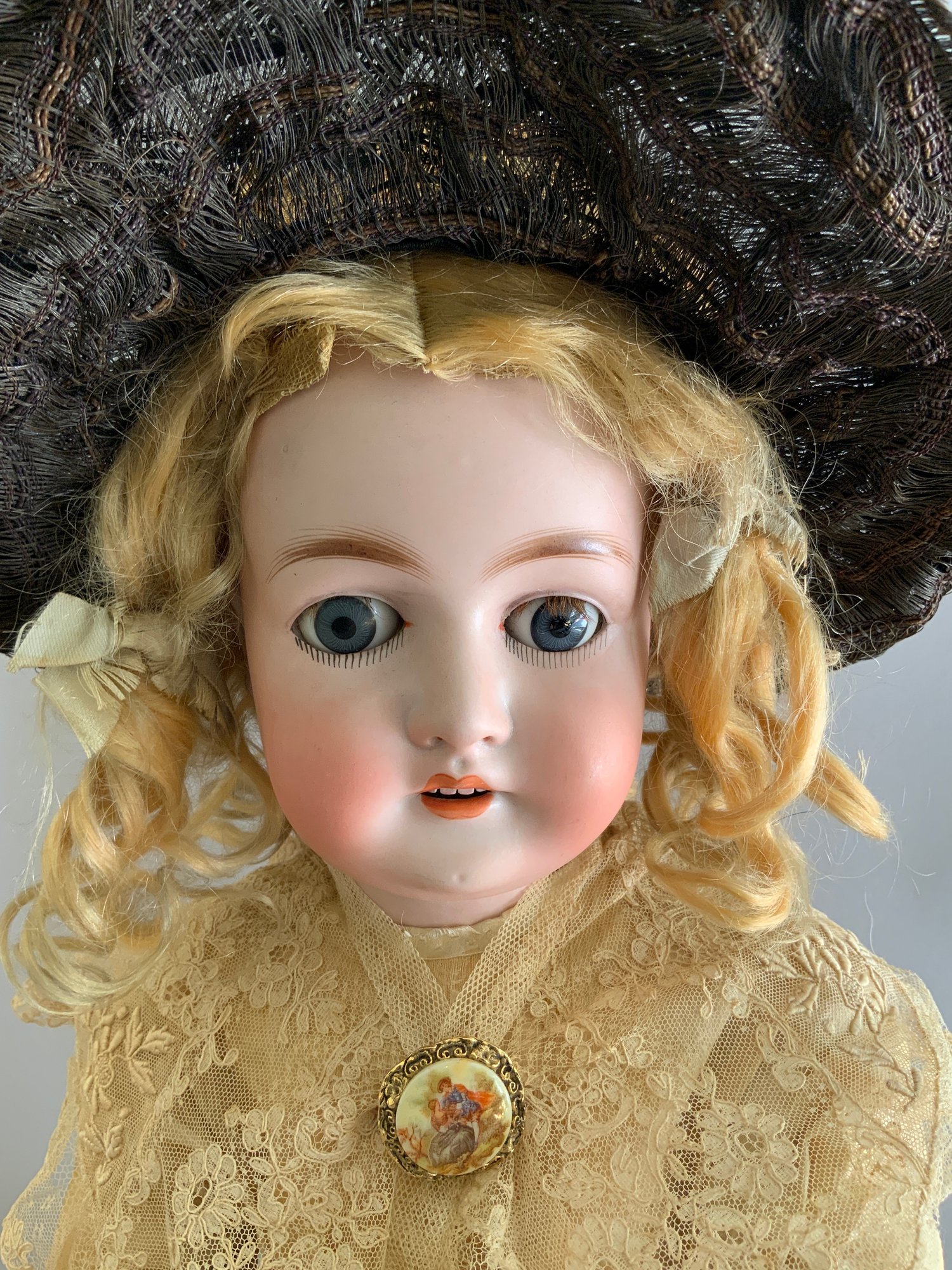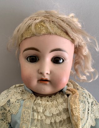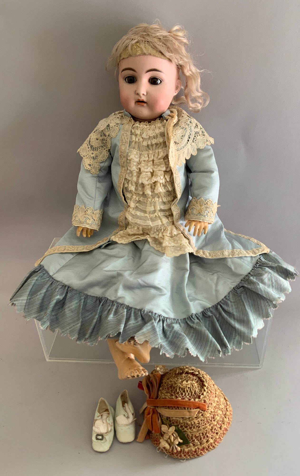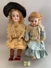 Lot of 2 - 26” Bisque Queen Louise 305, Blue glass sleep eyes, OM with teeth, blonde mohair wig, BJCB, white lace dress, 23” bisque 192 K*R, brown glass sleep eye, OM with broken teeth, PE, blonde mohair wig, BJCB, blue walking suit