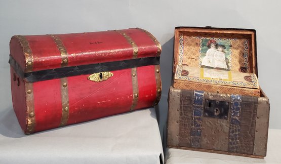 LOT OF 2 DOLL TRUNKS - 1- RED TRUNK W/ YELLOW INTERIOR, 12" X 8" X 7 1/4", MISSING HANDLES, 1- METAL TRUNK W/ WOOD TRIM, PAPER INTERIOR W/ PICTURES OF CHILDREN, 8 1/4" X 3 1/2" X 7 1/4", MISSING HANDLES
