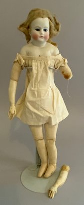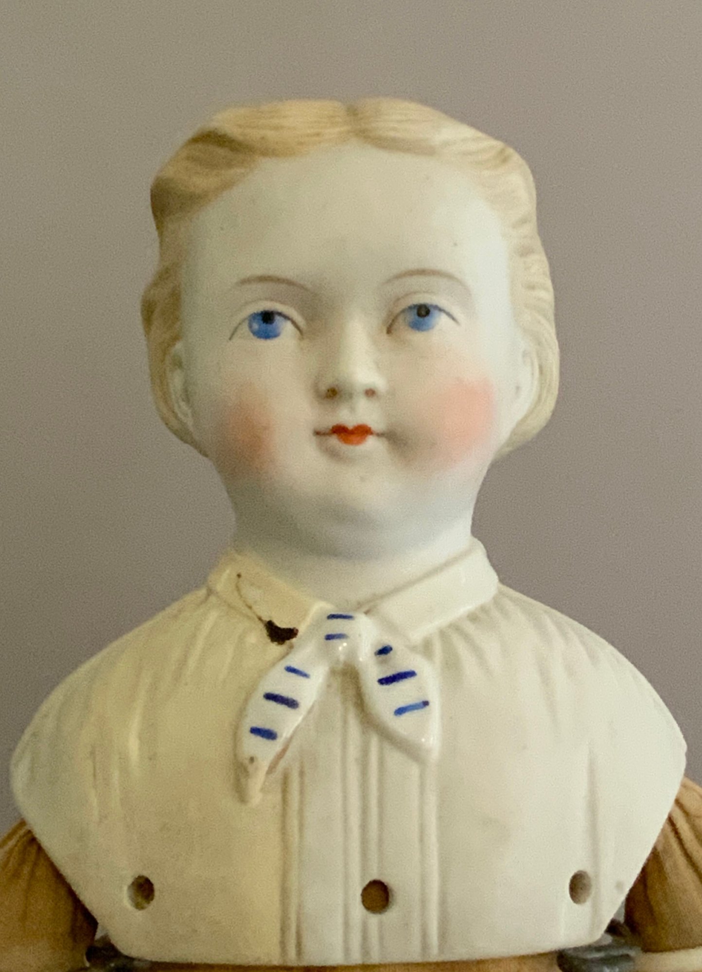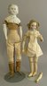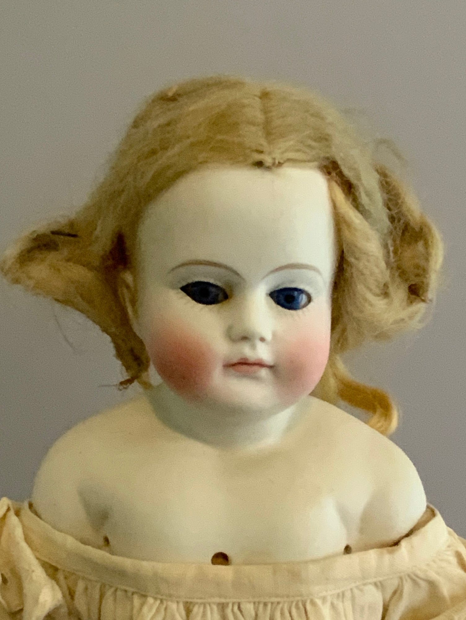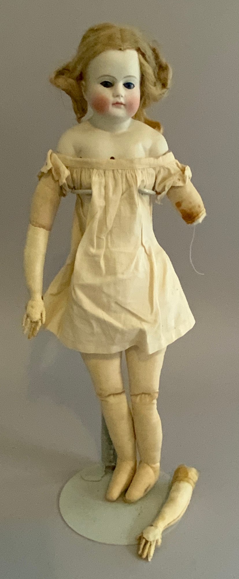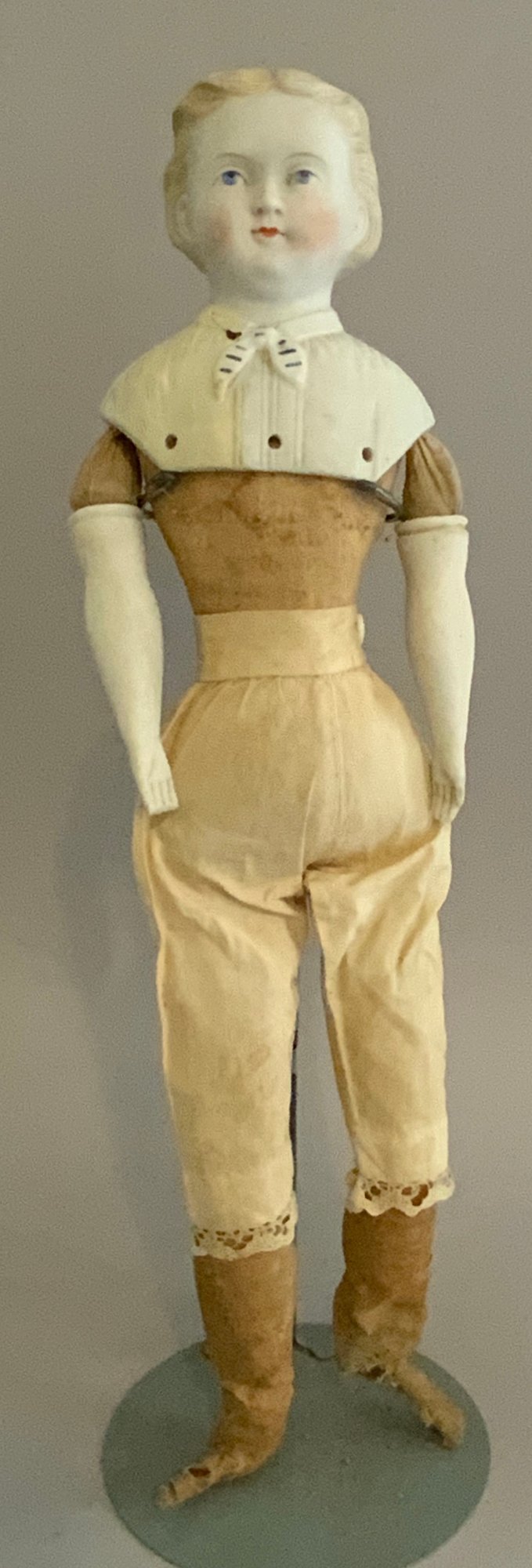 Lot of 2 Dolls - 1 – 18” Parian Amelia Bloomer doll, blonde hair painted features (as is, cloth body problems, left shoulder side front & back has a yellow tint, 1 – 14” Parian shoulder head, blue glass sleep eyes, CM, blonde mohair wig, cloth body with leather arms (1 detached)