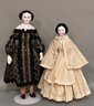 LOT OF 2 GERMAN CHINA HEAD DOLLS - 1- 24", BLACK HAIR, BLUE EYES, CLOTH BODY W/ LEATHER ARMS, GREEN & BLACK DRESS, 1- 20", BLACK HAIR, BLUE EYES, CLOTH BODY W/ CHINA ARMS & LEGS (BOTH LOWER LEGS ARE MISSING), PRINTED COTTON DRESS