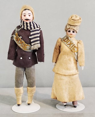 LOT OF 2 GERMAN DOLL HOUSE DOLLS - 1- GENTLEMAN, 6 1/4", BROWN PAINTED EYES, CLOTH BODY / BISQUE LOWER ARMS & LEGS, ORIGINAL CLOTHES, 1- LADY, 5", BROWN GLASS STATIONARY EYES, ORINGINAL MOHAIR WIG, CLOTH BODY W/ BISQUE LOWER ARMS & LEGS, ORIGINAL CLOTHES