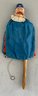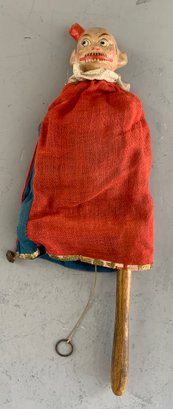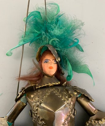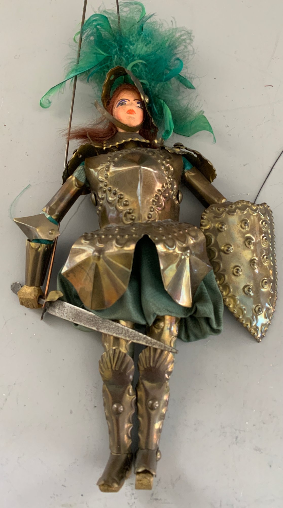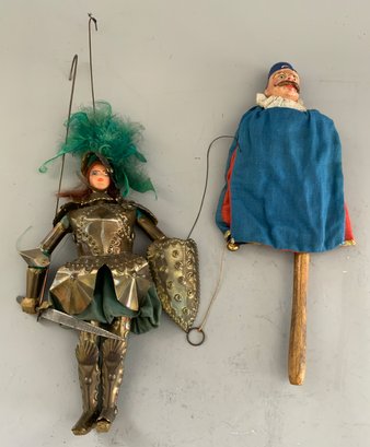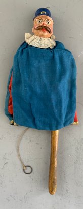 Lot of 2 – 1 - 12 ½” Happy Holigan paper mache Topsy turvey clown and policeman on a handle toy, pull string flips the puppet between the clown & policeman & 1 – 9 ½” knight in armor puppet (Joan of Arc?)