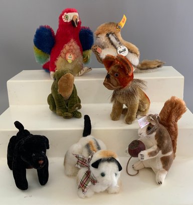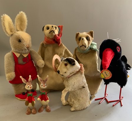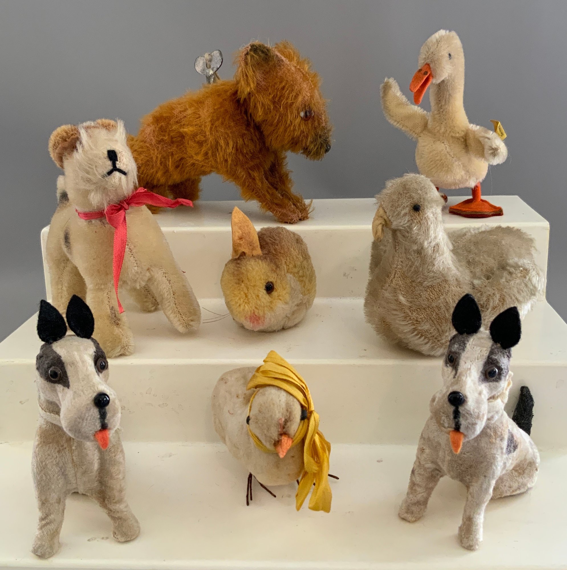 Lot of 20 assorted small animals, fur covered dogs, finger puppets, wind up mohair dogs (as is), & 9 Steiff animals