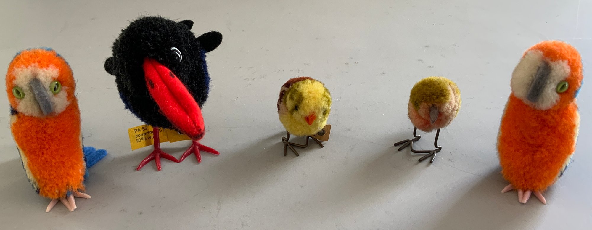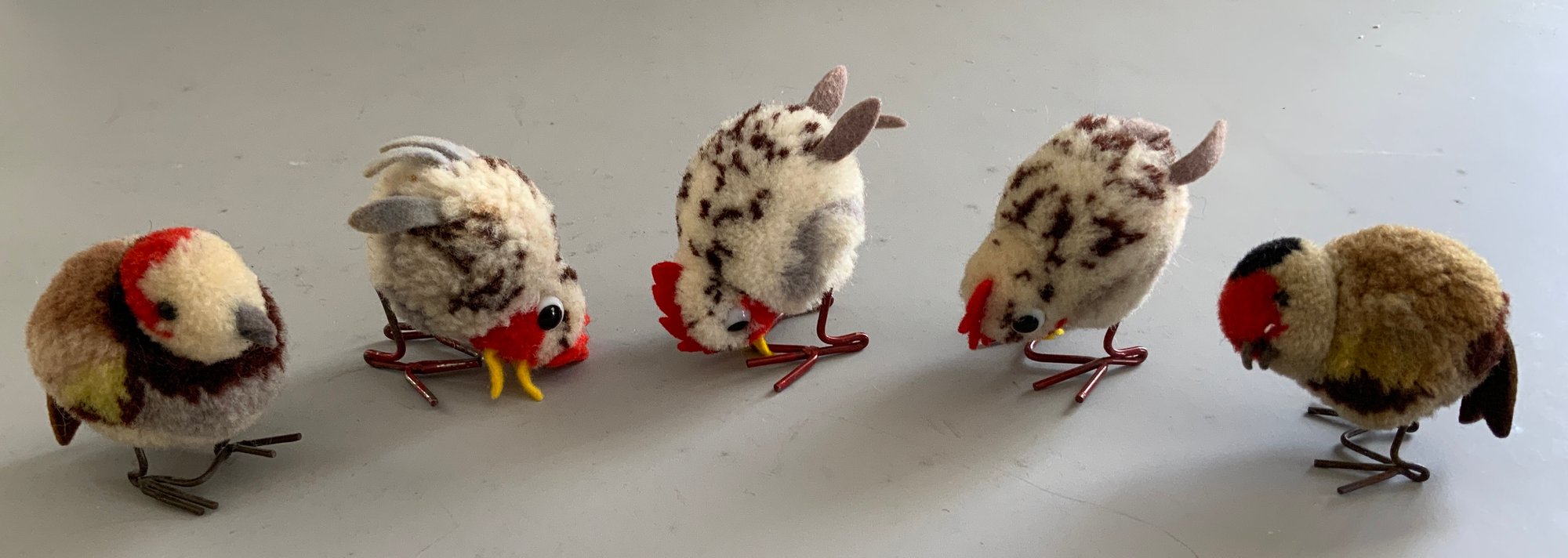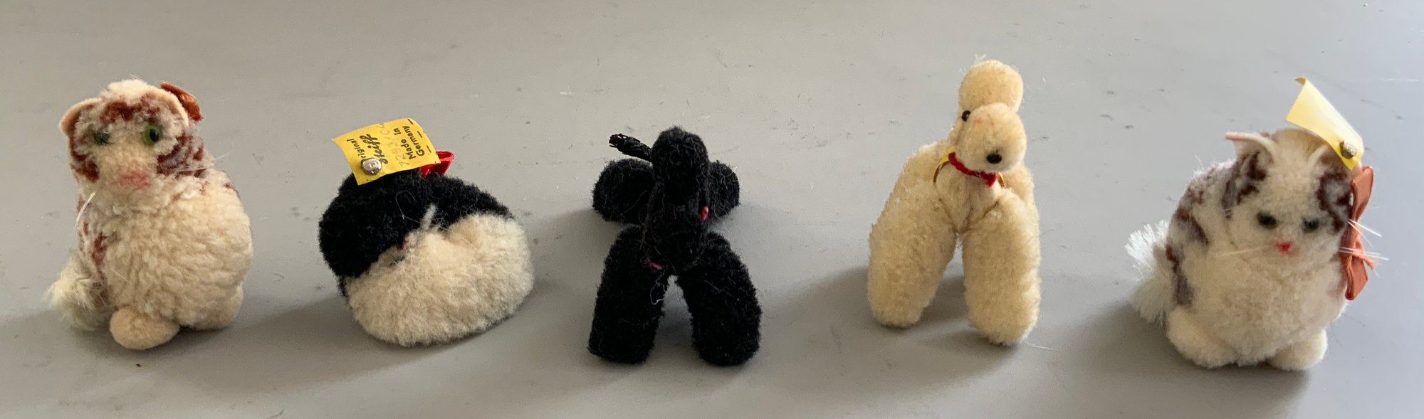Lot of 22 small Steiff Woolies, birds, chickens, dogs, etc. 1” – 3”