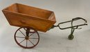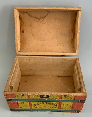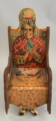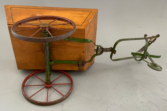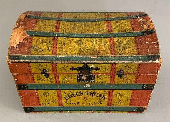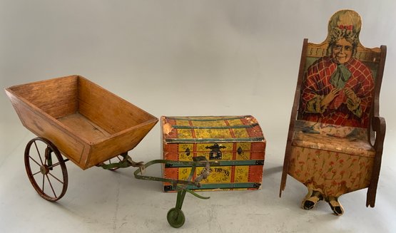 Lot of 3, 12 ½” tall Bliss type paper covered dolls chair (was a rocker) 1895 in pencil on back (some damage), 7” paper covered labeled “Dolls Trunk” (some paper loss), & 1 – 8 ½” long 2 wheel wood pony cart with metal harness