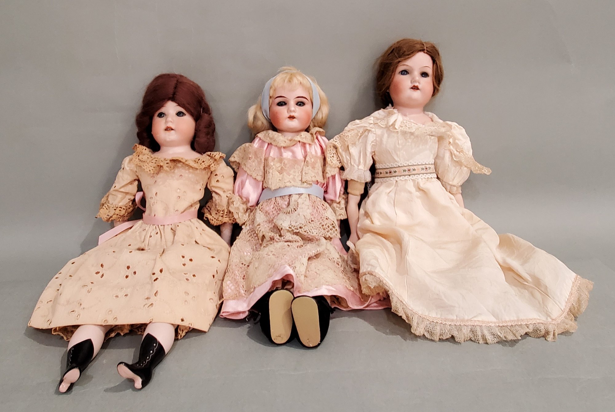 LOT OF 3 ANTIQUE BISQUE SHOULDER HEAD DOLLS - 1- 16 1/2" ERNST HEUBACH MOLD 275, CLOTH BODY W/ BISQUE ARMS & LEGS, VINTAGE MOHAIR WIG, BLUE SLEEP EYES, OPEN MOUTH W/ TEETH, IVORY DRESS, 1- 16" AM RUTH, LEATHER BODY W/ BISQUE LOWER ARMS, ANTIQUE MOHAIR WIG (TIGHTLY GLUED), BLUE SLEEP EYES, OPEN MOUTH W/ TEETH, PINK DRESS, 1- 17" AM 370, CLOTH BODY W/ BISQUE ARMS & LEGS, ANTIQUE HUMAN HAIR WIG (TIGHTLY GLUED), BLUE SLEEP EYES, OPEN MOUTH W/ TEETH, IVORY DRESS
