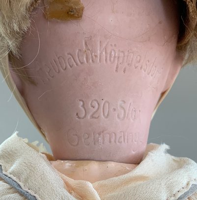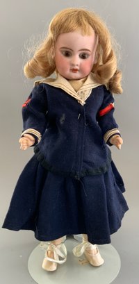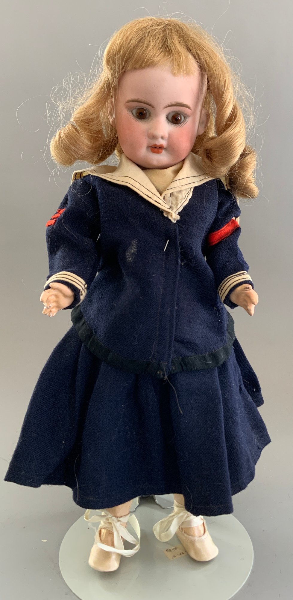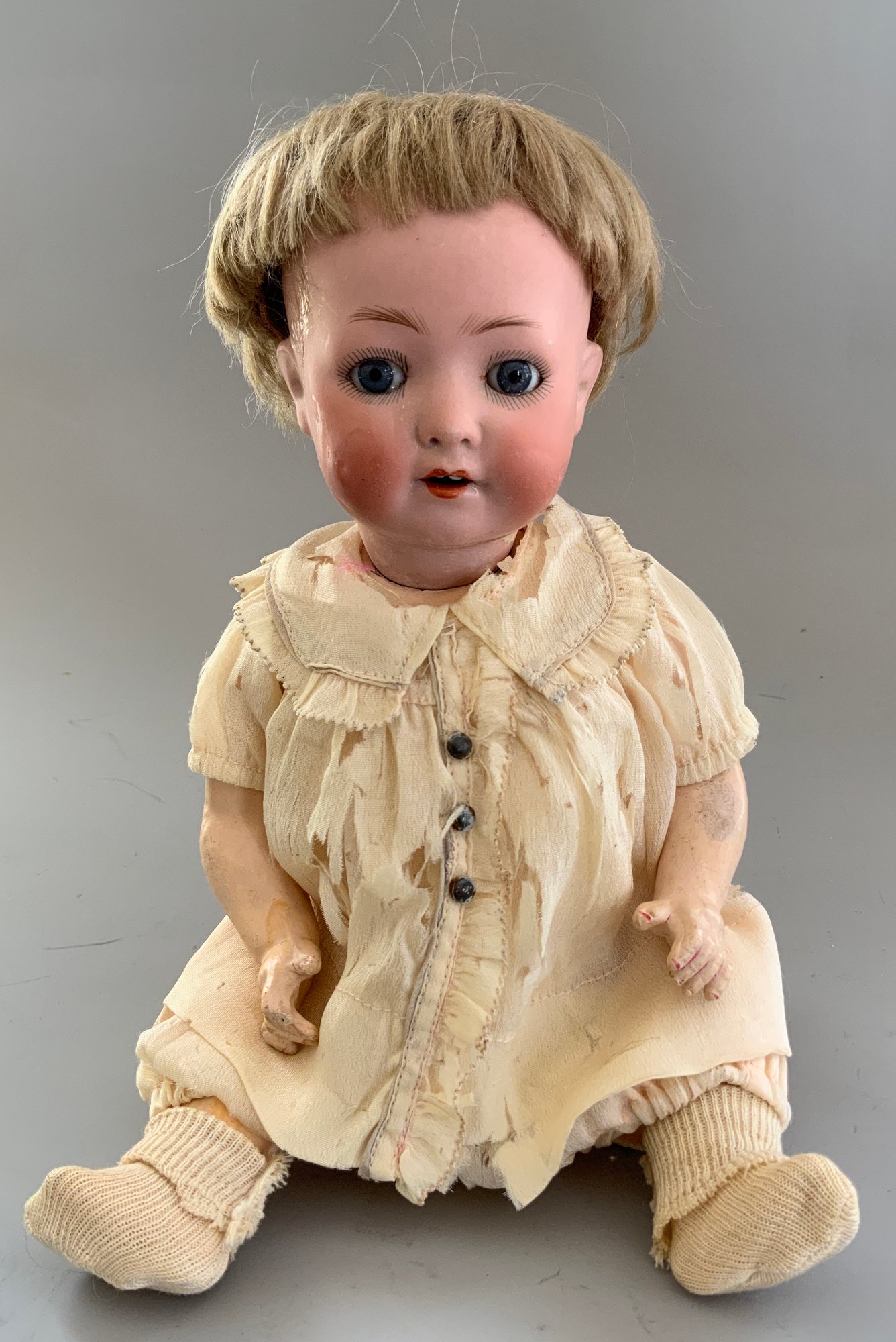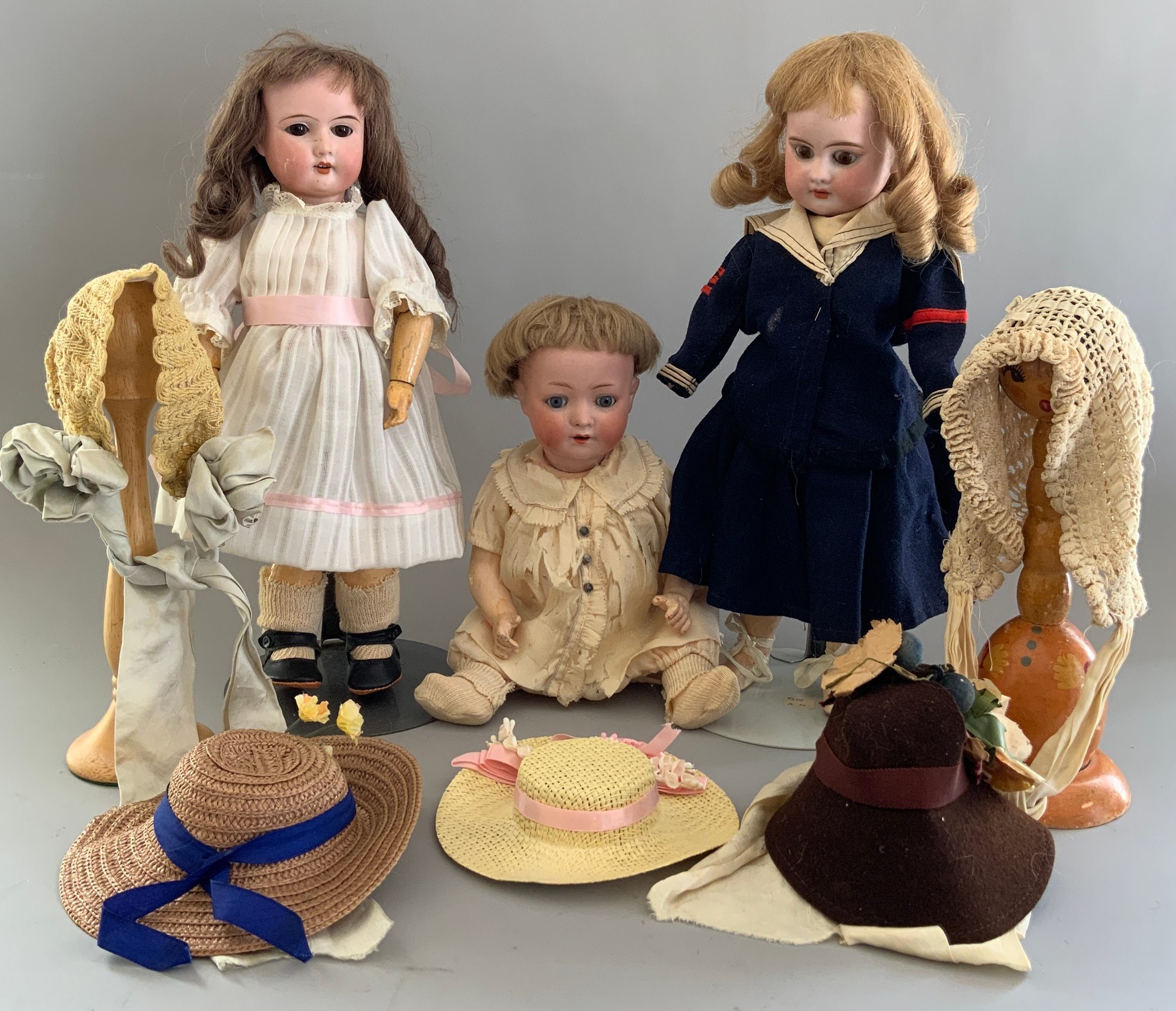 Lot of 3 – Bisque dolls, 1 – 15” Germany 1, brown glass eyes (chip upper right lid), OM with teeth, blonde wig, straight leg 5pc compo body with G on thigh, blue wool sailor suite, 1 – 13 ½” Floradora A 2/0M, brown glass sleep eyes, OM with teeth, brown synthetic wig, BJCB, white dress (excessive wig glue), & 1 – 13” Baby Heubach Koppelsdorf 320.5/0, blue glass eyes (sleep not working), blonde mohair wig, OM with teeth, baby compo body, silk white dress (melting, excessive wig glue, glaze over face)