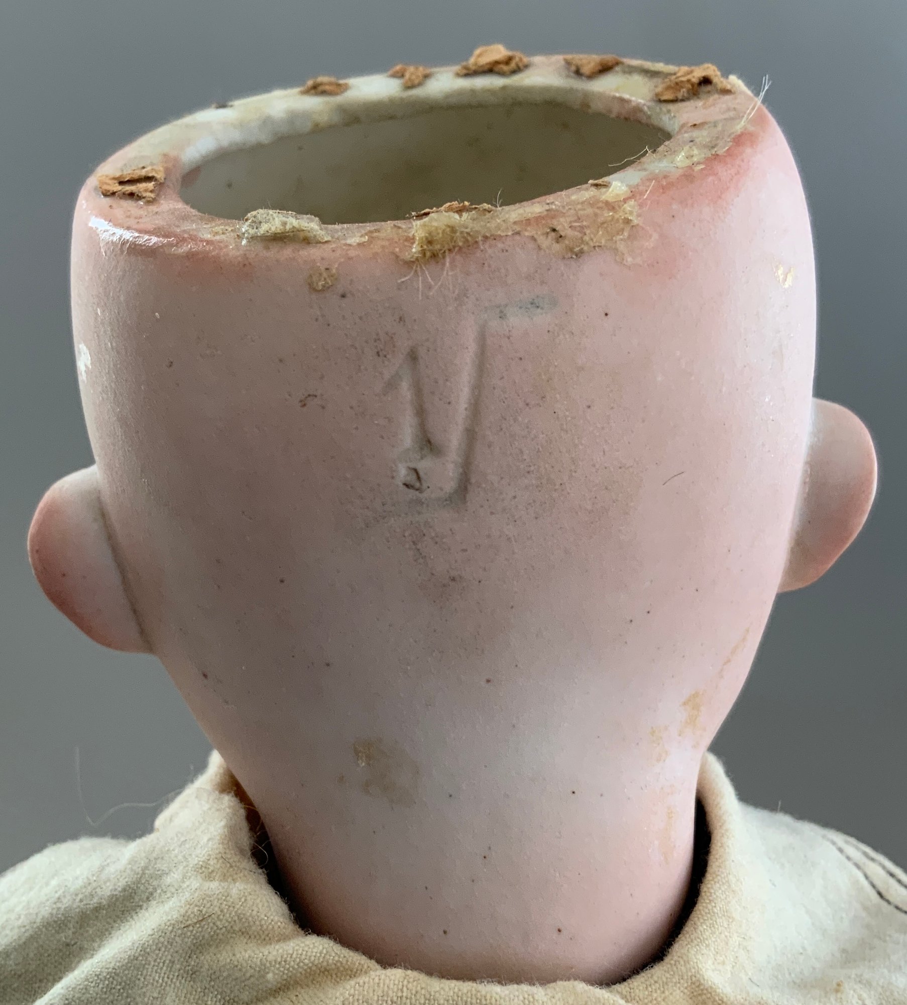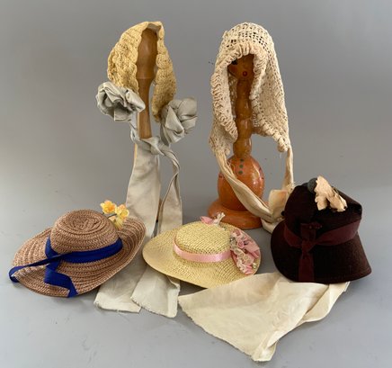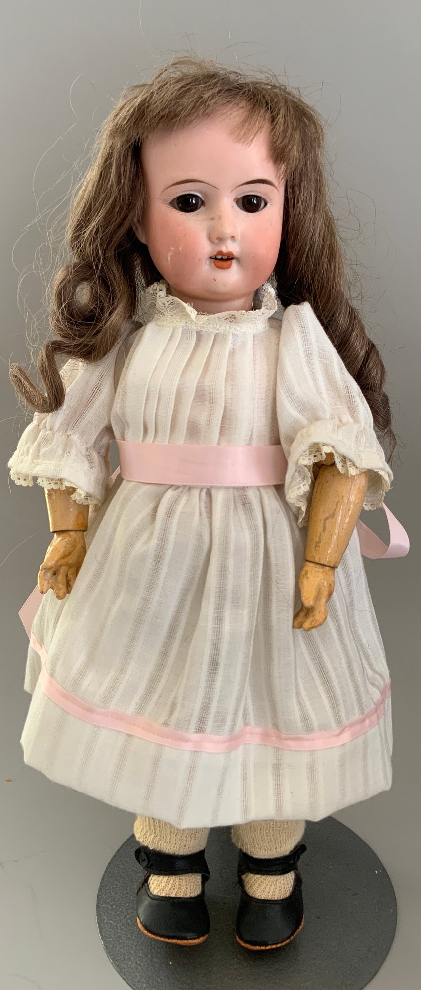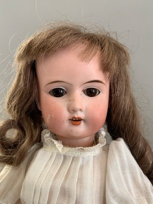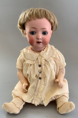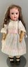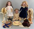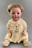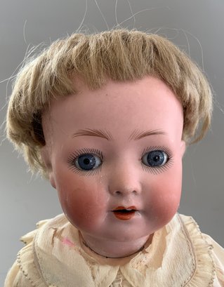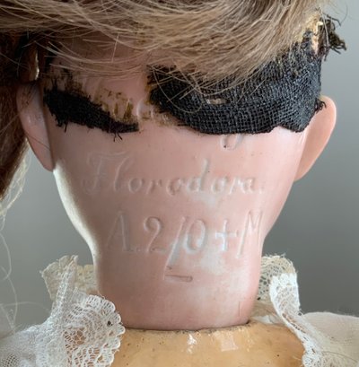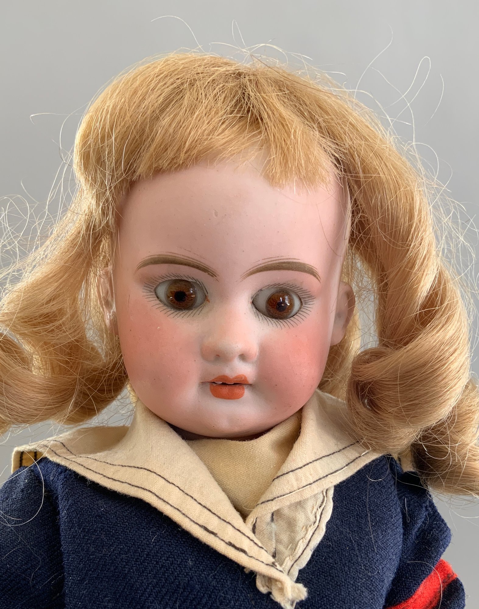 Lot of 3 – Bisque dolls, 1 – 15” Germany 1, brown glass eyes (chip upper right lid), OM with teeth, blonde wig, straight leg 5pc compo body with G on thigh, blue wool sailor suite, 1 – 13 ½” Floradora A 2/0M, brown glass sleep eyes, OM with teeth, brown synthetic wig, BJCB, white dress (excessive wig glue), & 1 – 13” Baby Heubach Koppelsdorf 320.5/0, blue glass eyes (sleep not working), blonde mohair wig, OM with teeth, baby compo body, silk white dress (melting, excessive wig glue, glaze over face)